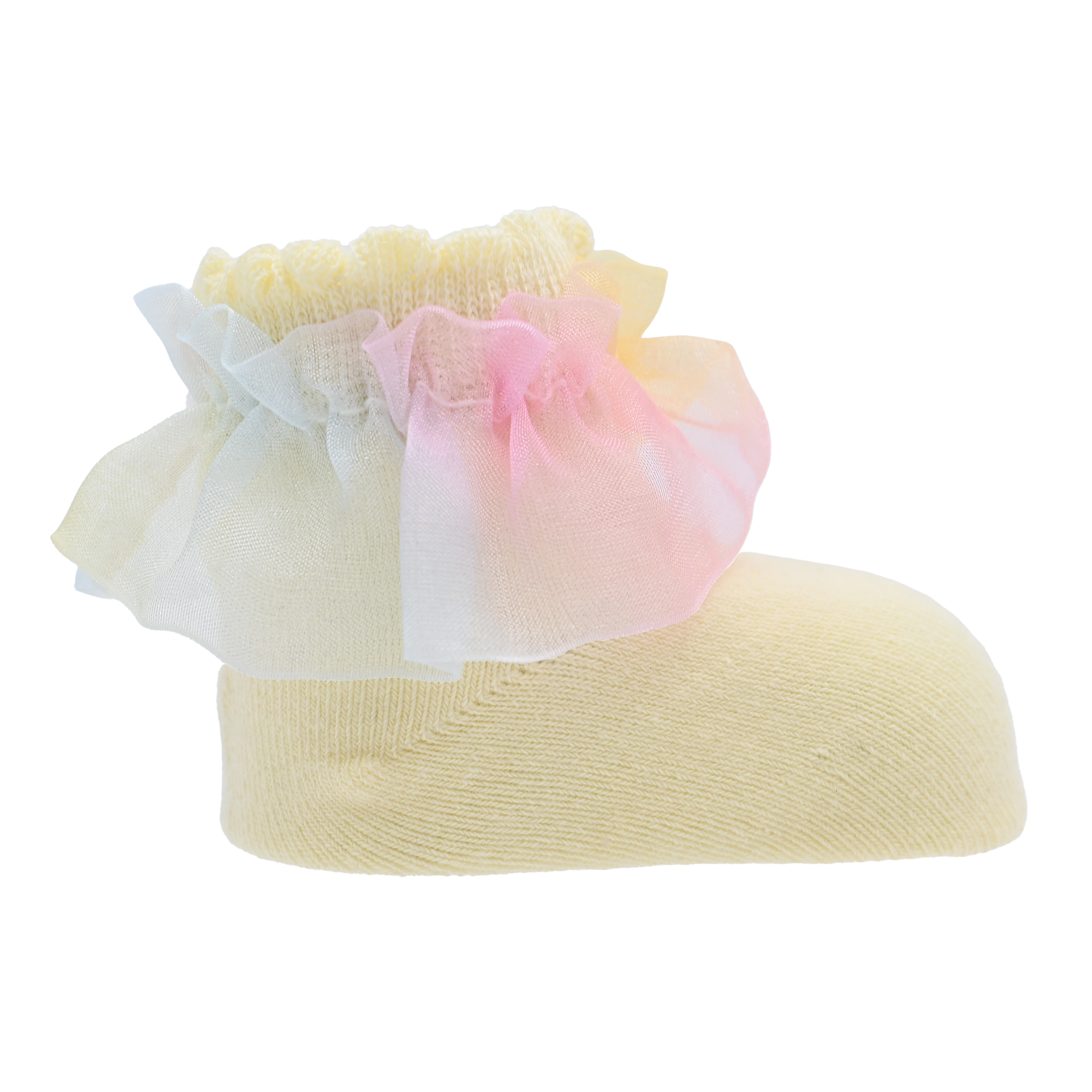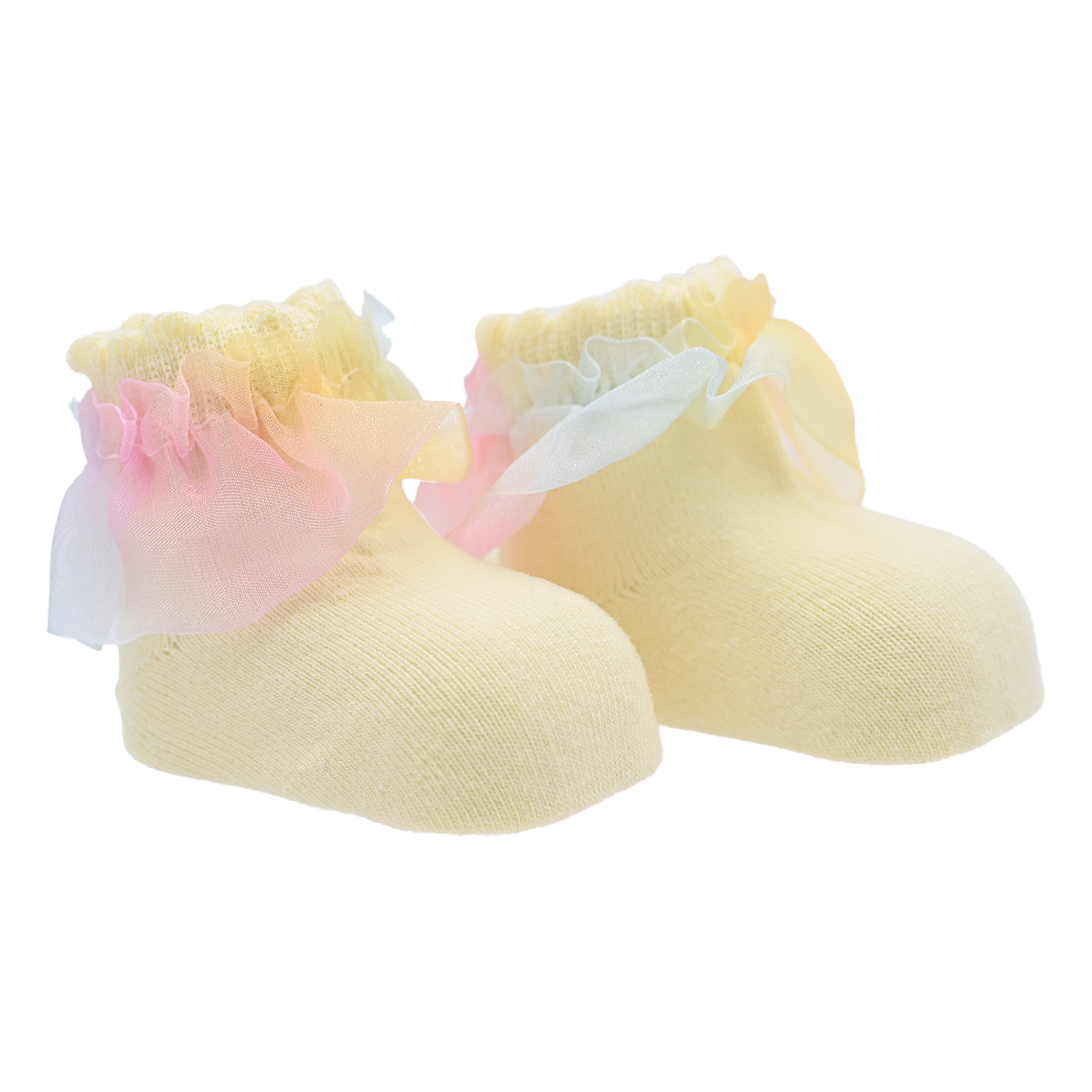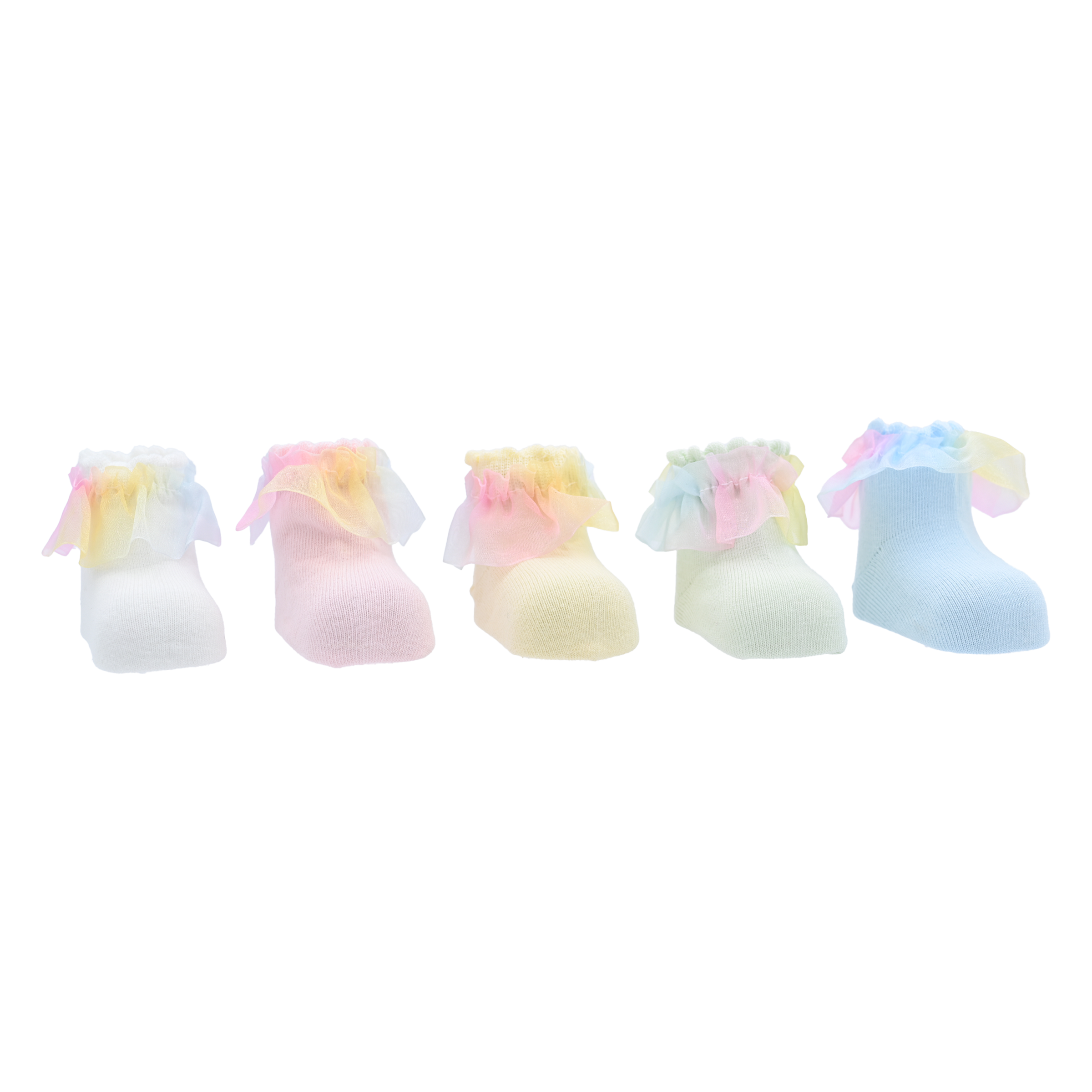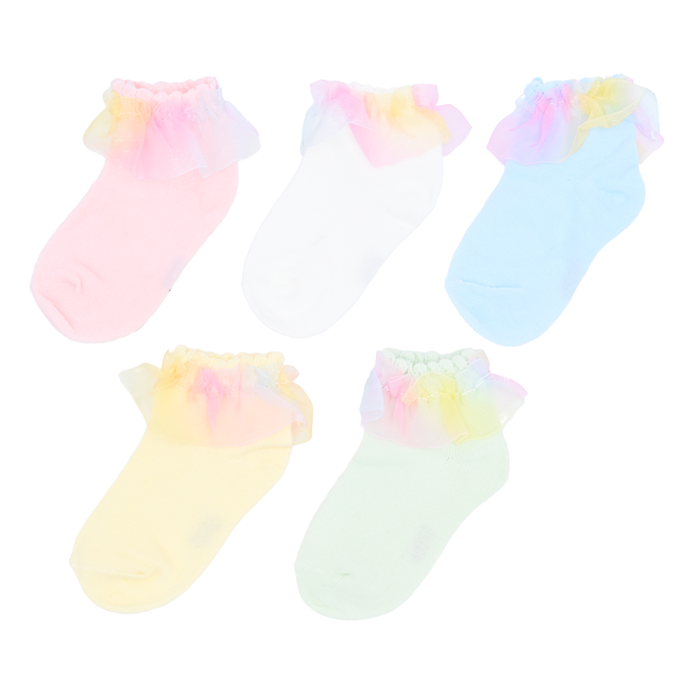 This set of five pairs features a delightful selection of pastel hues, including yellow, pink, green, blue, and white, offering plenty of mix-and-match possibilities. Each pair is finished with a charming rainbow-colored ruffle, bringing a fun and colorful accent to their design.