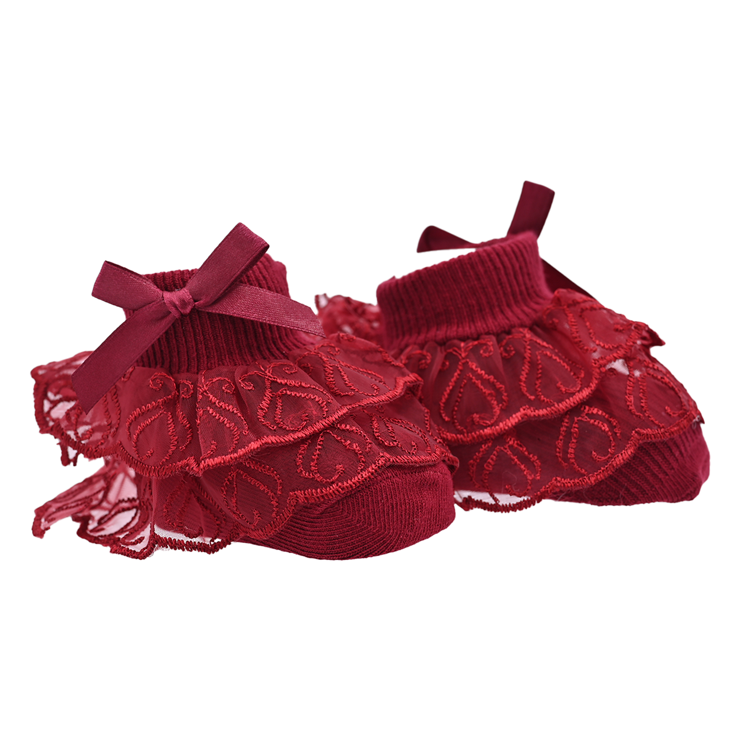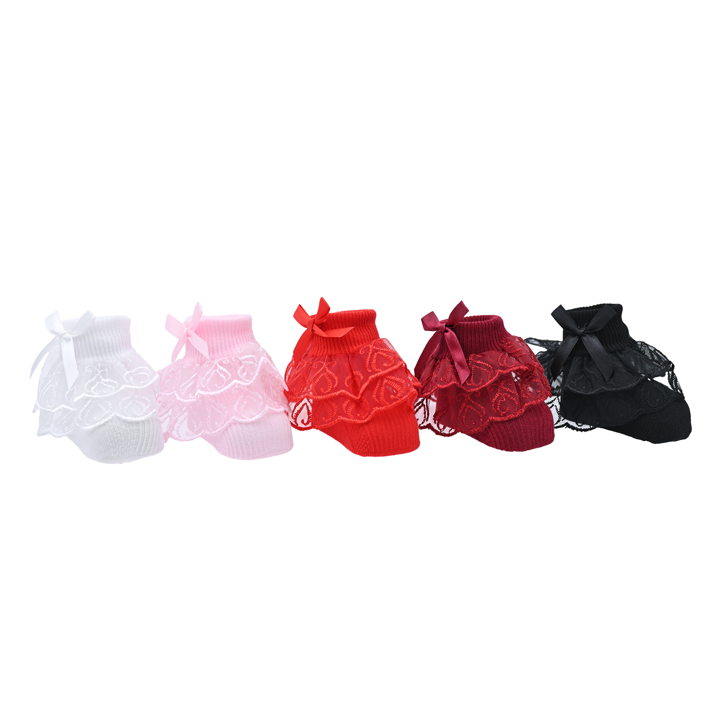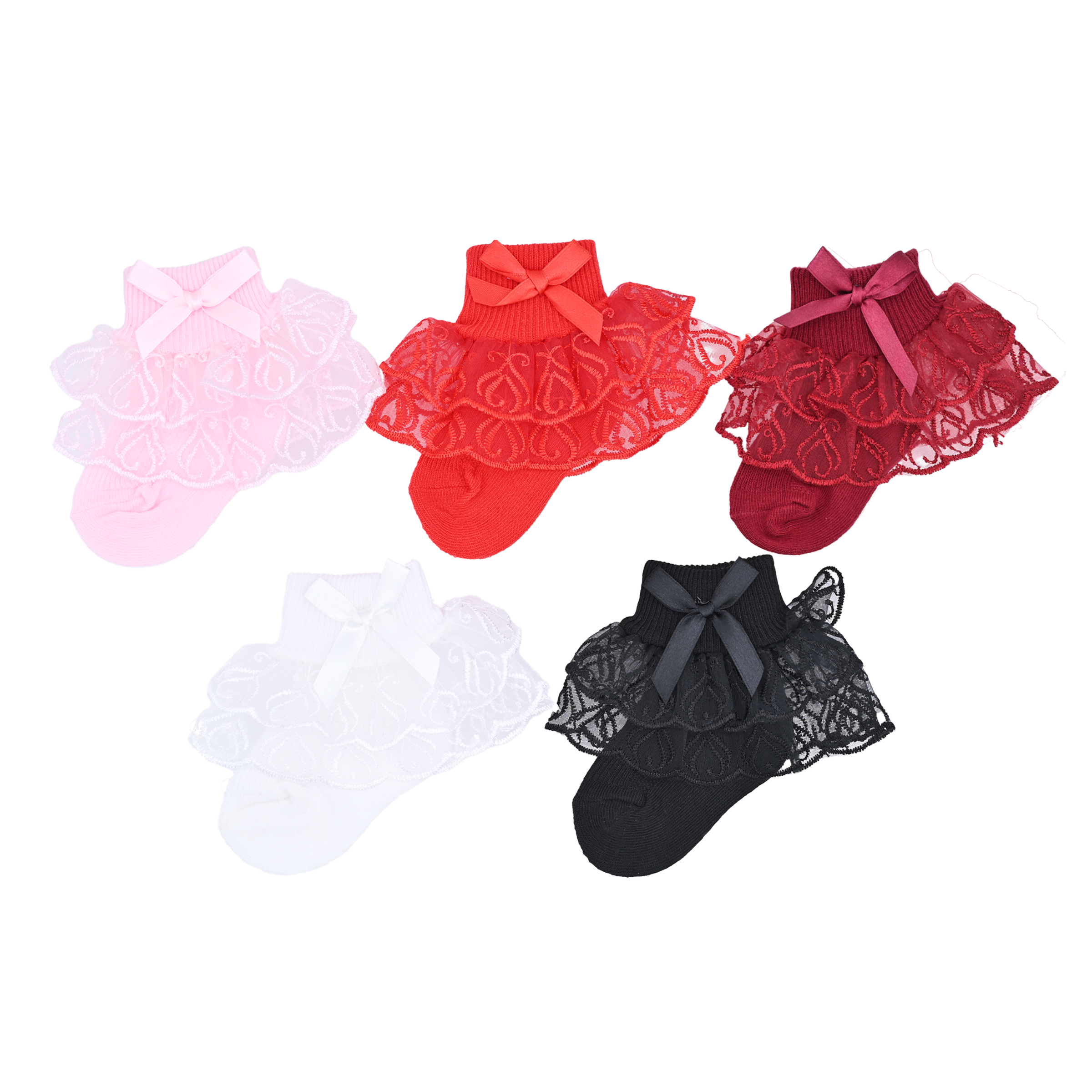 This set of five pairs comes in a stunning color selection of red, white, burgundy, pink, and black, providing plenty of options to complement any wardrobe. Each pair is adorned with a layered trim around the ankle and finished with a dainty ribbon bow accent, creating a playful yet sophisticated look.