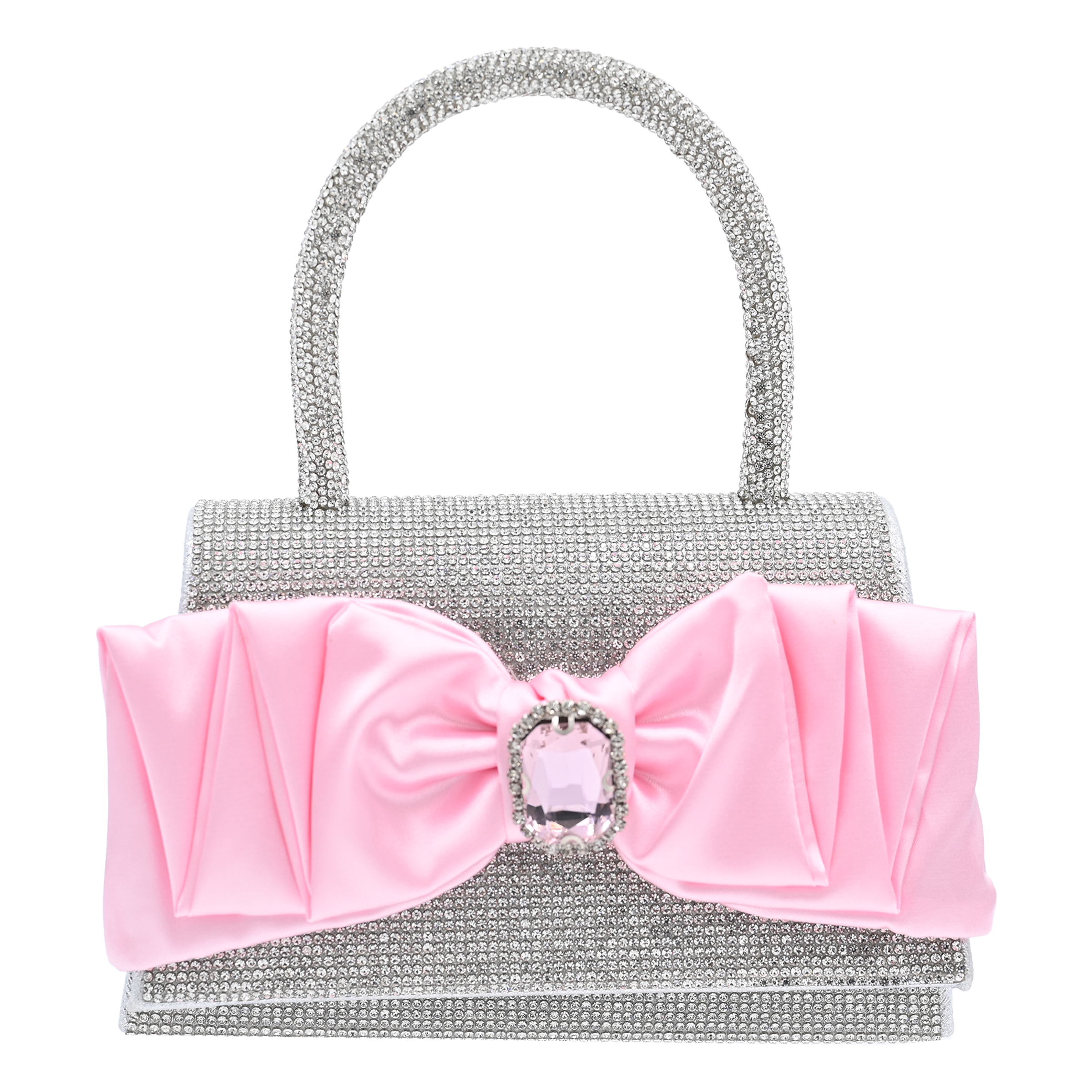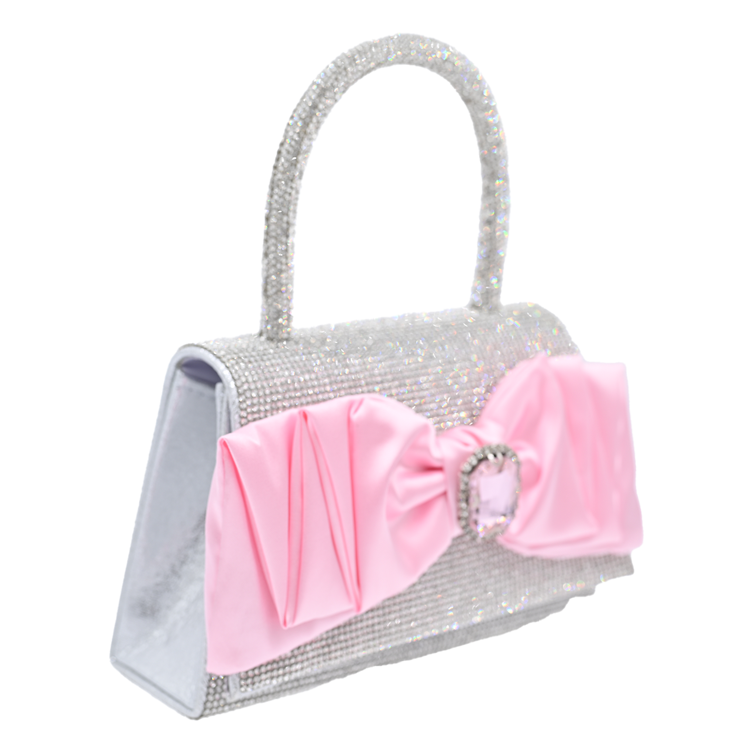 The Pink Bow Accented Silver Rhinestone Handbag by Mimi Tutu combines timeless elegance with playful details, making it an enchanting must-have for young fashionistas.