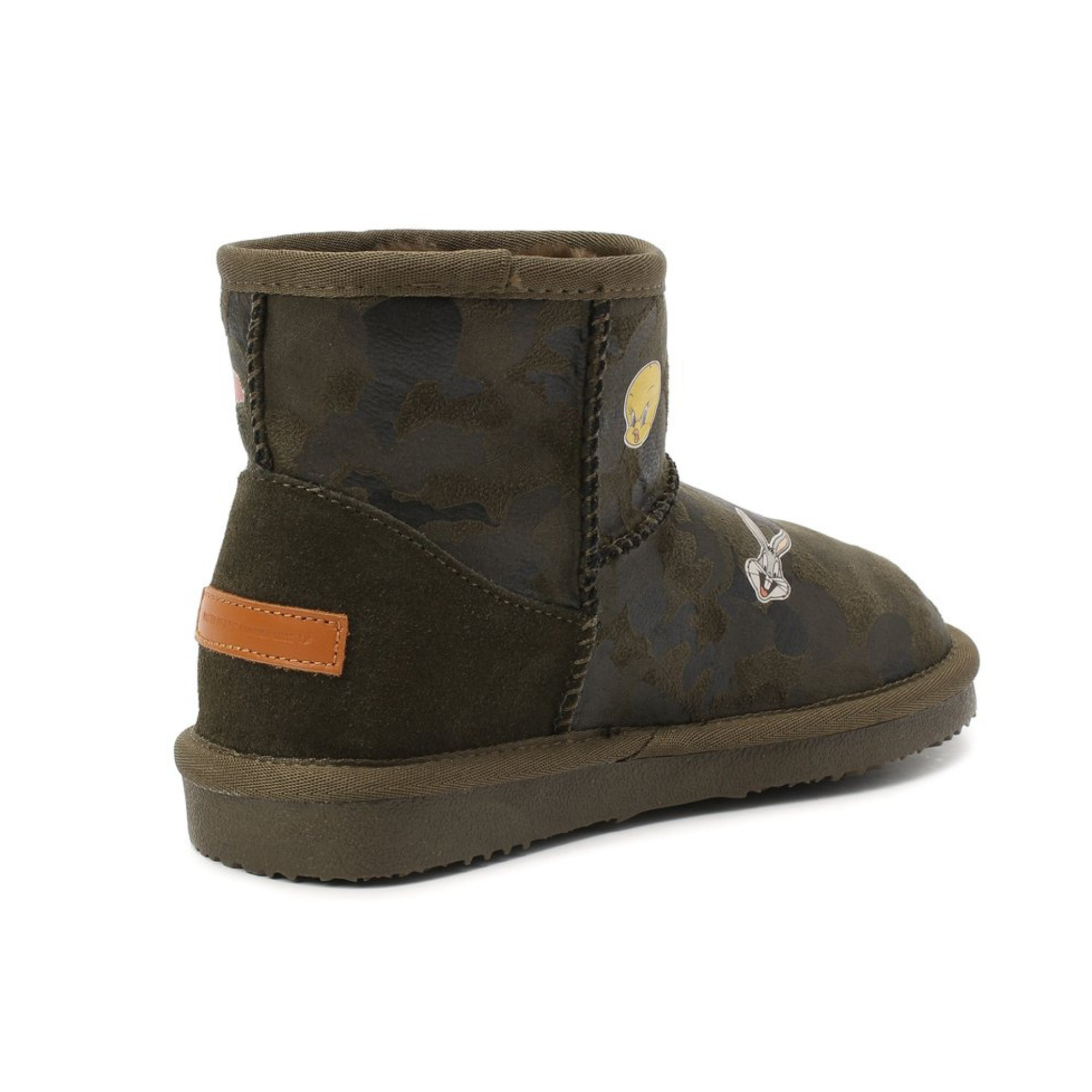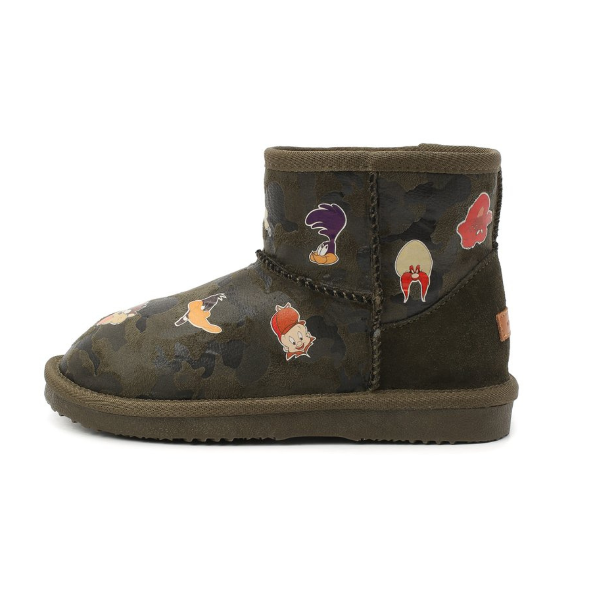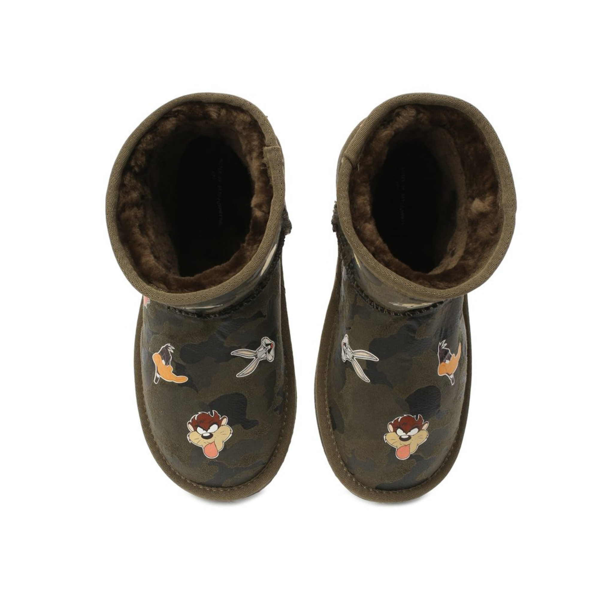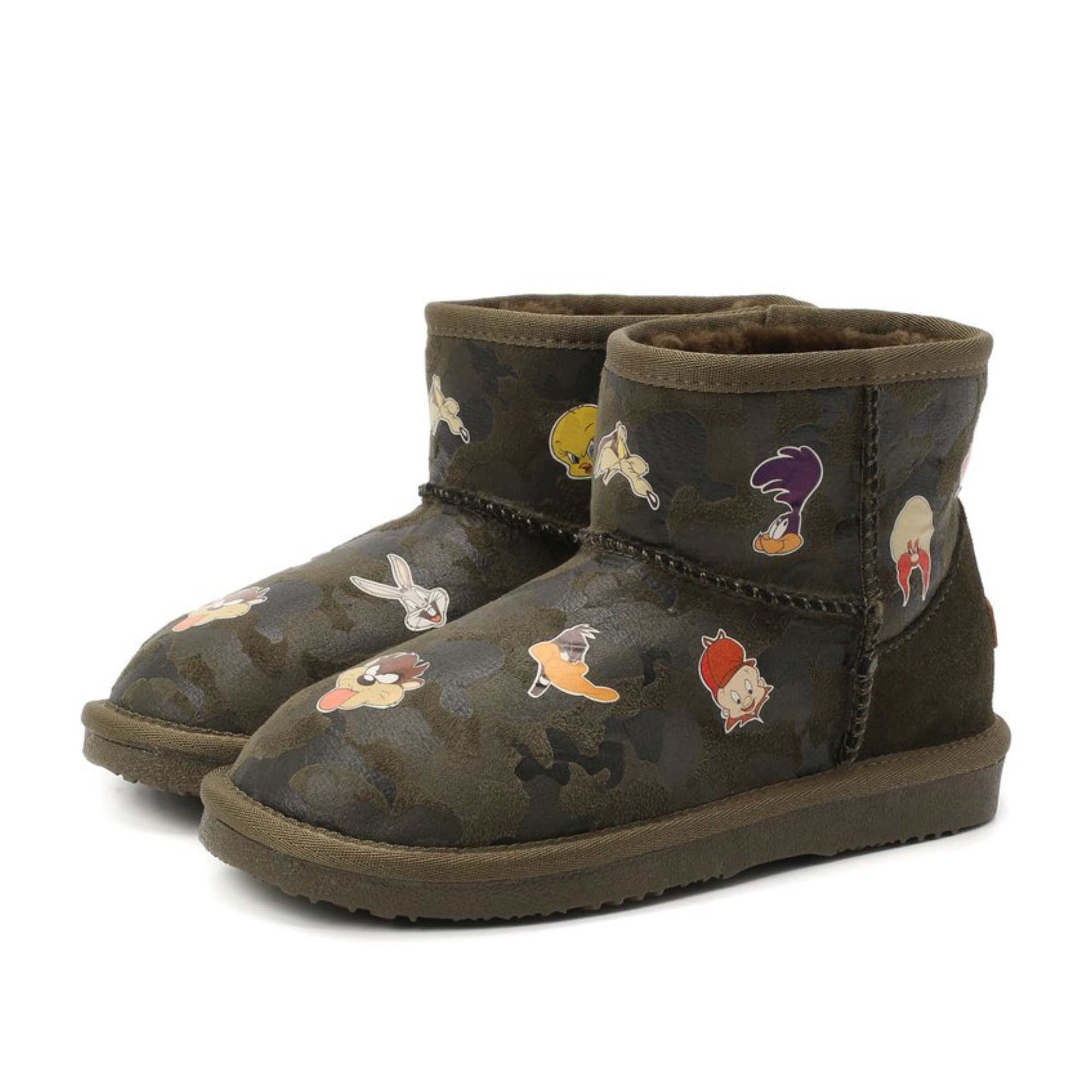 A standout winter boot with cartoon attitude, this camouflage pair is covered in vibrant Looney Tunes patches featuring expressive character faces. The plush lining offers cozy warmth, while the flat sole and short shaft ensure easy wear. Perfect for chilly days and playful styling, they bring a dose of animated fun to everyday outfits.