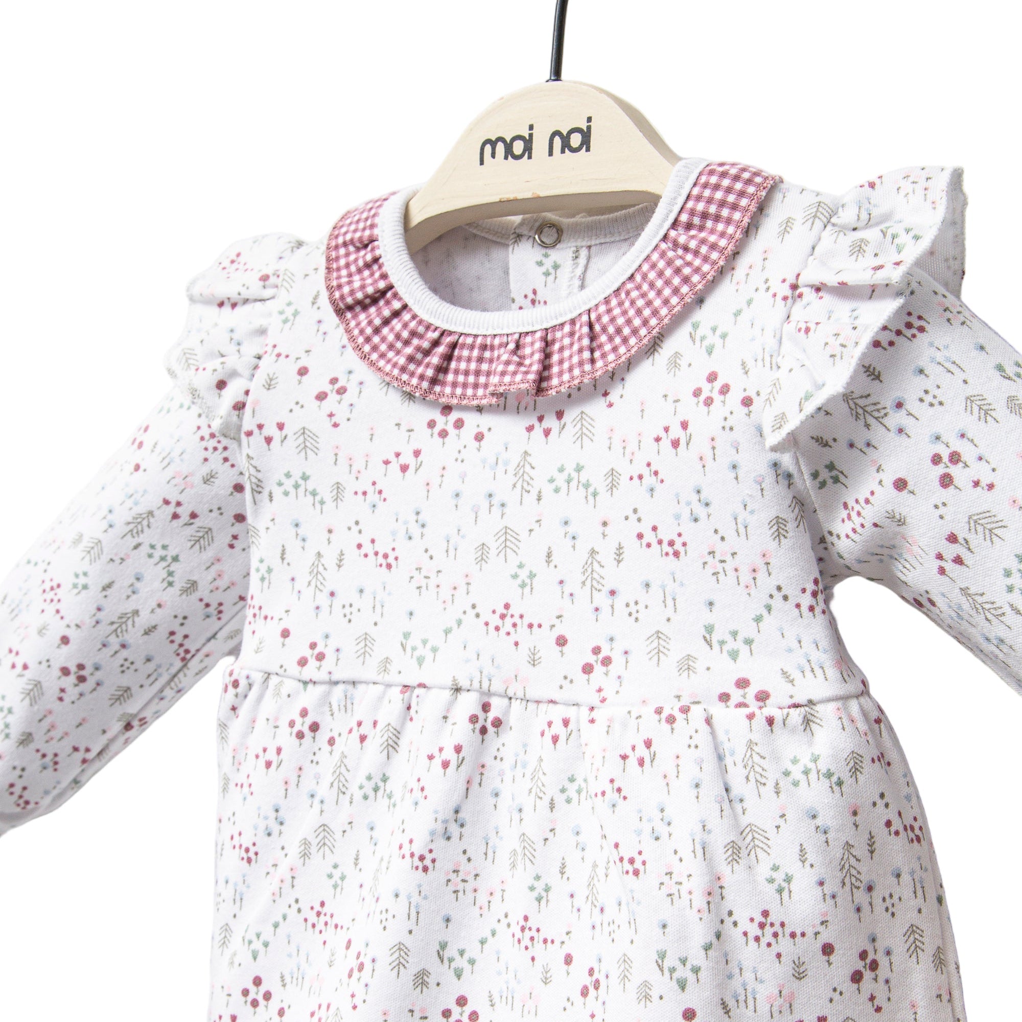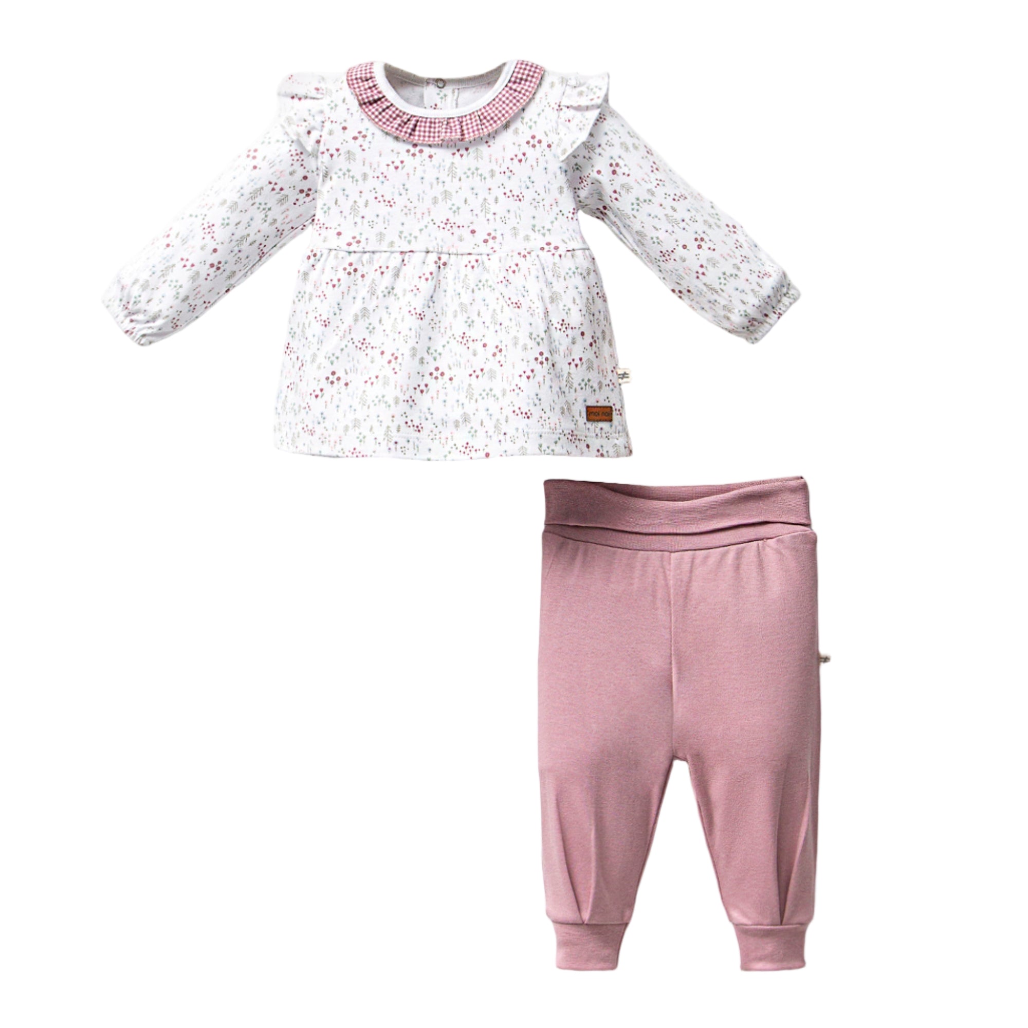 The Pink Flower Neckline Ruffle Outfit radiates delicate charm with its soft pink hue and lovely floral accents along the ruffled neckline. This coordinated set features a comfortable top and matching bottoms, perfect for adding a touch of whimsy to everyday wear or special occasions.