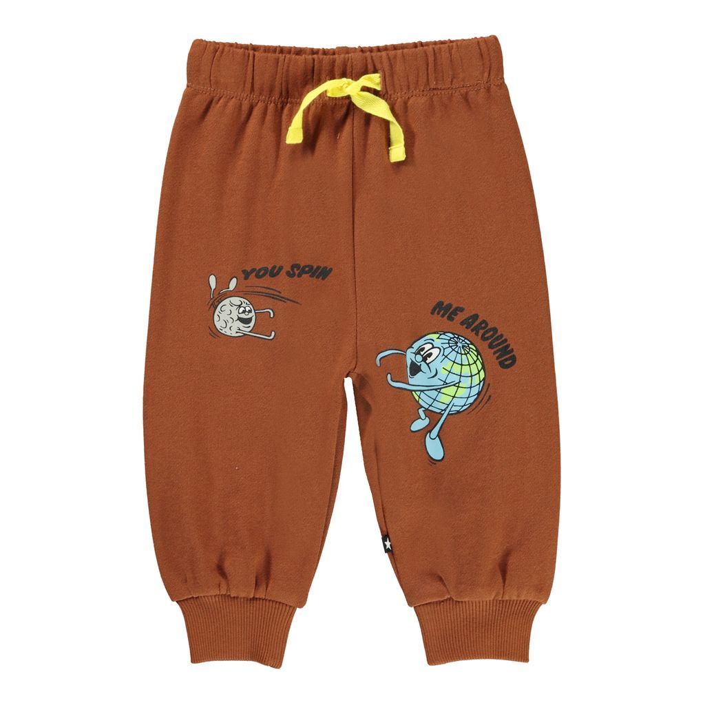 Brown Simeon cotton sweatpants for baby boys from Molo. Simeon is a pair of brown baby sweatpants with a print of Earth and the moon, swinging each other around. They have an elastic waist with ties. This Molo product is GOTS certified organic, which means that it is made with certified organic materials and produced under the strictest social and environmental standards throughout the entire manufacturing process. In addition, the GOTS certification secures that the product is free of hazardous chemicals. This Molo product is GOTS certified organic by Ecocert Greenlife, certification number 197496.