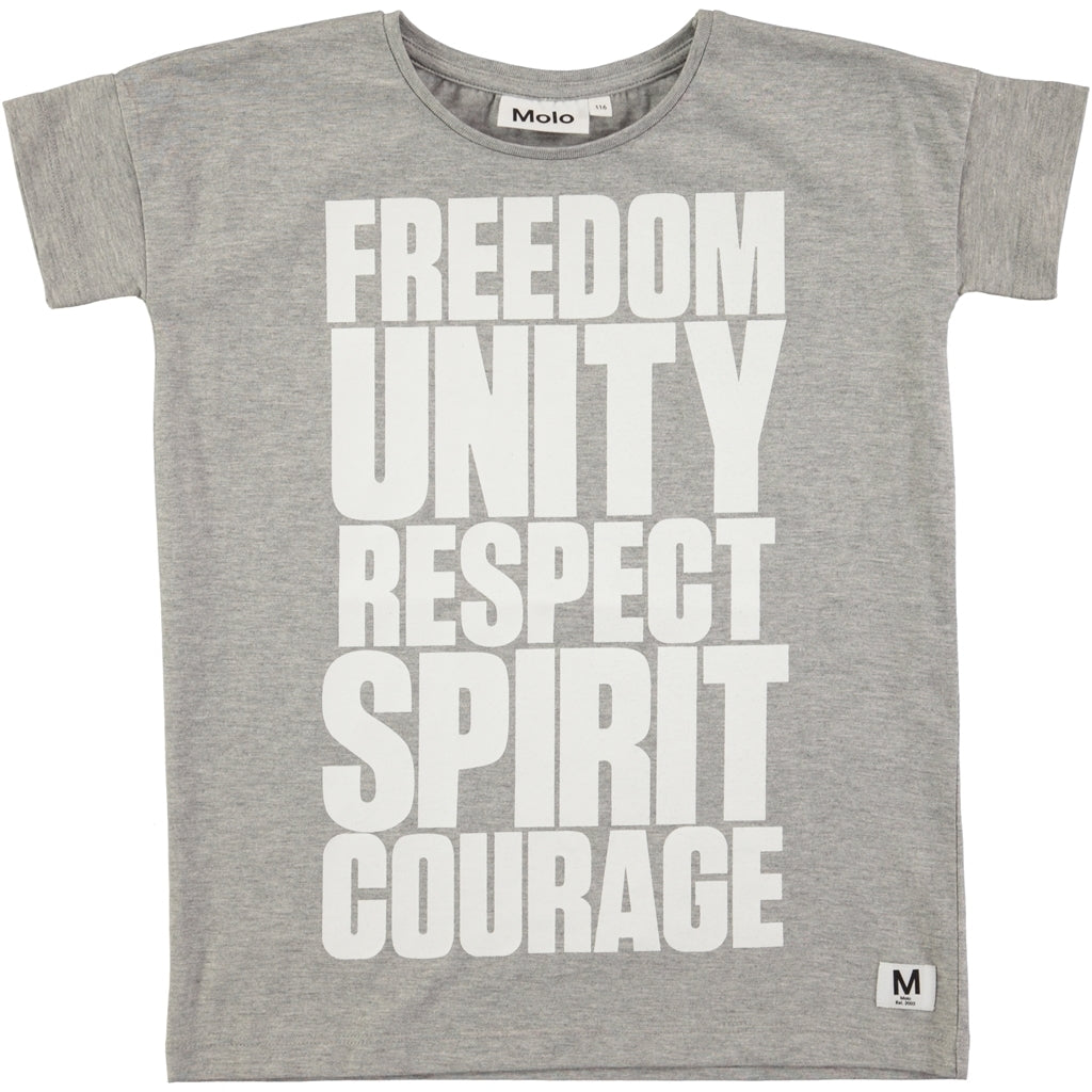 Grey Melange T-Shirt is a statement in both comfort and character. Featuring a vertical print of empowering words—FREEDOM, UNITY, RESPECT, SPIRIT, COURAGE—this tee encourages self-expression while offering a relaxed fit in soft, speckled cotton. Ideal for everyday wear with a meaningful twist.
