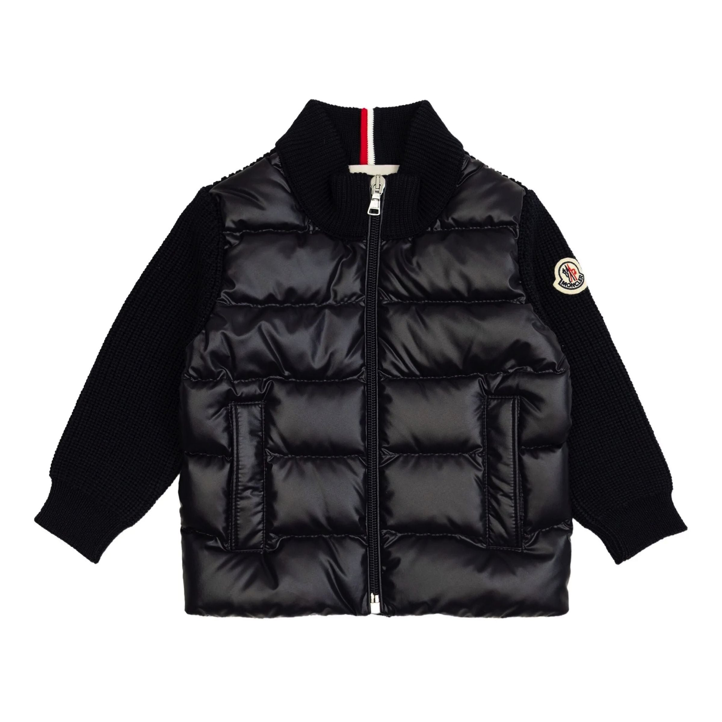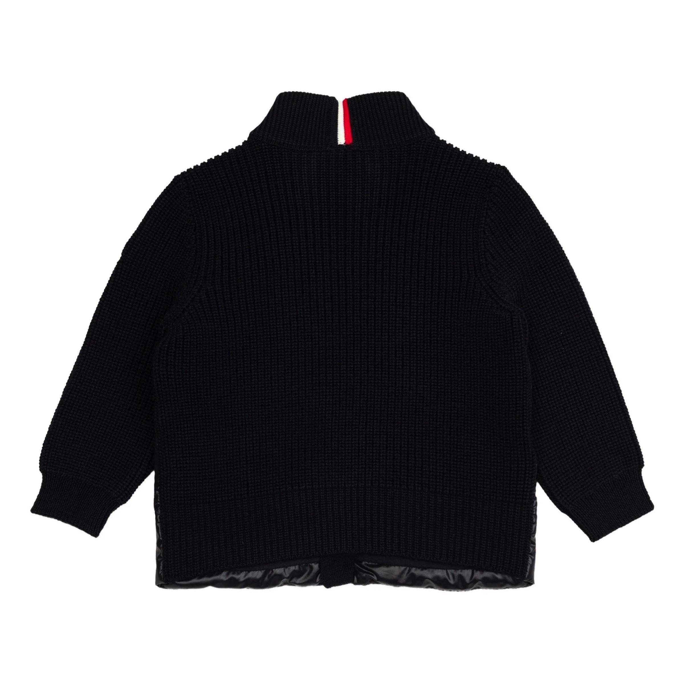 Enhanced with a warm, down-filled front, this zip-up cardigan is a cozy companion for strolls or playdates. The plush knit is crafted from ultra-fine Merino wool, while a soft cotton jersey lining ensures all-day comfort. A subtle tricolour trim adds a signature touch of brand DNA.