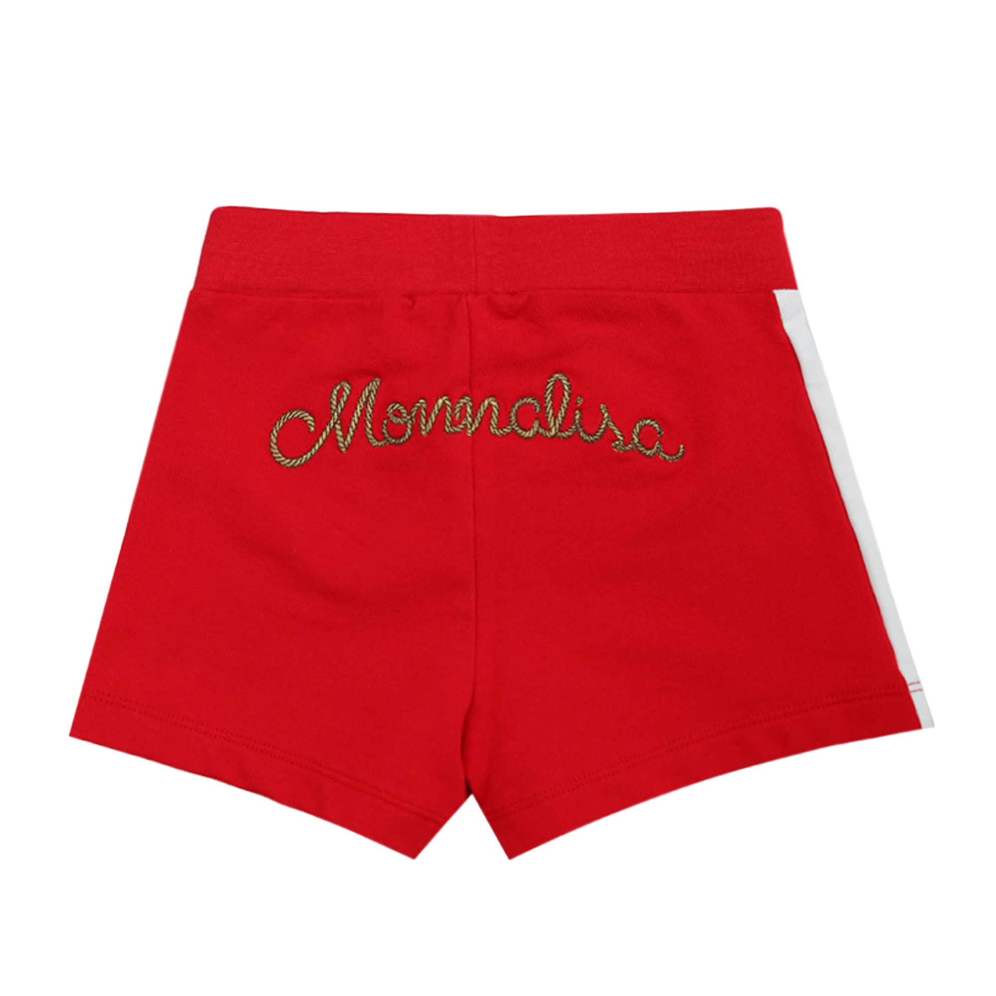 Bold and comfortable, these red fleece shorts are a sporty staple with a luxe twist. Featuring a gold Monnalisa logo embroidered across the back waistband and a contrast white side stripe, they blend casual ease with standout detailing. Perfect for active days or relaxed styling.