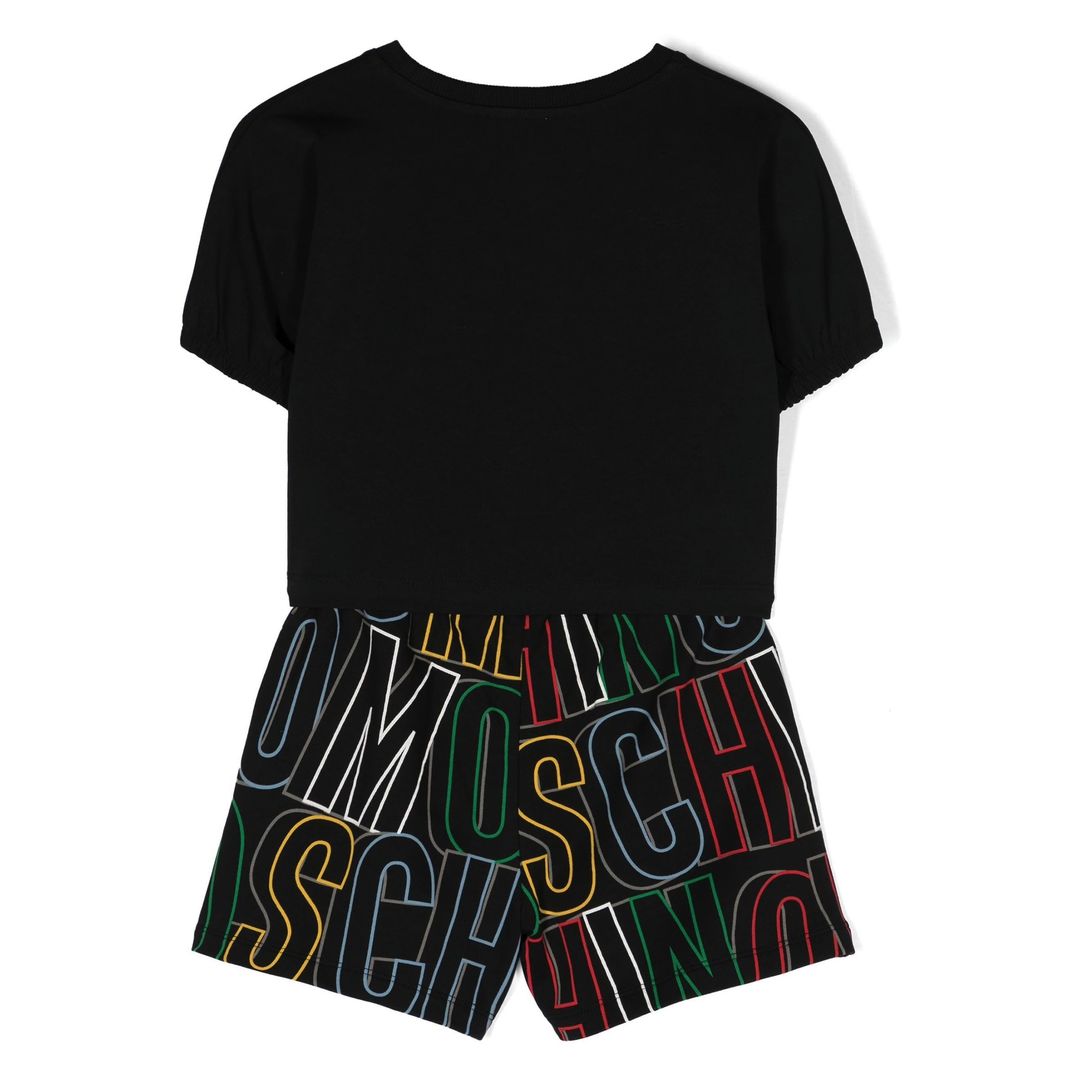 This Moschino shorts set in black offers a dynamic blend of comfort and contemporary style. Crafted from stretch-cotton with a jersey texture, the T-shirt features a vibrant logo print on the front, complemented by a crew neck and elasticated cuffs for a tailored fit. The matching shorts, adorned with an all-over logo print, boast an elasticated waistband and practical side slit pockets, ensuring both functionality and fashion-forward appeal. Ideal for casual outings or lounging in style, this set embodies Moschino's signature flair with a versatile monochrome palette and playful design elements.