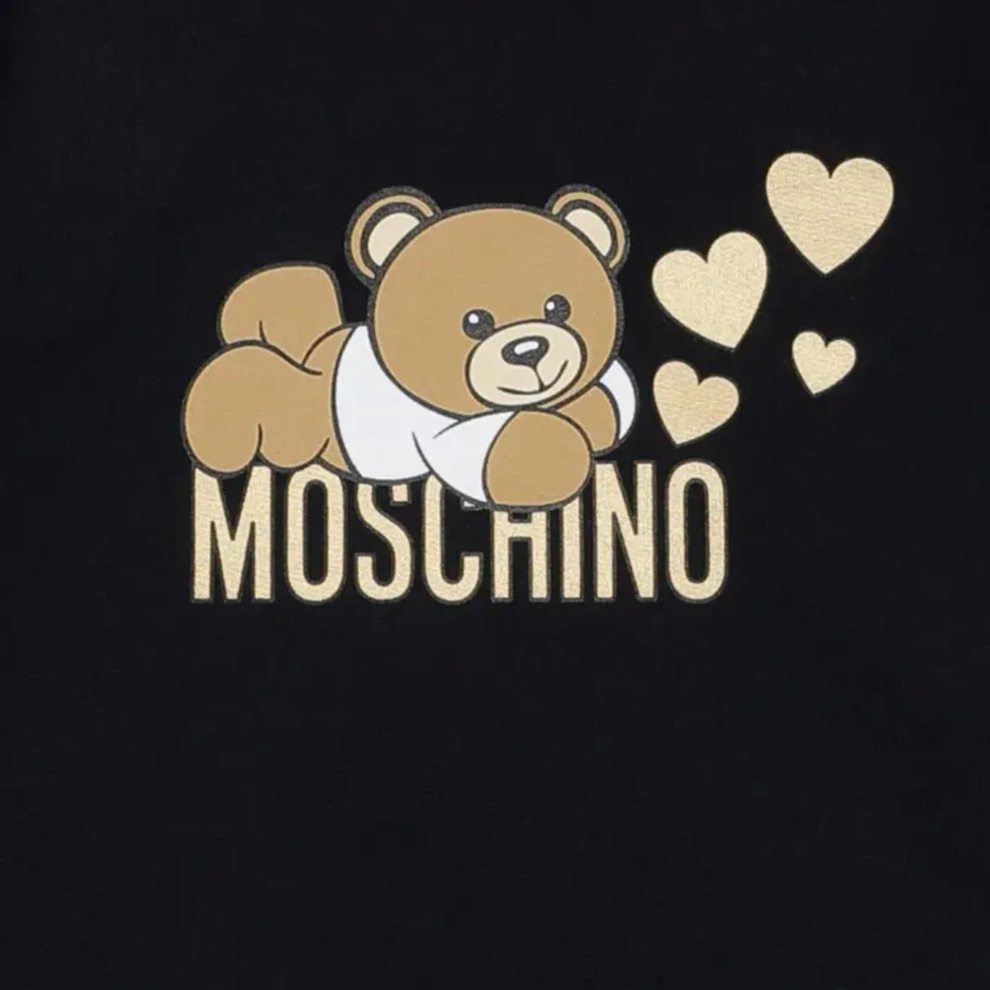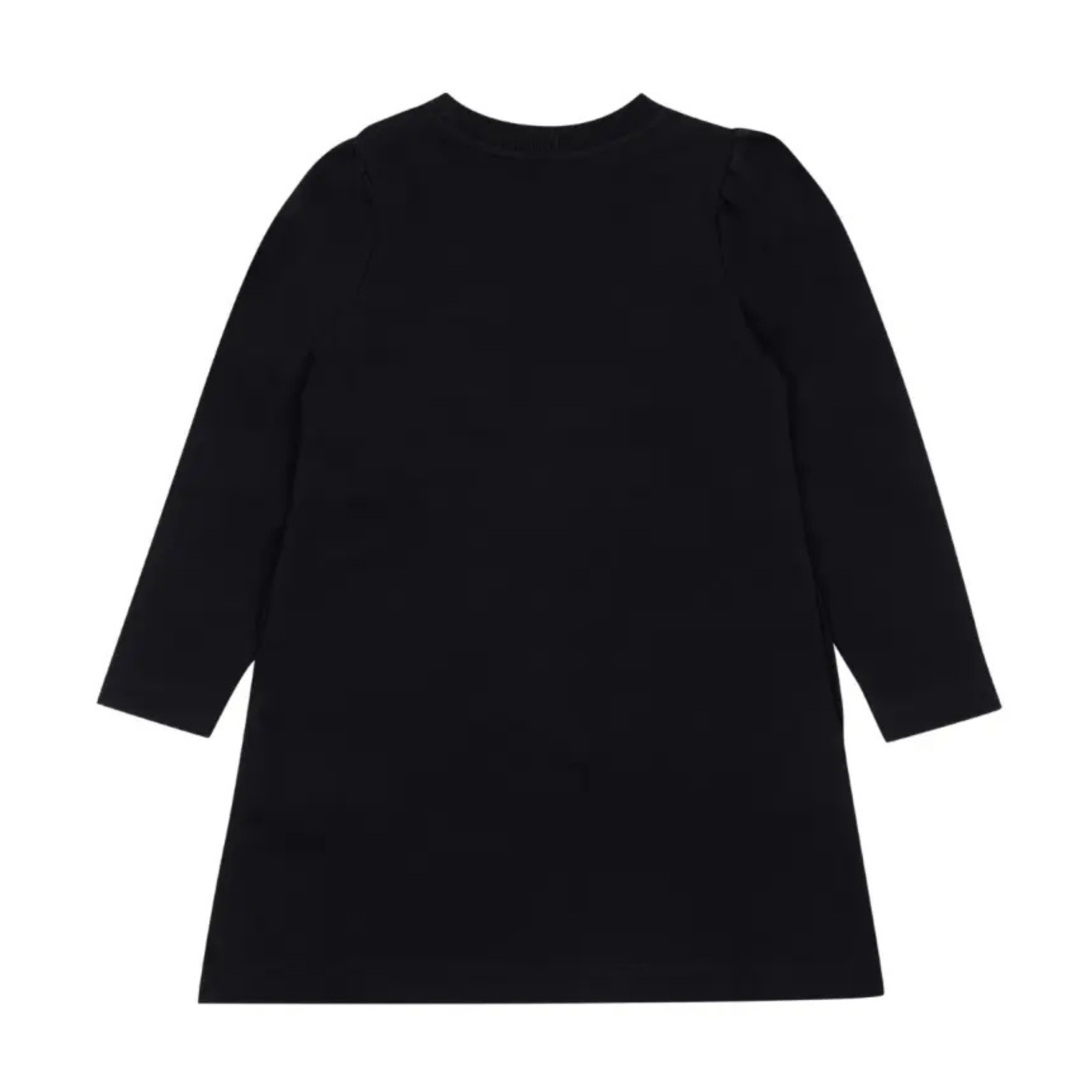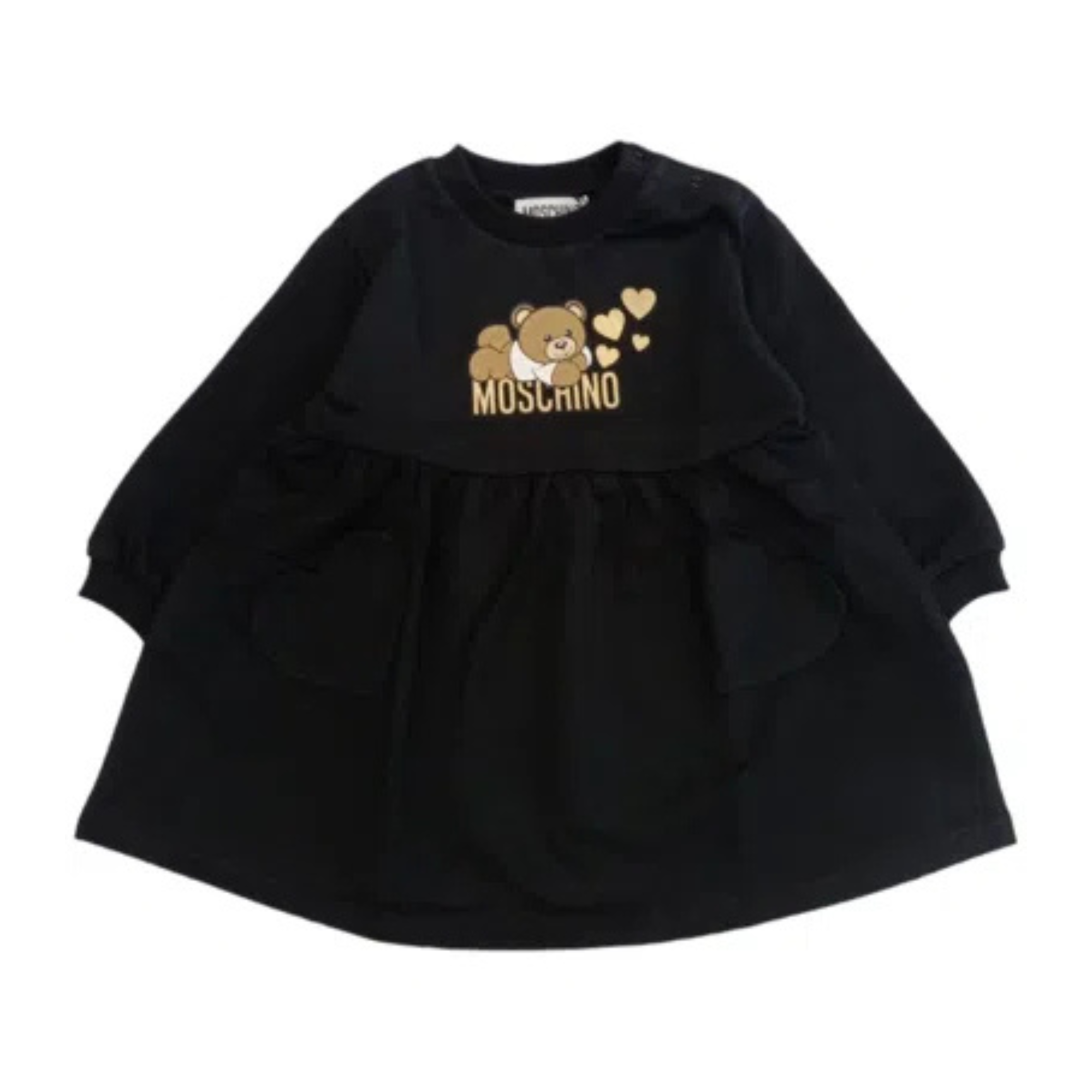 Black Front Logo Dress brings signature charm to everyday dressing. Featuring the iconic teddy bear motif surrounded by golden hearts, this long-sleeve silhouette is crafted in soft cotton with a gathered waist and flared skirt. Front pockets add a practical touch to this standout piece.