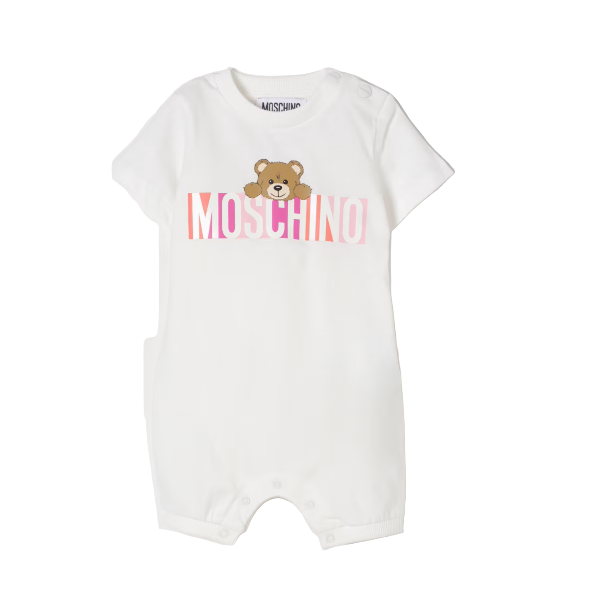 - White base with multicolored Moschino logo and teddy bear graphic