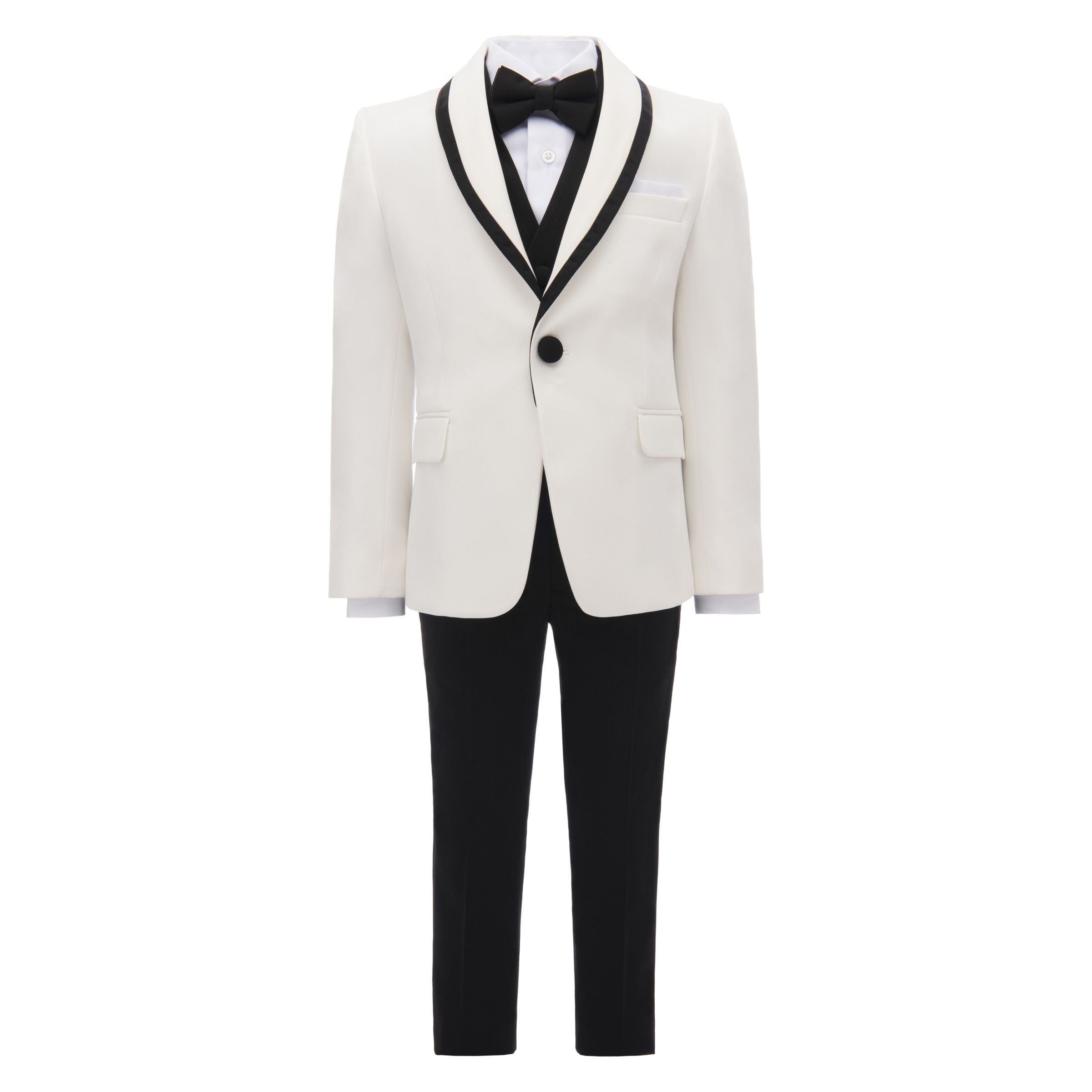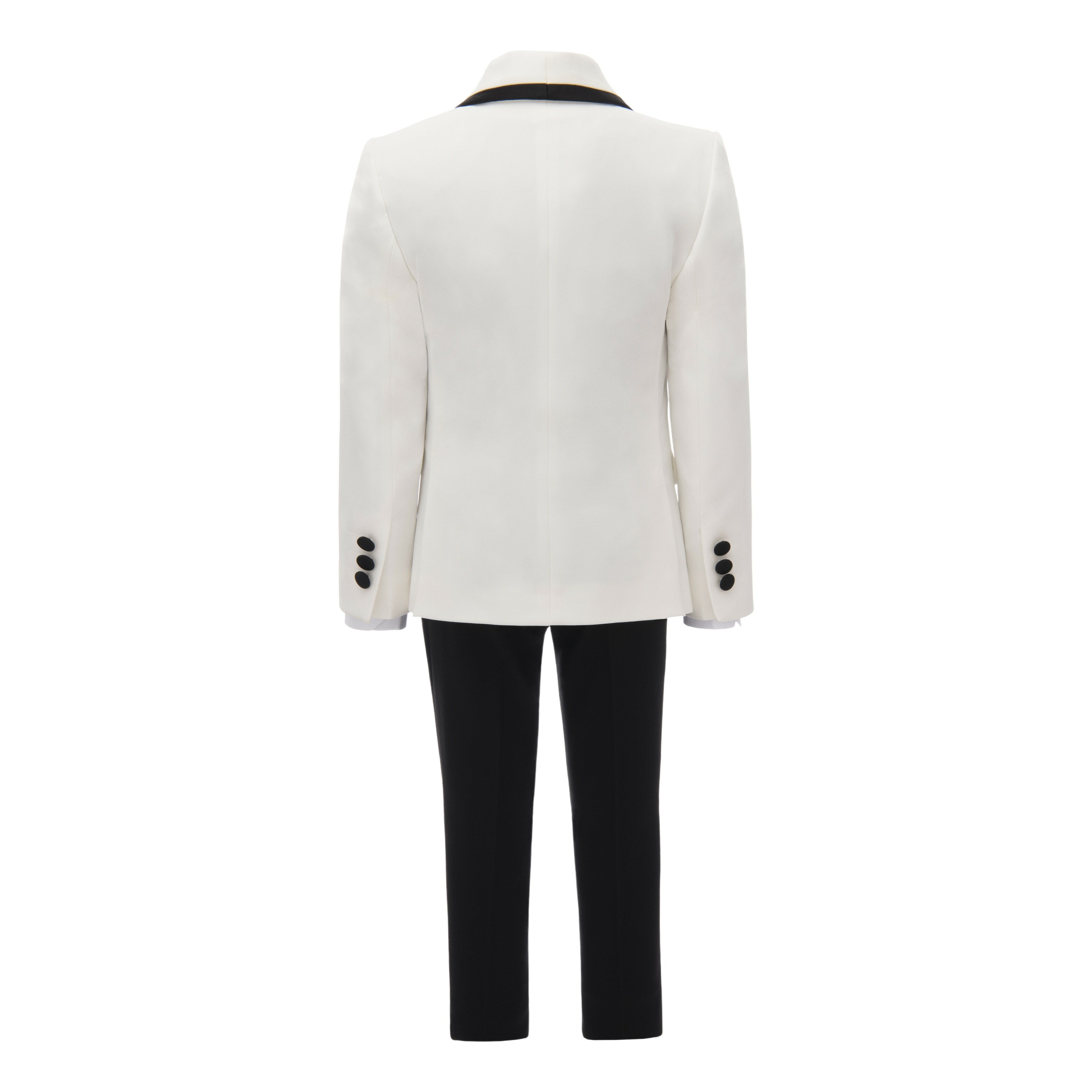 Elevate formal dressing with this refined tuxedo ensemble, where classic tailoring meets modern contrast. The cream jacket features a sleek black shawl lapel and single-button closure, perfectly complemented by black trousers, a crisp white shirt, and a coordinating bow tie—delivering a polished look for weddings, galas, or black-tie events.