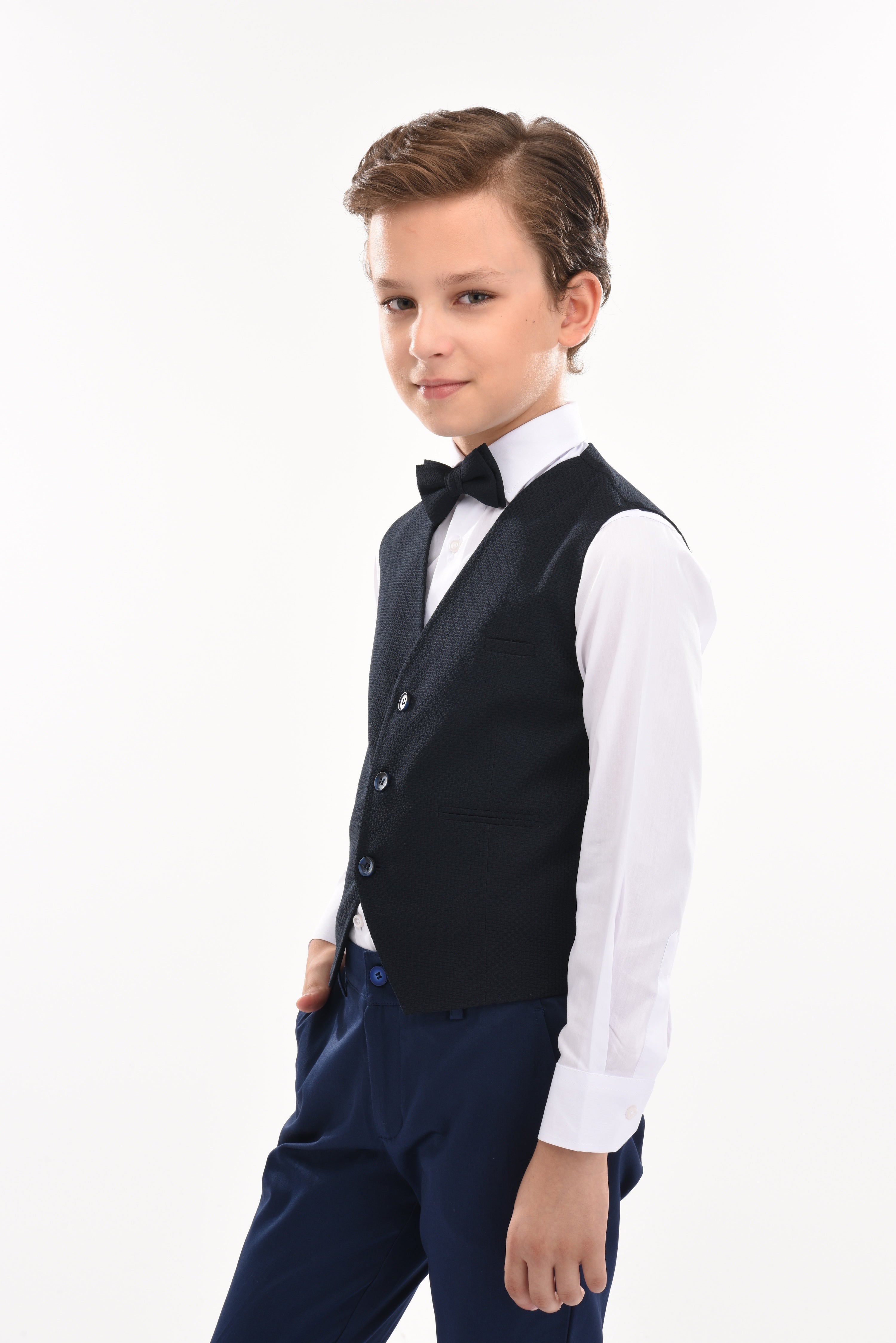 Introducing the Benito Suit Vest Outfit Set for boys from Moustache. This stylish set includes a dapper solid navy colored vest with a three-button closure, a satin interior. An adjustable waist for the perfect fit! Paired with a matching bow tie, blue dress pants, and a crisp white dress shirt, this ensemble adds a touch of elegance to any outfit.
