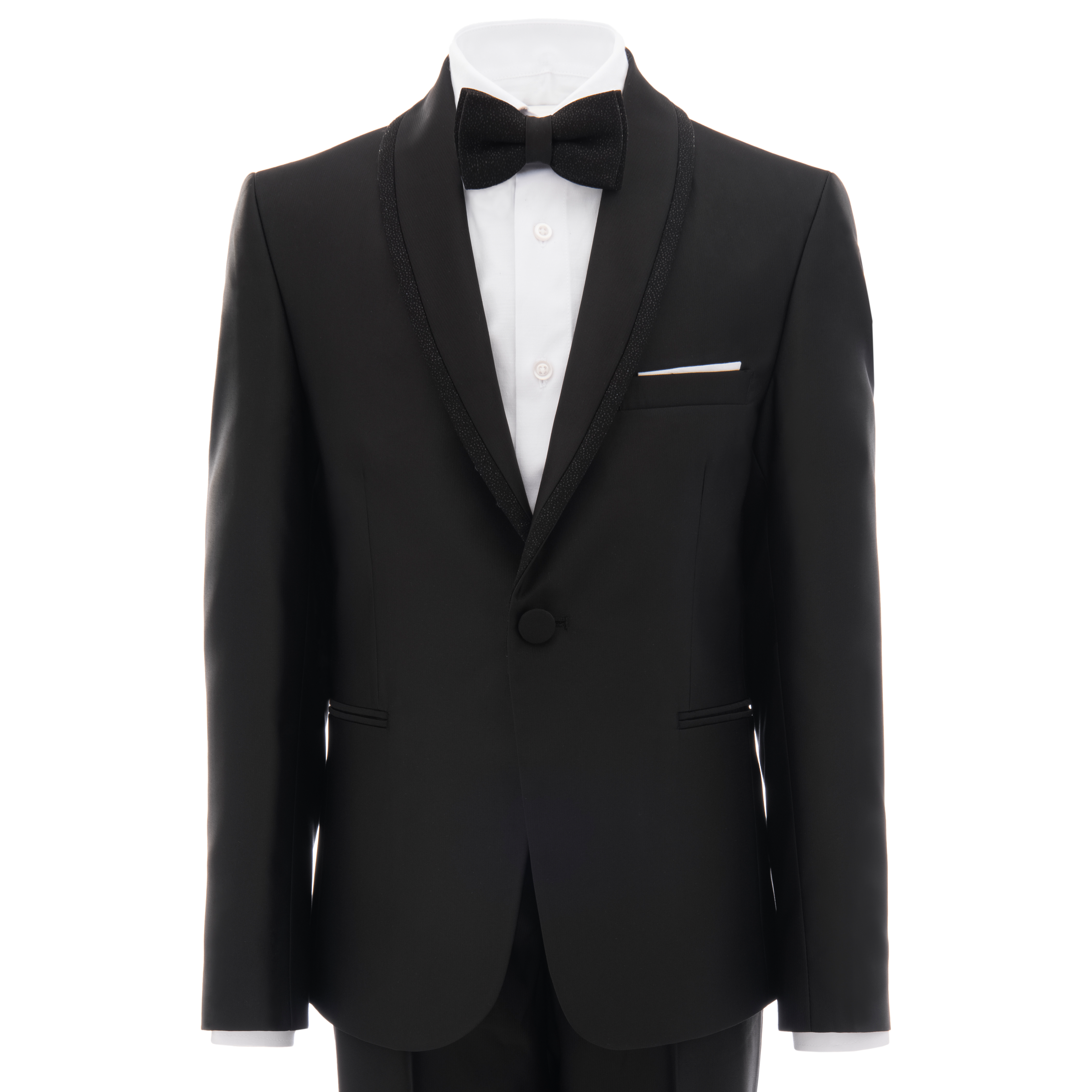 Make your child's special occasions unforgettable with the black glitter trim 4pc peak lapel suit for kid boys from Moustache. This exquisite set includes a white classic dress shirt, a black shawl lapel blazer with eye-catching black glitter trim. Truly this is a completed with a classic black bow tie, adding a touch of elegance.