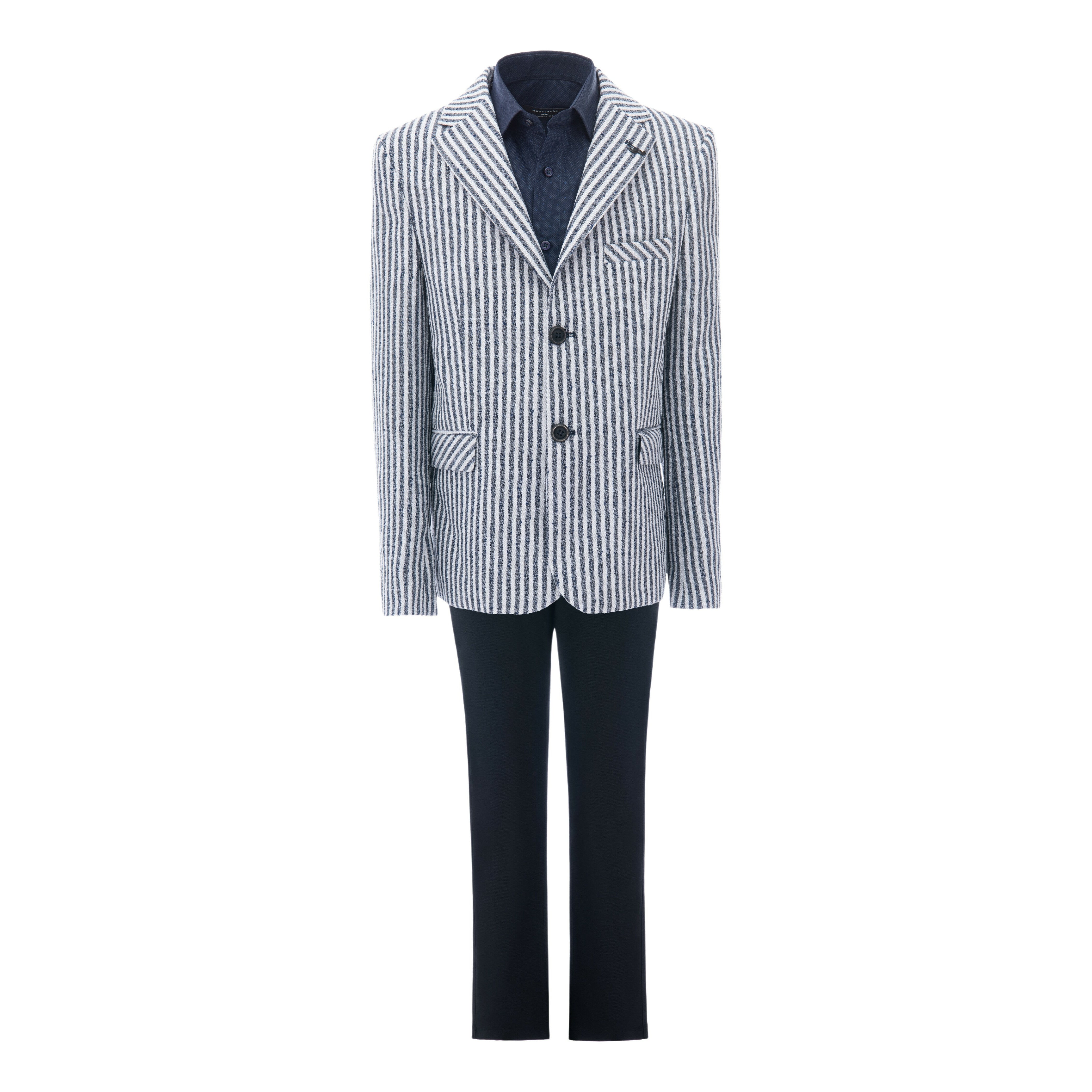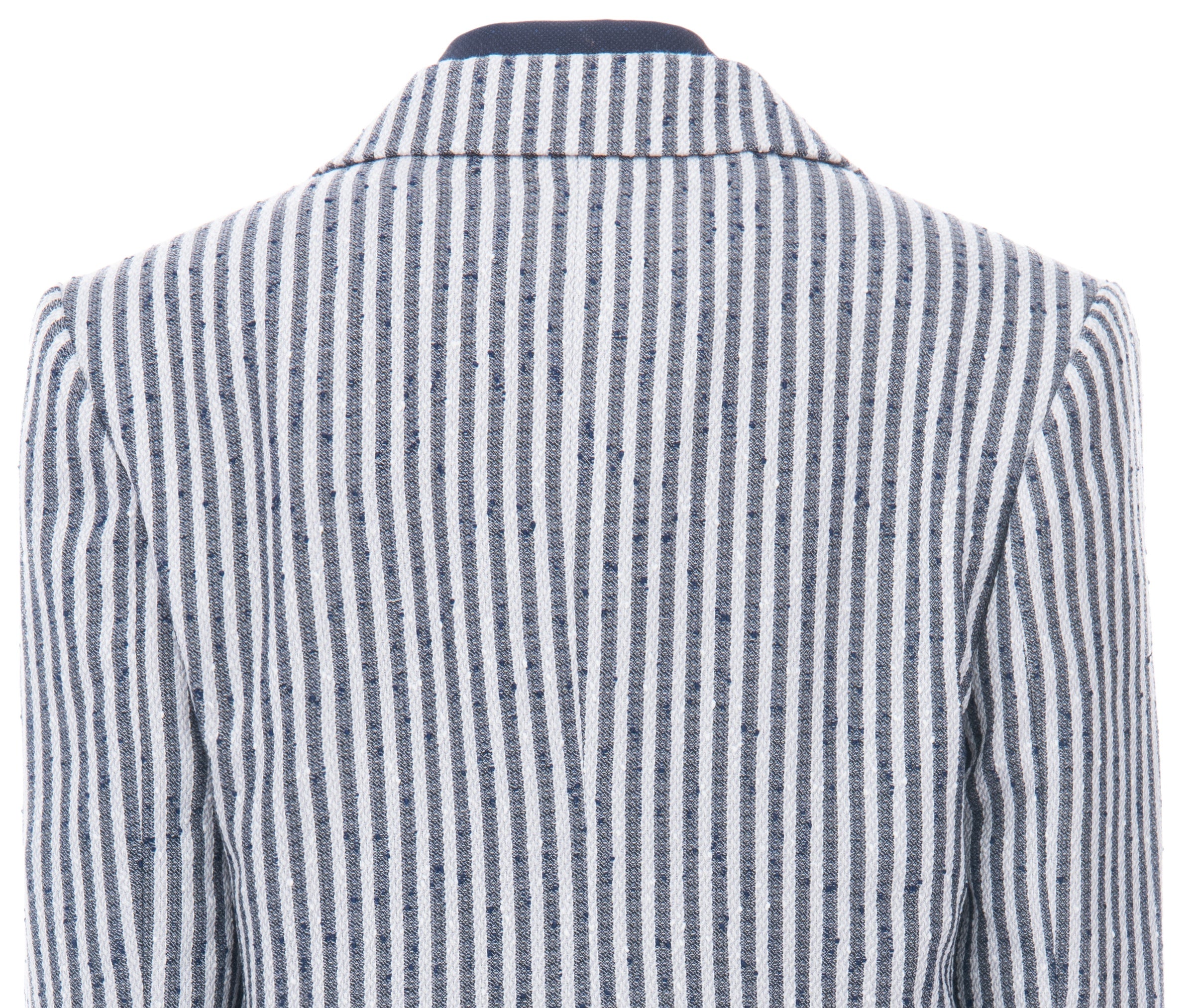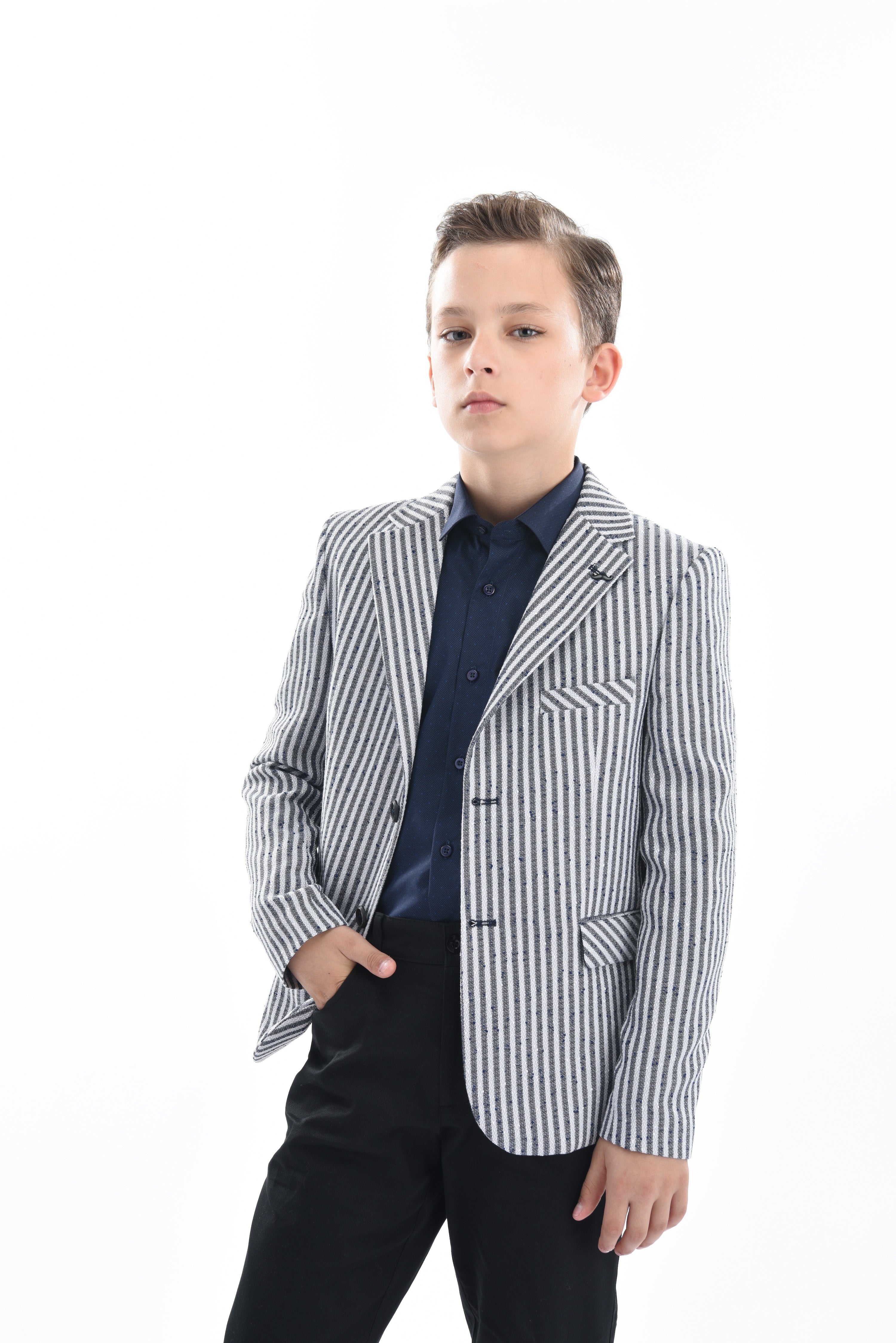 Additionally, the gray and navy striped peak lapel blazer stands out with its elegant design. Included are dual pockets with double button closure. The blazer is crafted from high-quality materials, ensuring a comfortable and tailored fit that enhances your child's silhouette.