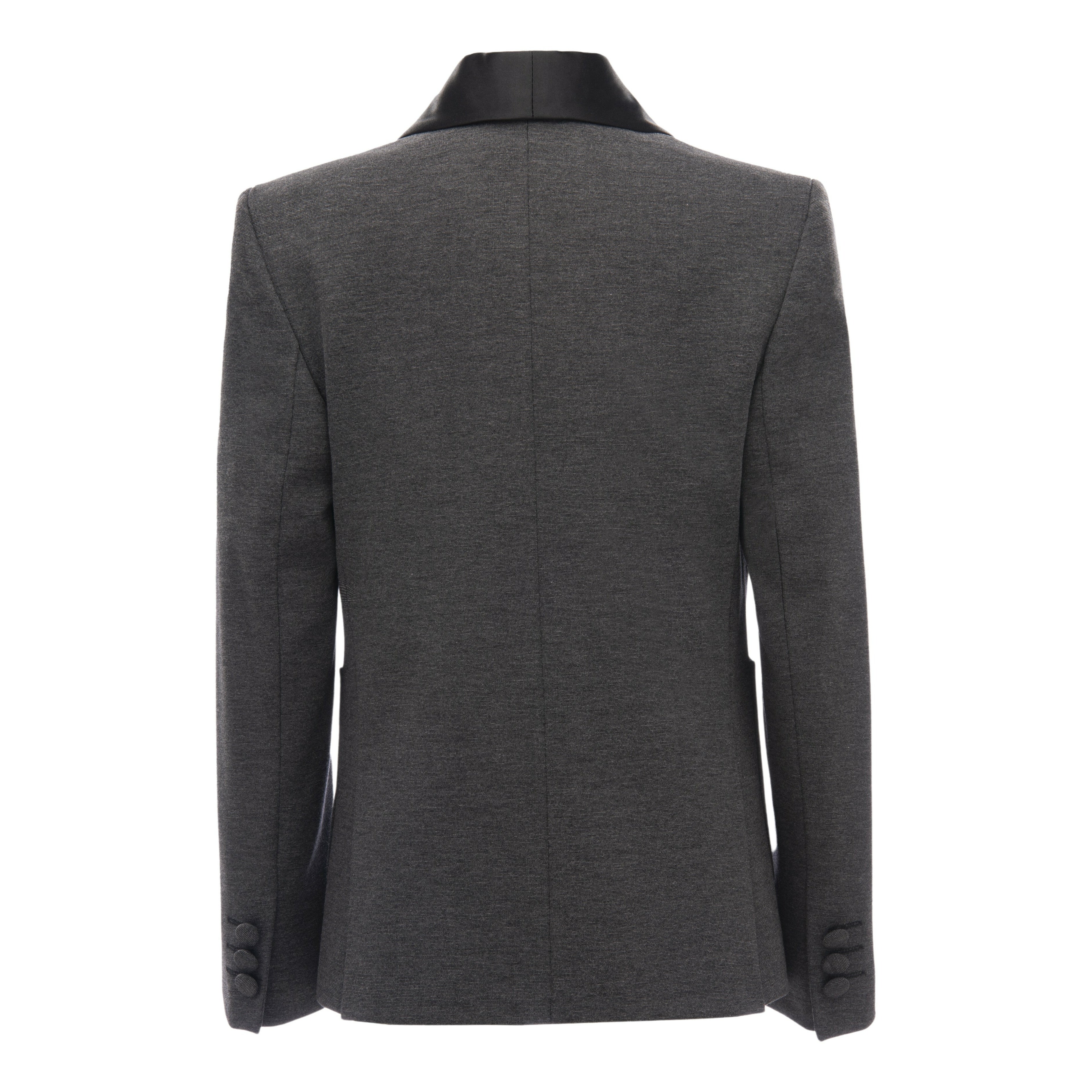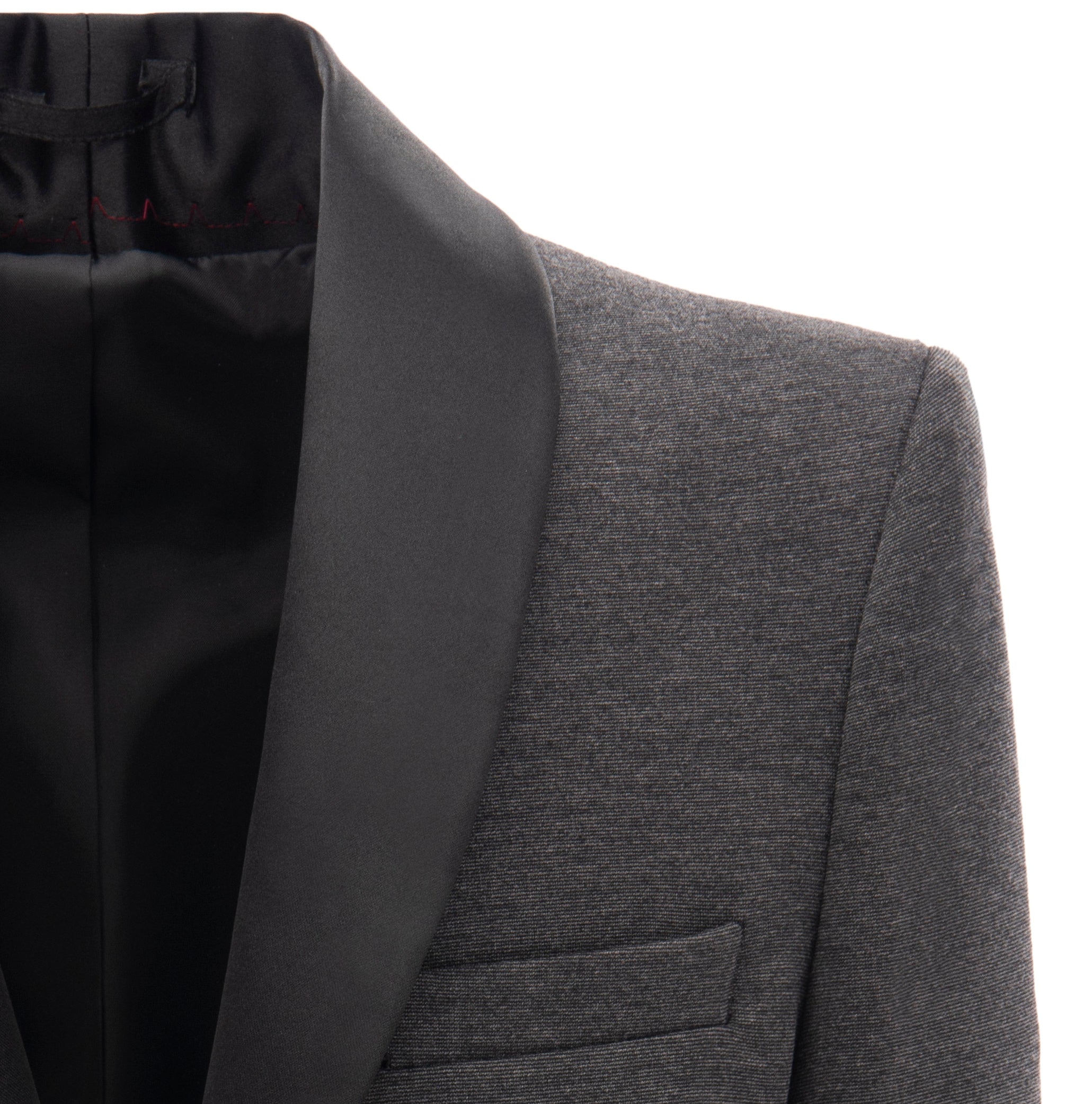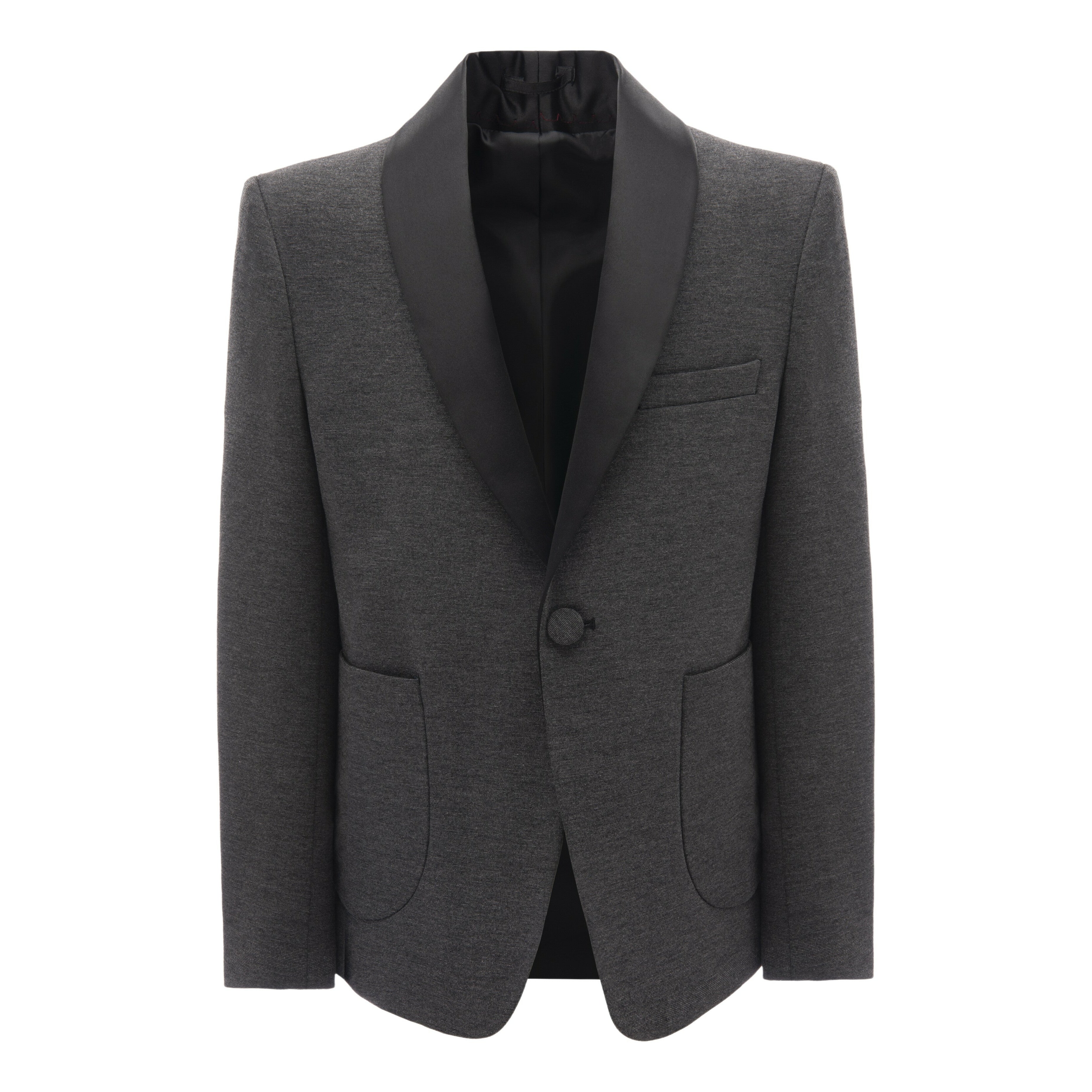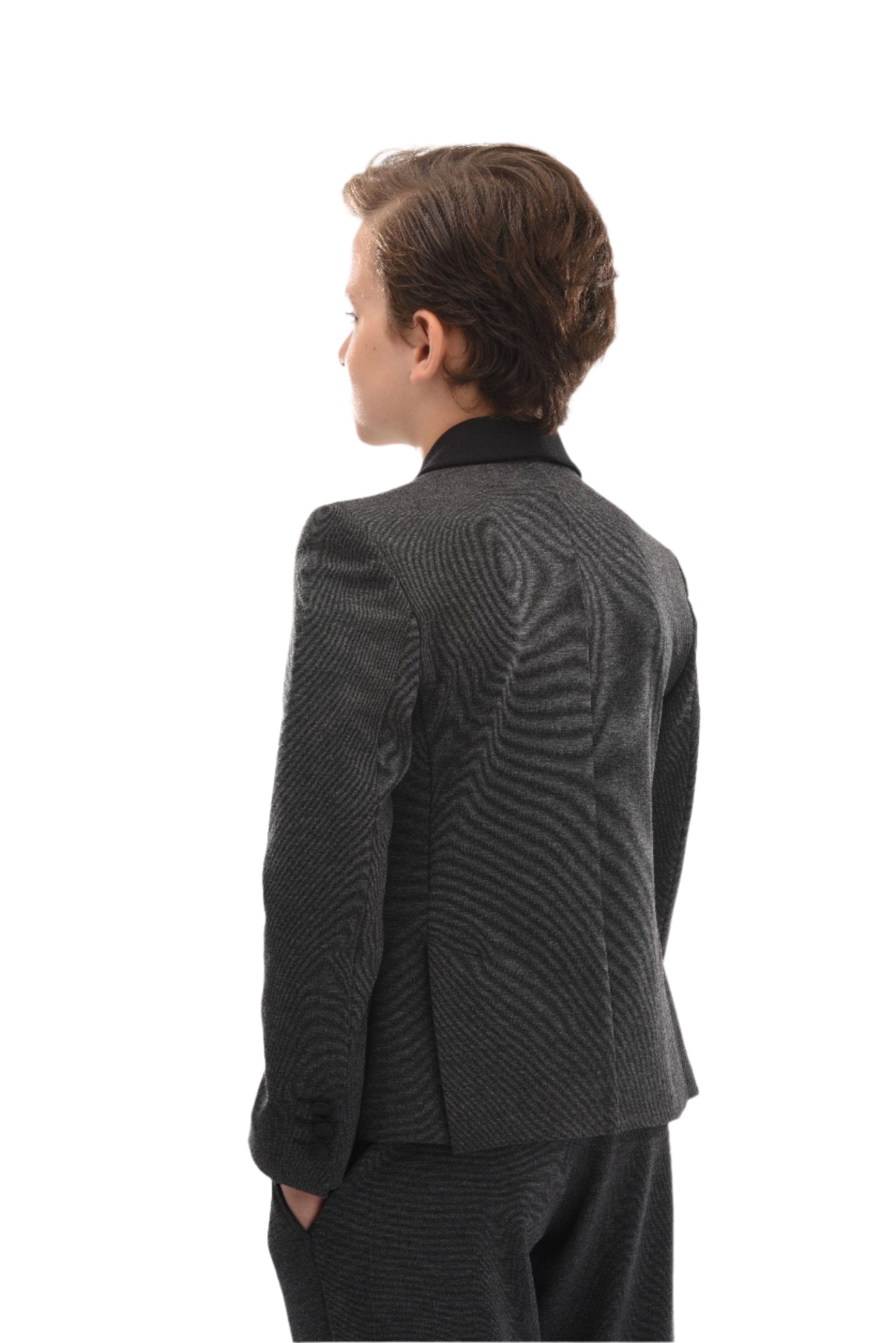Elevate your child's formal wardrobe with Moustache's Gray Shawl Lapel Blazer. This stylish evening blazer features a black shawl lapel design and satin-like lining. This adds a touch of sophistication to any outfit.