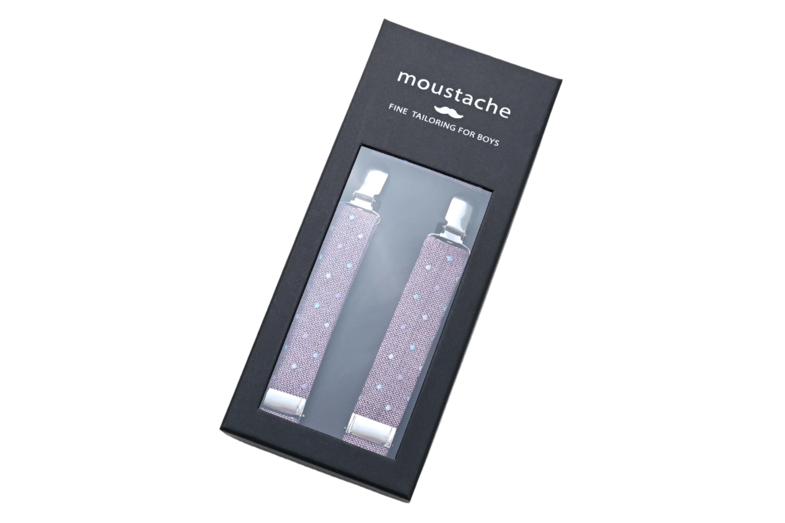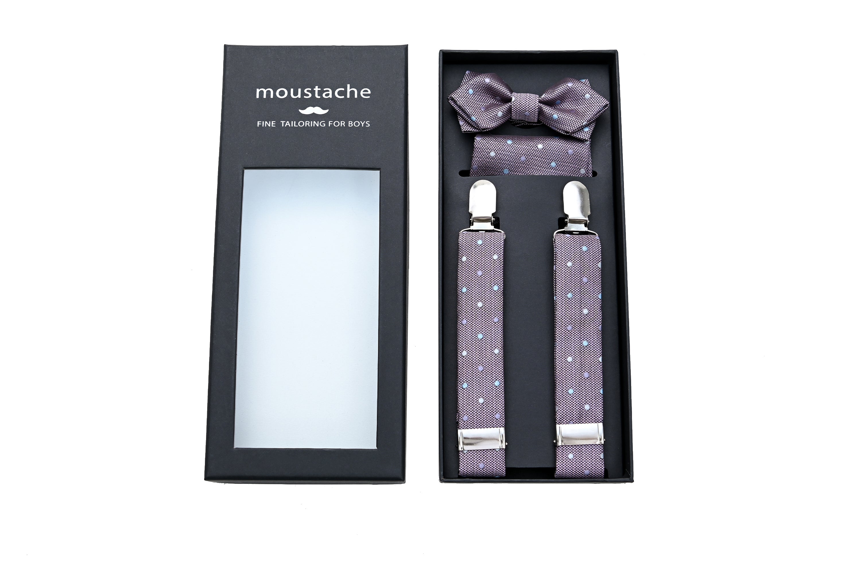 Enhance your young gentleman's wardrobe with the Purple Dotted Suspenders Set from Moustache. This meticulously crafted set includes suspenders, bowtie and pocket square. Moreover, it's ideal for formal events and fashionable everyday wear alike.