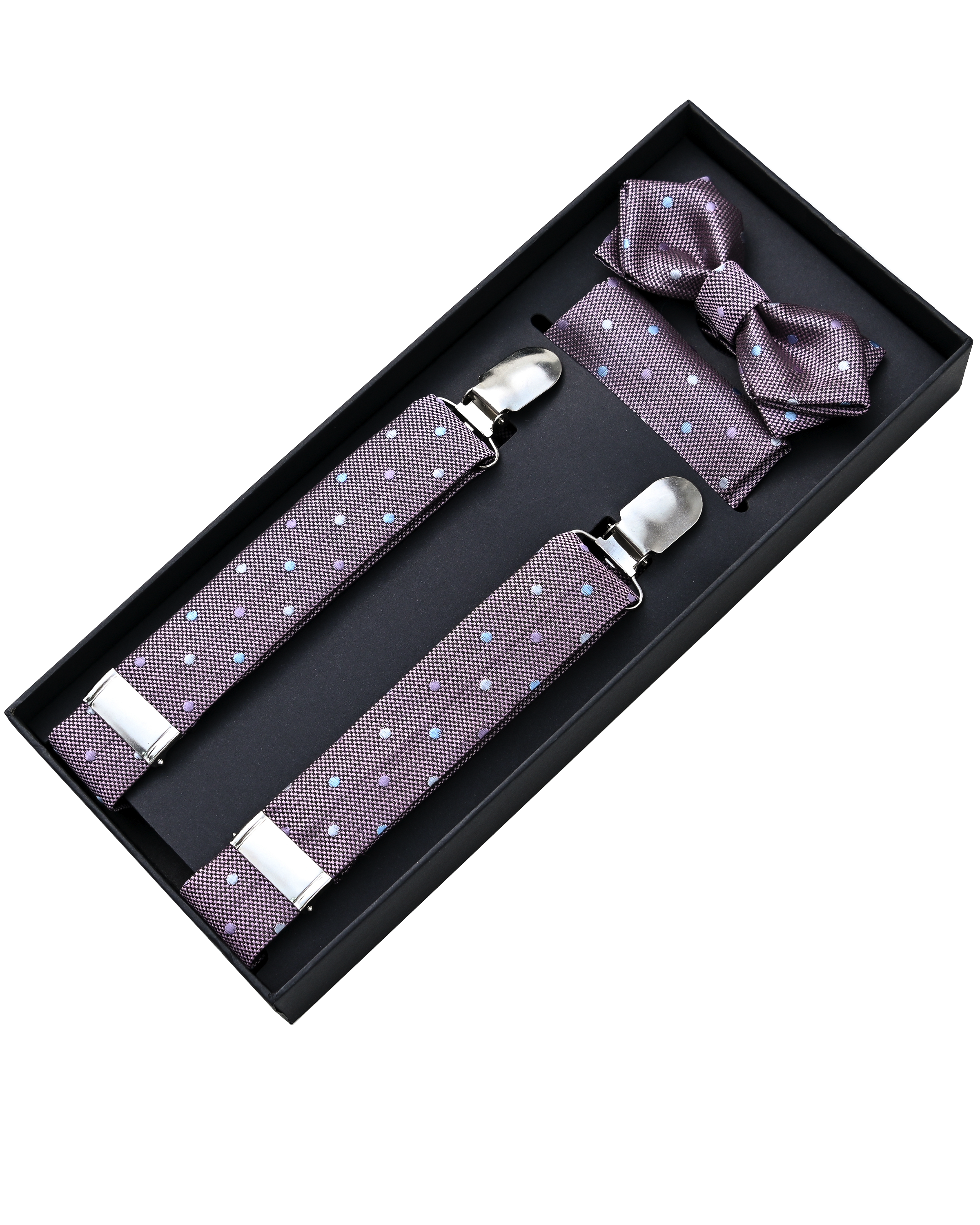 The set features a charming purple background adorned with delicate dots. Adding a touch of whimsy and visual interest to any outfit. Furthermore, this comprehensive set includes matching suspenders, coordinating bowtie, and pocket square. Thereby creating a harmonious look that exudes sophisticated style with a youthful twist.