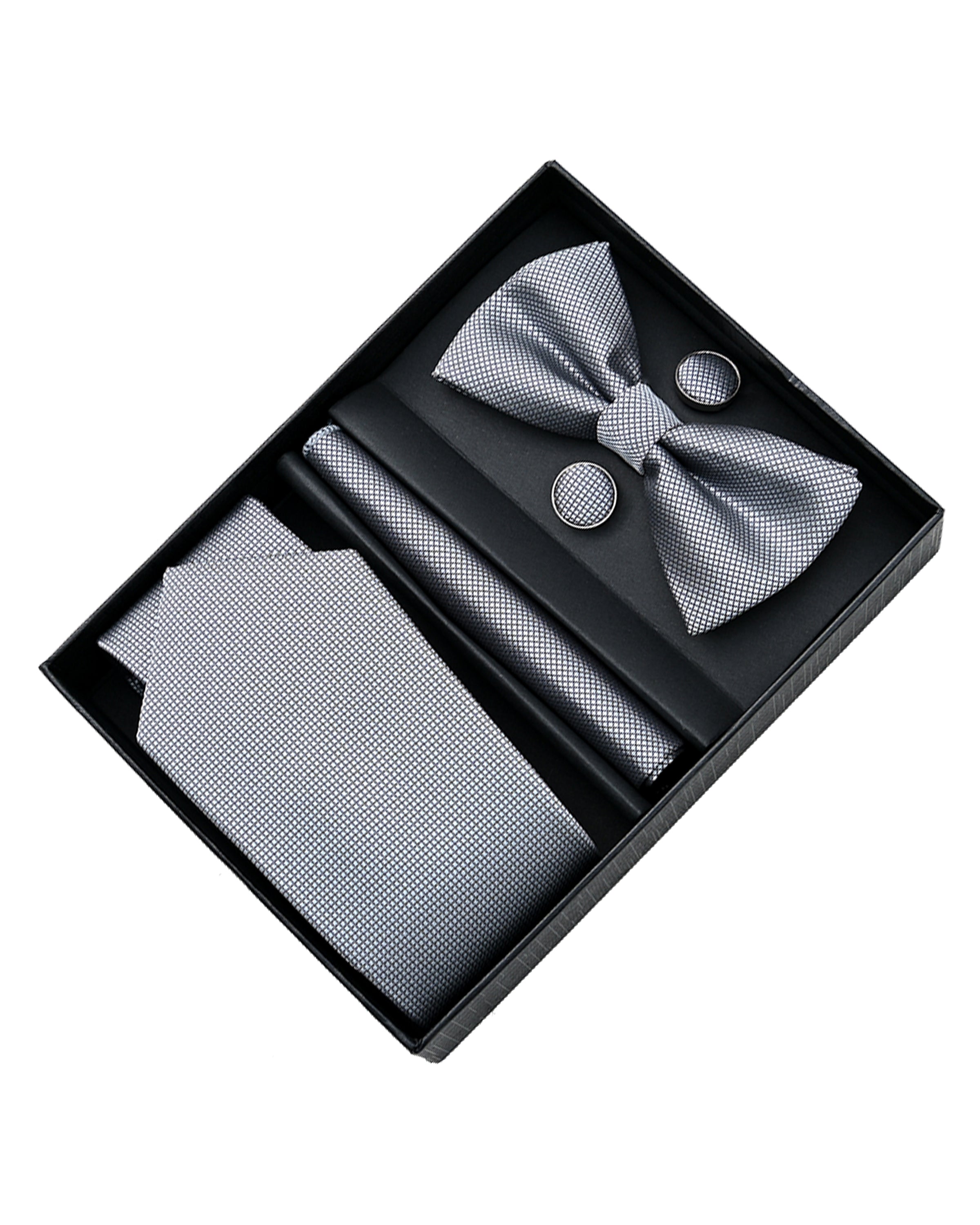 Crafted from premium materials, this Silver Texture Tie Set caters to a wide range of sizes and style preferences. The tie and bowtie are easy to knot and adjust, providing both style for your young gentleman. The included pocket square and cufflinks add extra touches of refinement to complete the ensemble.