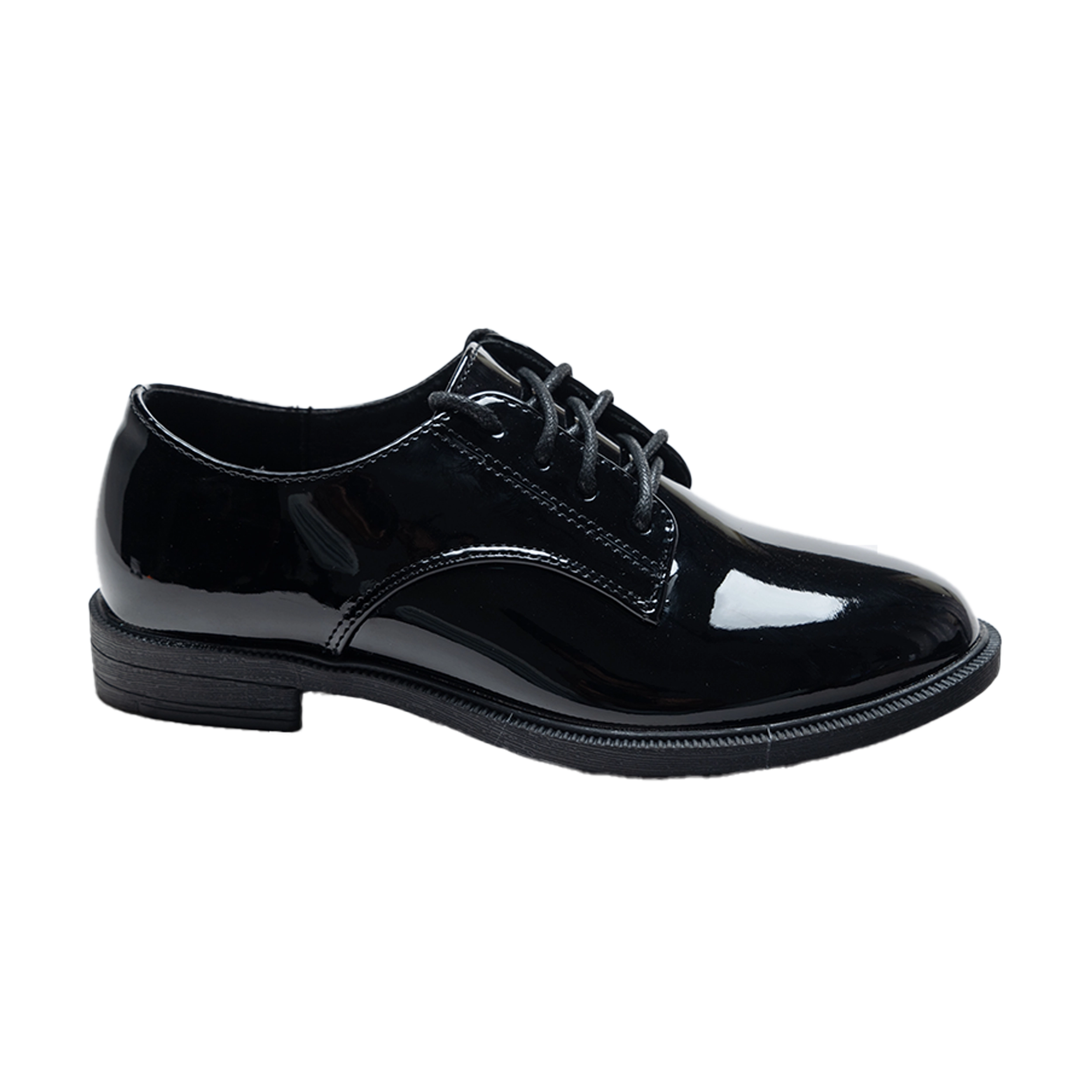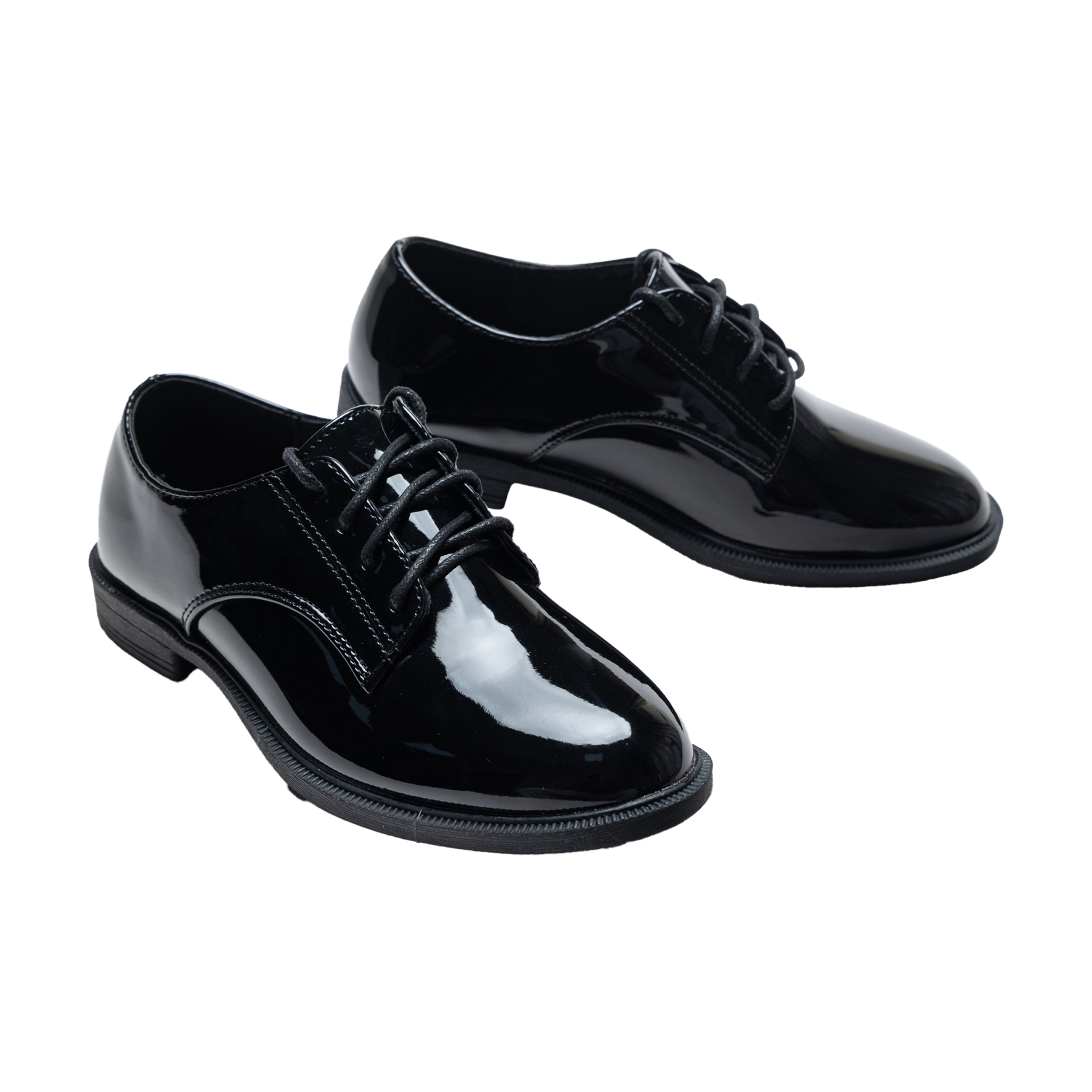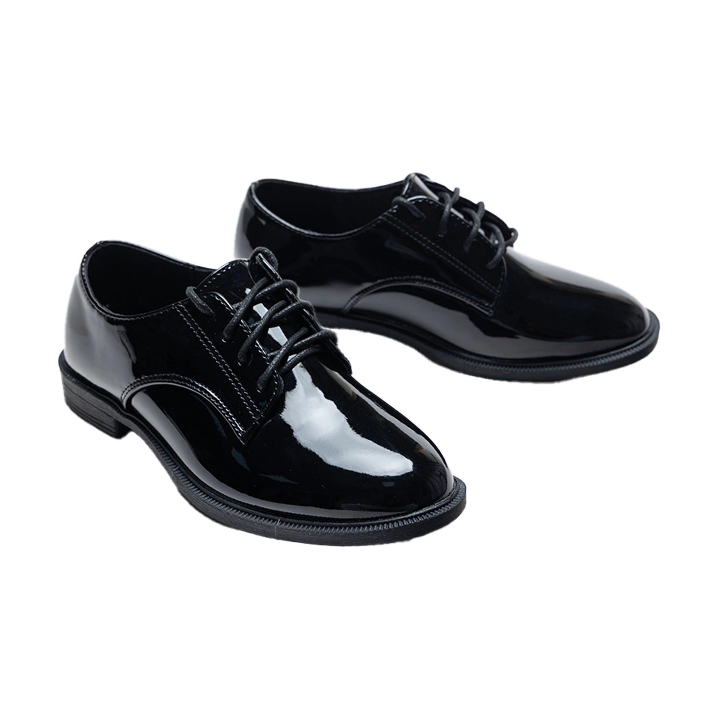 The traditional laced design adds a touch of sophistication while ensuring a snug and comfortable fit. The glossy black exterior enhances their classic appeal, making them a standout addition to any young gentleman’s wardrobe.