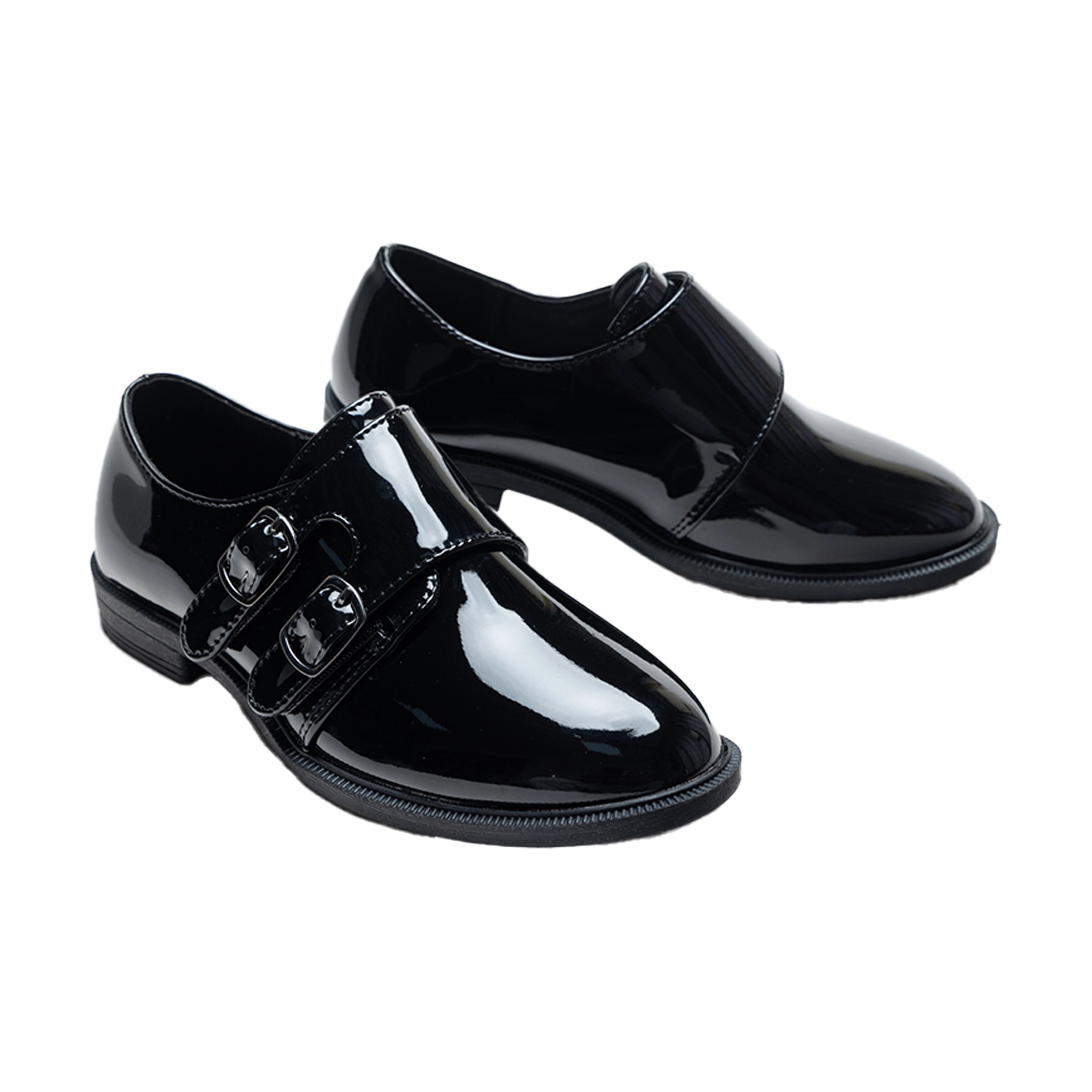 Introducing the Black Patent Buckle Loafers by Moustache, a timeless blend of sleek design and classic sophistication tailored for little boys. Crafted from glossy black patent leather with a smooth sheen, these loafers radiate elegance, making them ideal for formal occasions or polished everyday wear.