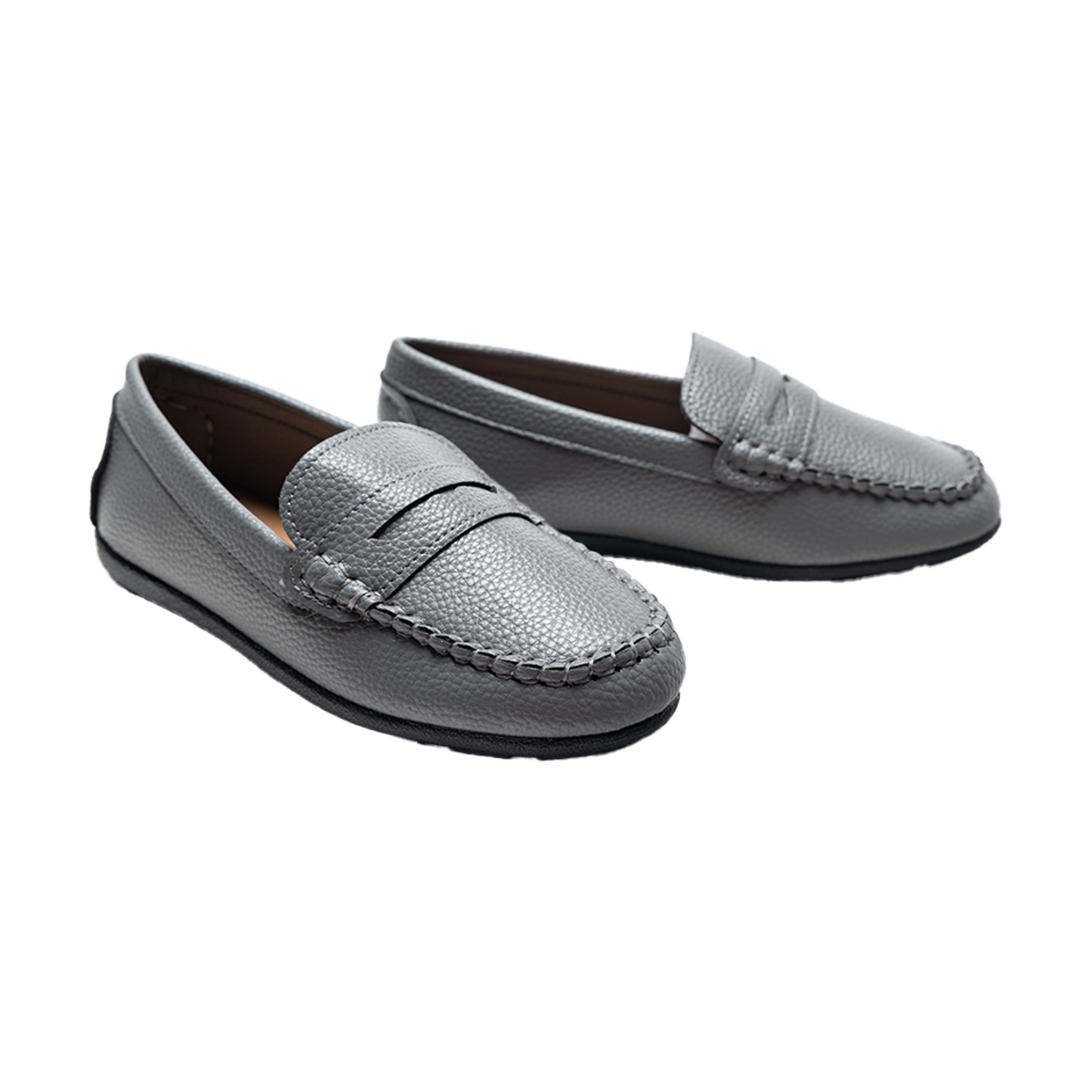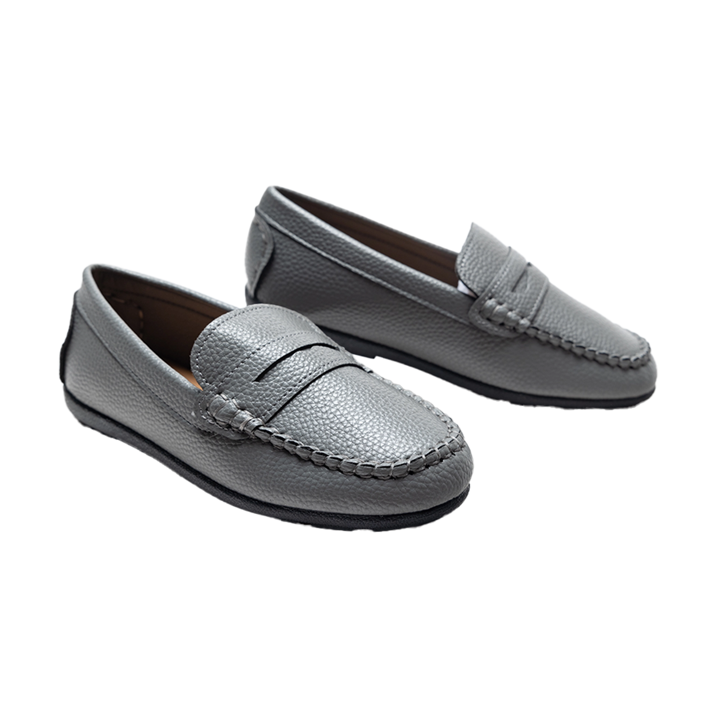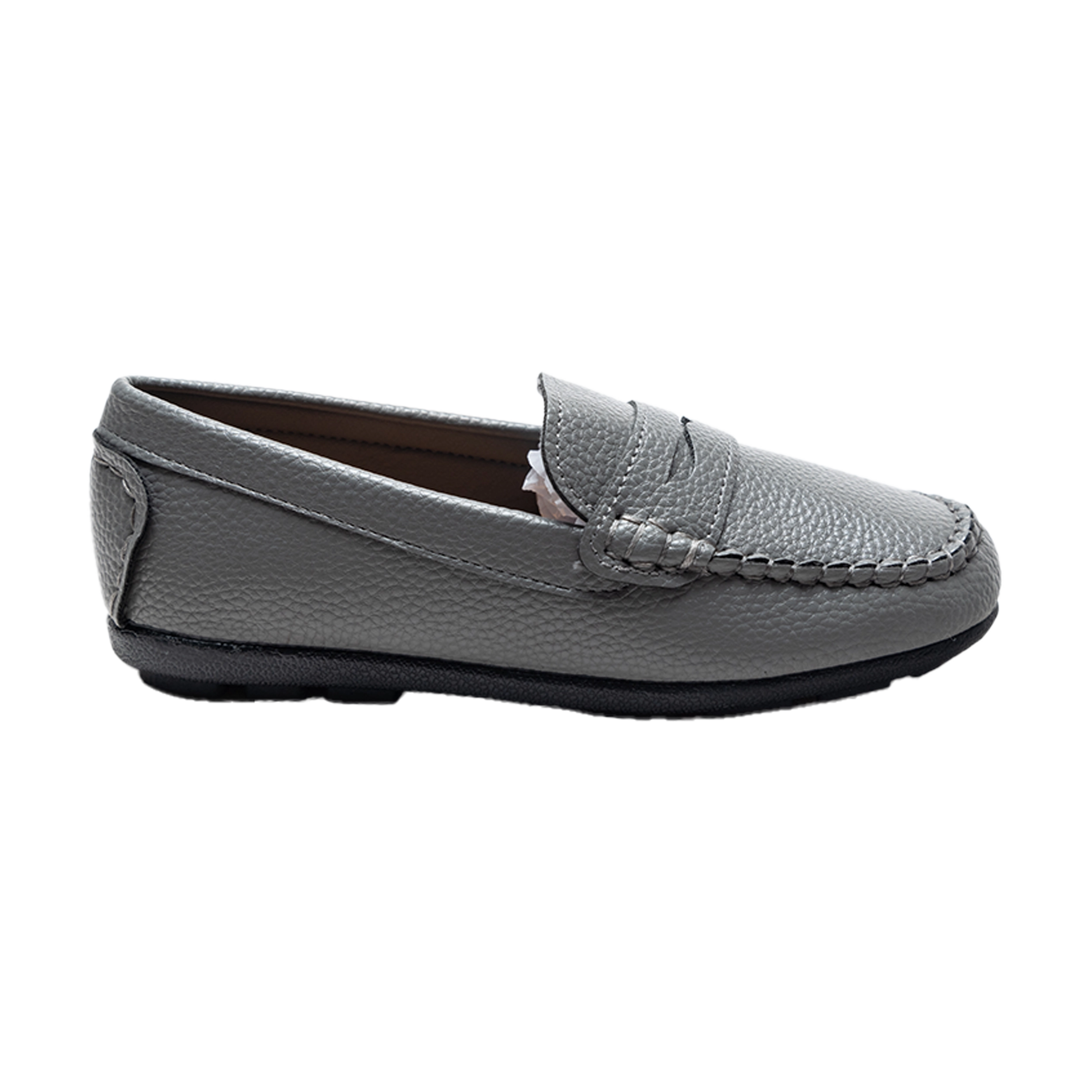Introducing the Gray Faux Leather Penny Loafers by Moustache, a sleek and versatile choice for little boys who appreciate understated elegance. Made from smooth gray leather with a soft matte finish, these loafers offer a modern twist on a timeless classic, perfect for both formal occasions and stylish everyday wear.