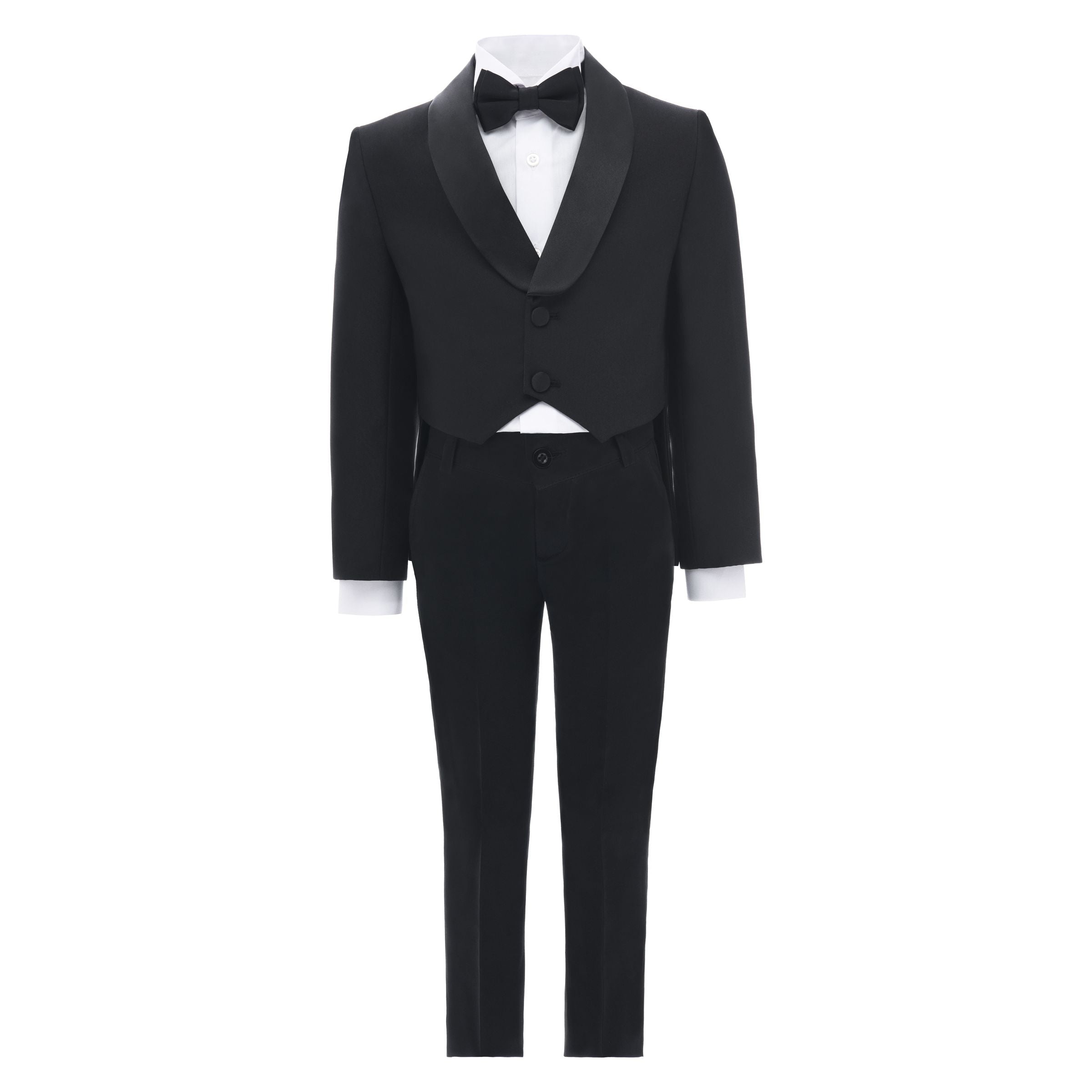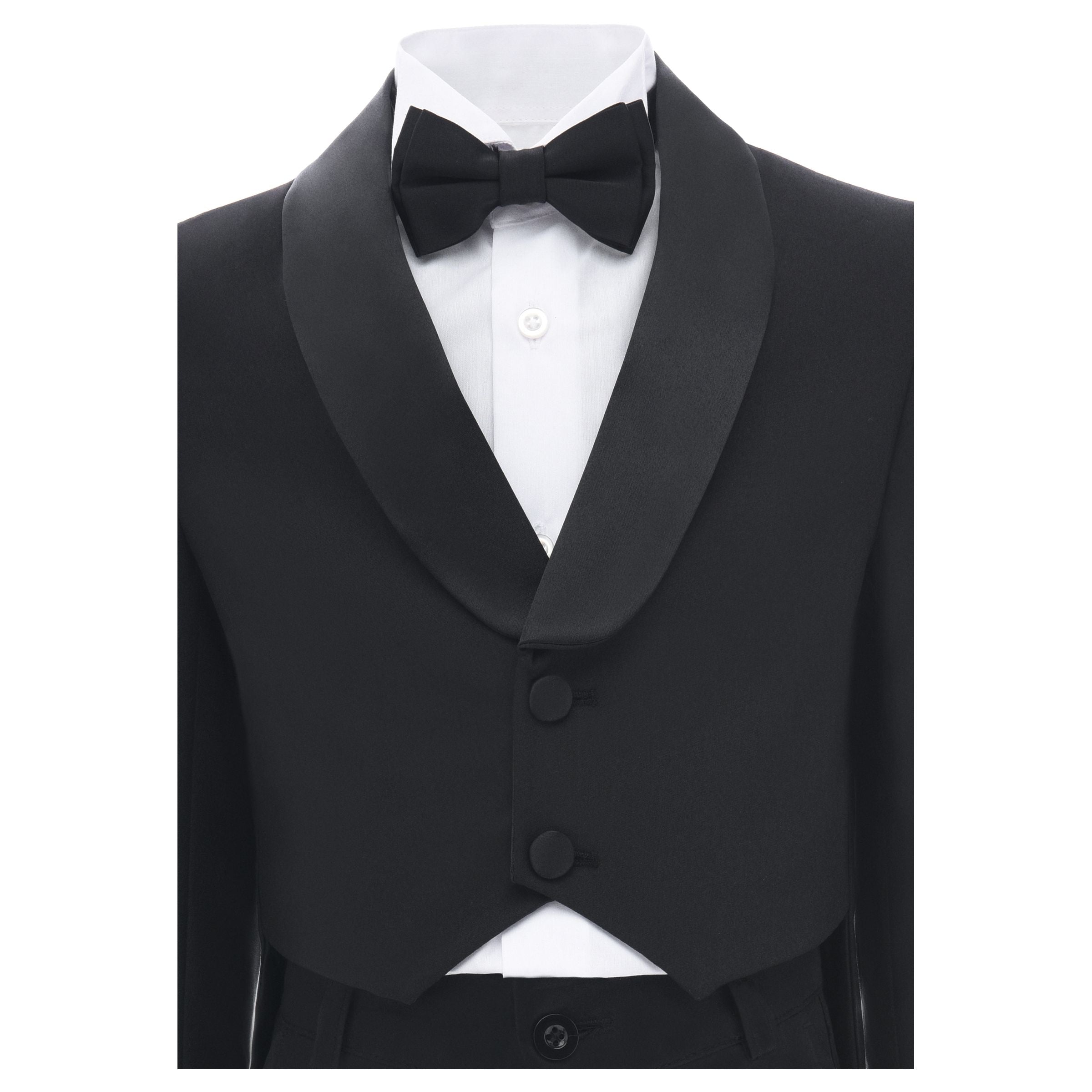 Step into timeless sophistication with this formal black suit, tailored for the most distinguished occasions. Featuring a satin peak-lapel tailcoat, crisp white dress shirt, and a sharp black bow tie, this ensemble is the epitome of black-tie excellence. Ideal for galas, weddings, or any event where elegance is non-negotiable.