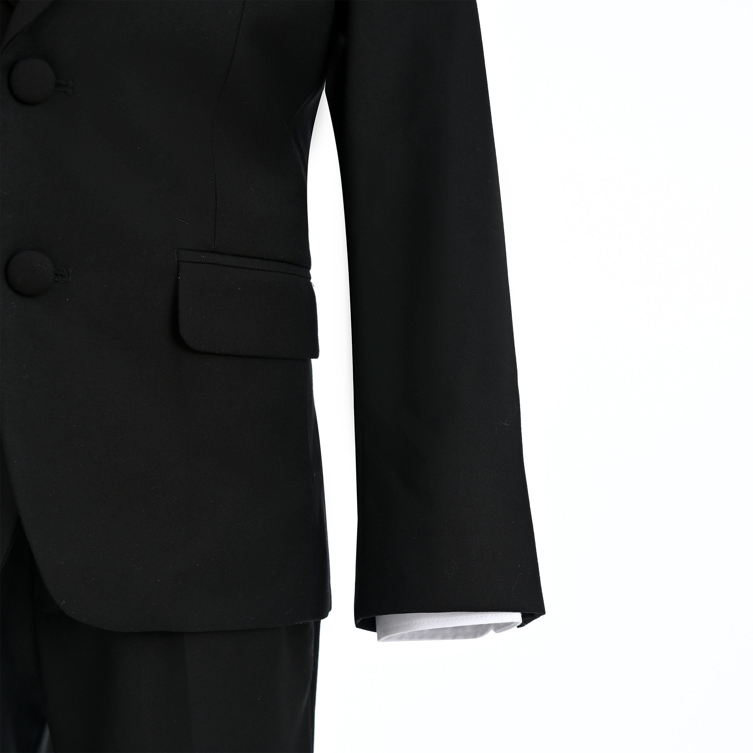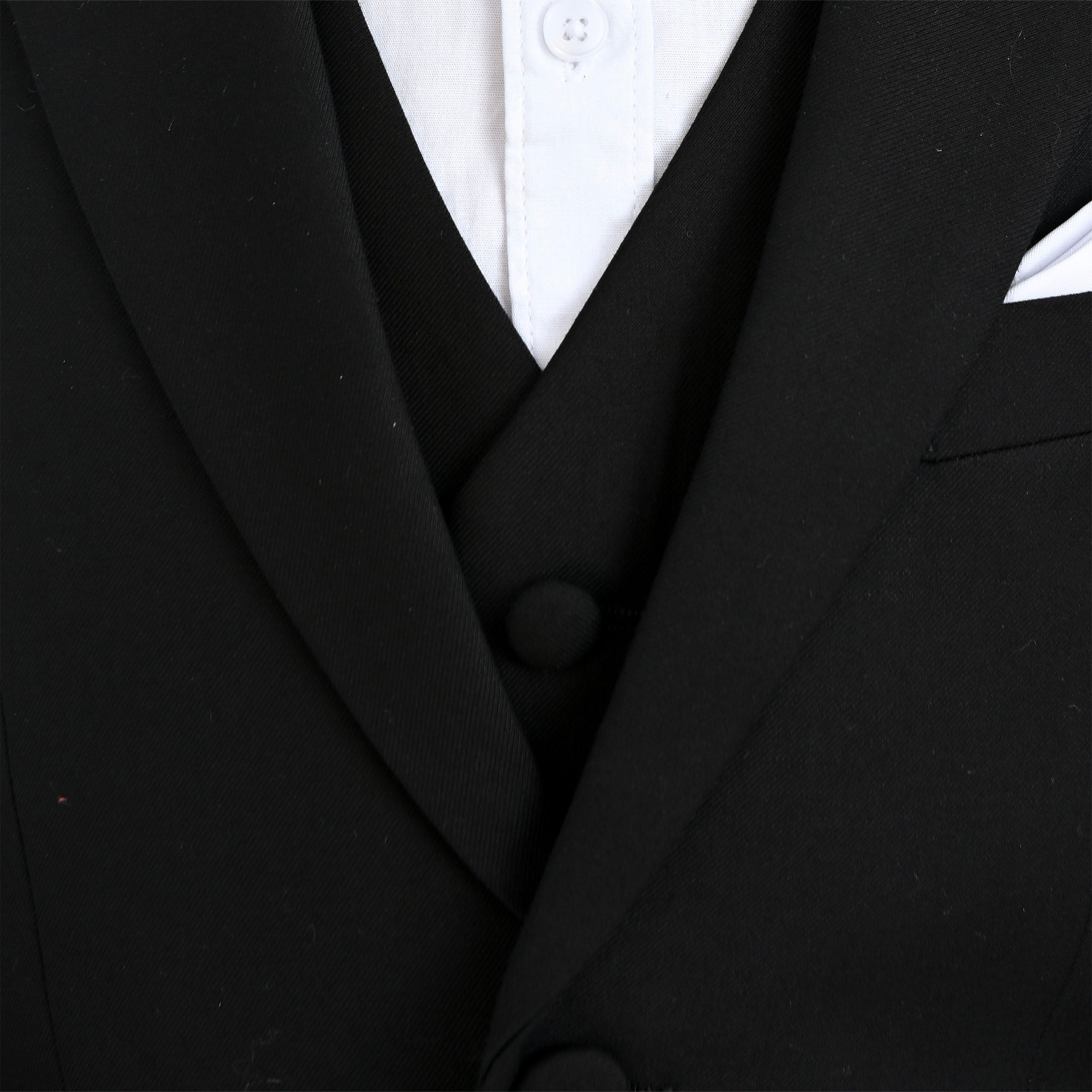 Designed for timeless elegance, the Black Suit Peak Lapel Tuxedo Set by Moustache is a refined five-piece ensemble, perfect for formal occasions. The sleek black blazer features a classic peak lapel, adding a sophisticated touch, while the crisp white dress shirt and adjustable vest ensure a polished, tailored look. The flat-front slim-fit pants, complete with an adjustable waistband, provide both comfort and modern style.