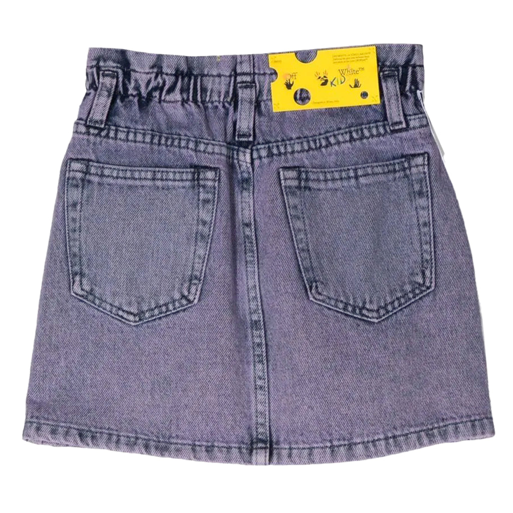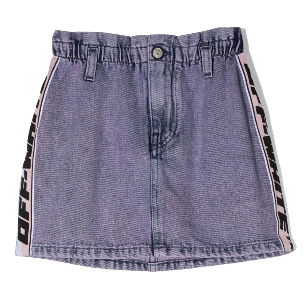 Logo-stripe denim skirt from Off-White Kids featuring purple, multicolor, cotton, acid wash, high waist, logo-print drawstring, elasticated waistband, belt loops, front button and zip fastening, two rear patch pockets and straight hem.