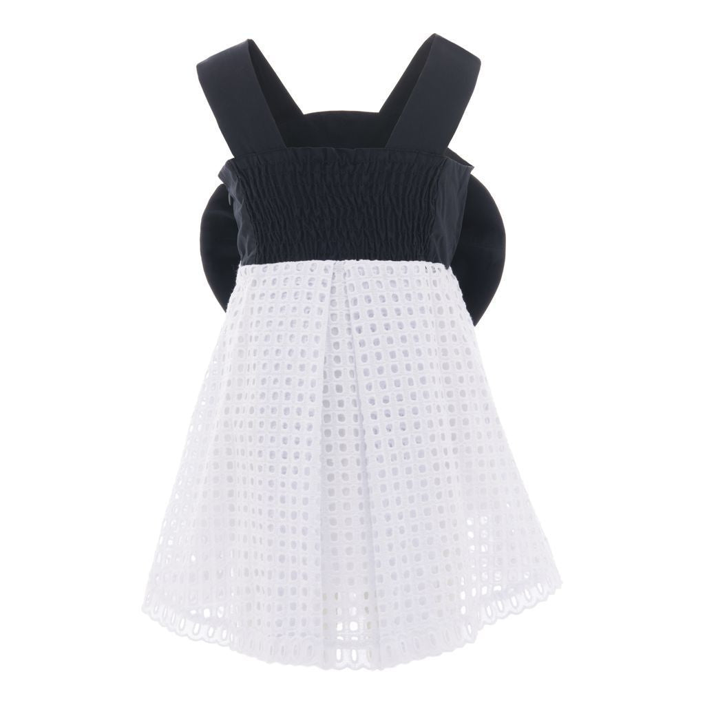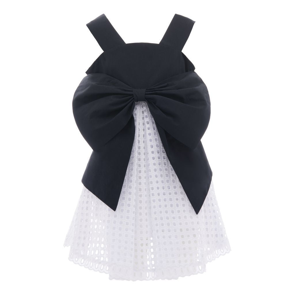 A timeless silhouette with a graphic twist, this sleeveless dress pairs a structured navy bodice with a voluminous white skirt in embroidered eyelet. The oversized bow adds a bold focal point, perfect for standout moments.