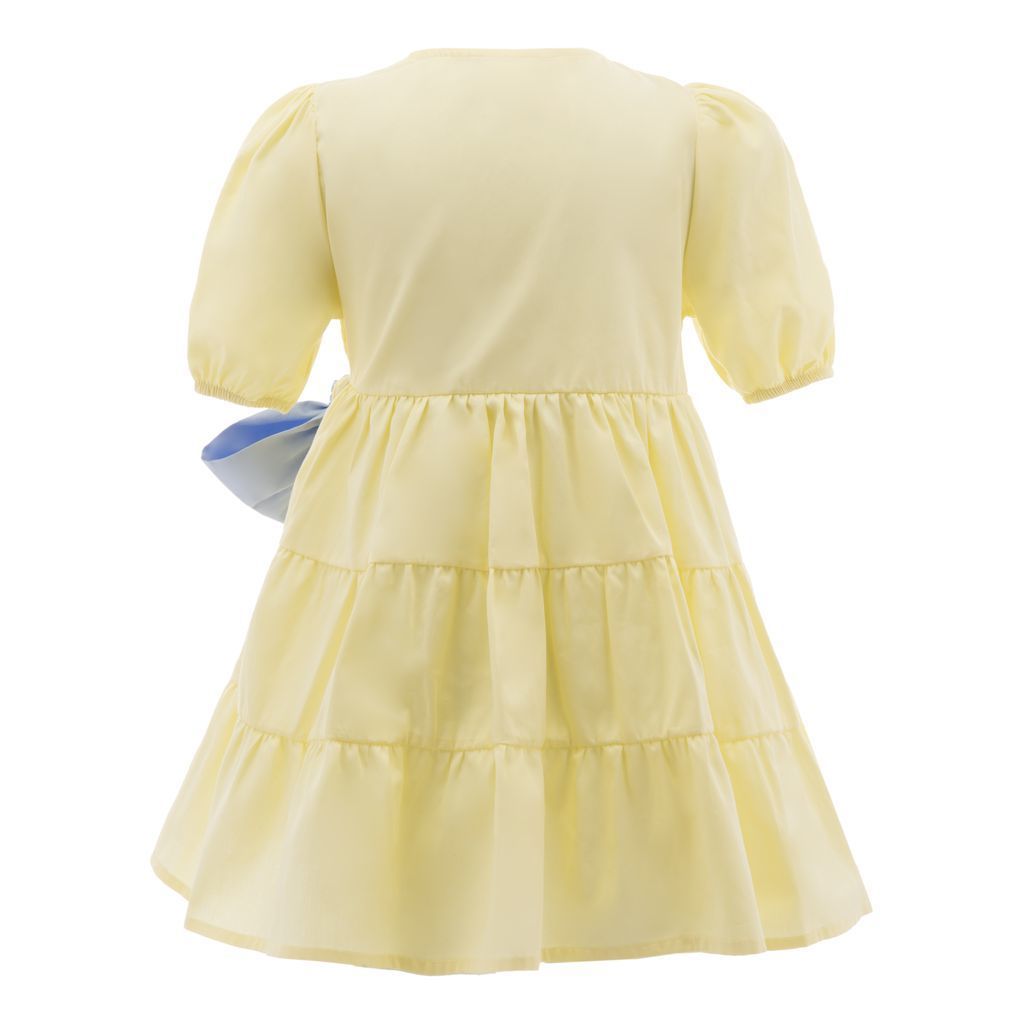 Soft sunshine tones meet airy elegance in this tiered chiffon dress, finished with a pastel bow at the waist. With puff sleeves and a wrap-style bodice, it’s designed for lighthearted celebrations and breezy summer days.