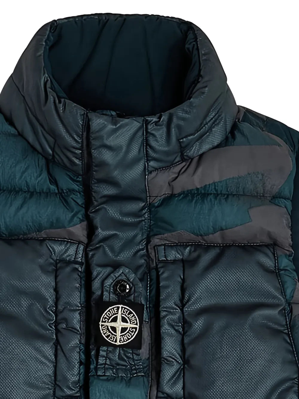 The finished piece has been filled with the finest down, appositely treated to bear the stress of the garment dyeing procedure. Extra lightness and comfort is achieved through the direct injection of the feathers and by a simplified construction of the down bags