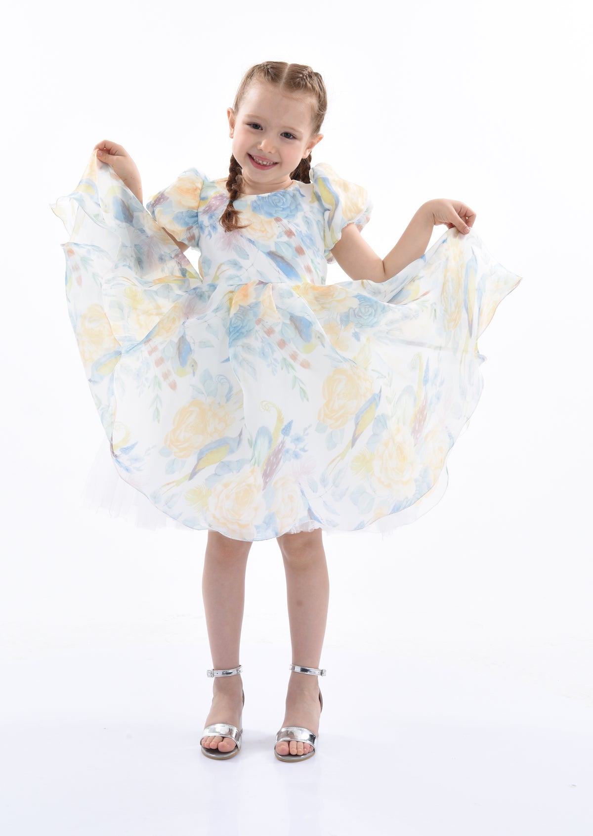 The Blue Chablis Floral Garden Organza Dress for girls from Tulleen is a stunning choice for any special occasion. This dress features a classic round neck that exudes timeless charm while providing comfort for your little one. Additionally, the adorable puff shoulders add a touch of volume and grace, enhancing the overall elegance of the dress.