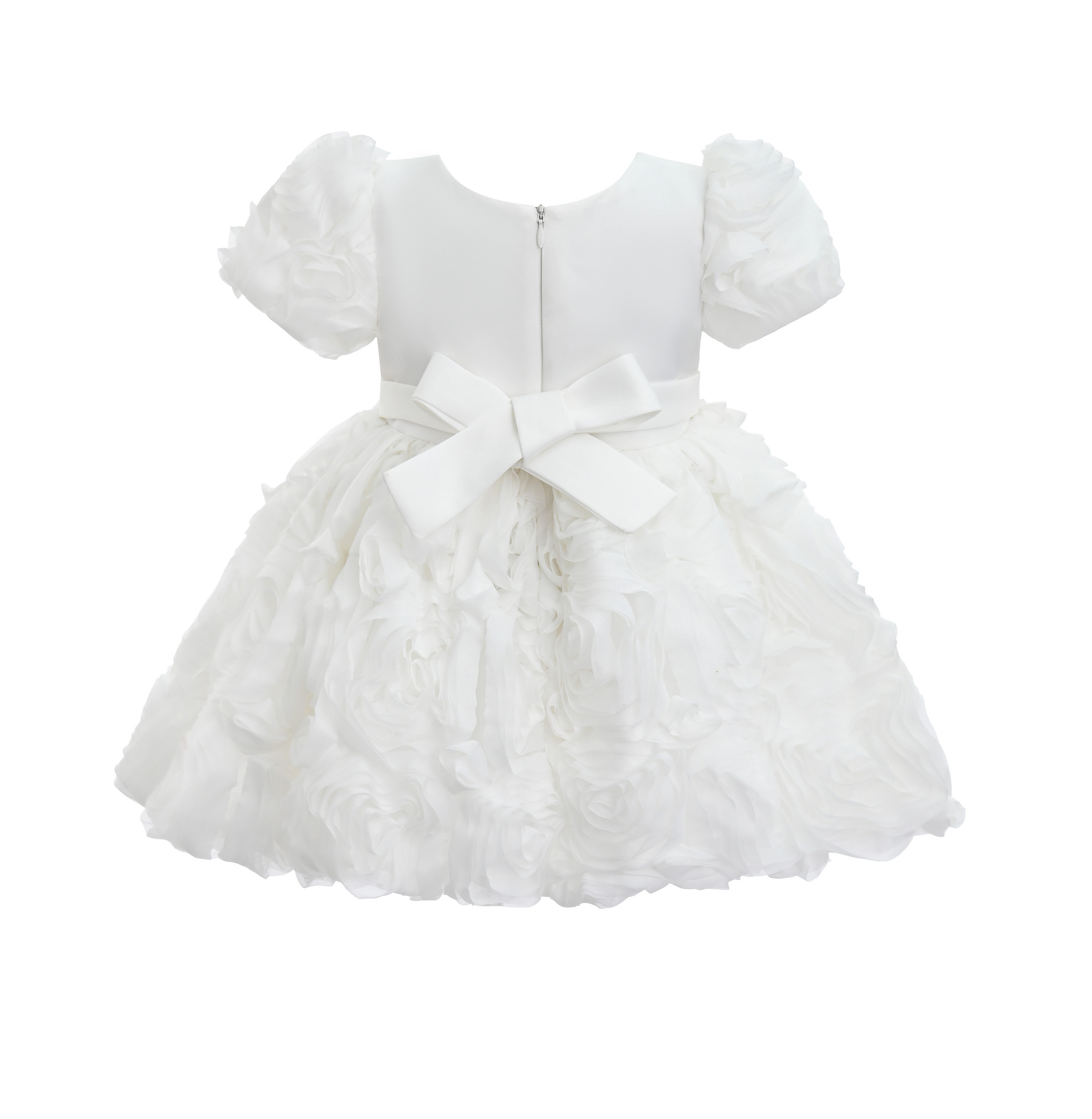 A timeless silhouette crafted for baby's most cherished moments. This elegant white dress features a smooth bodice with puffed sleeves and a voluminous skirt adorned with soft, rose-like textures. At the back, a crisp satin bow sits neatly at the waist, adding a polished finish. The zipper closure ensures a seamless fit, while the layered rosette skirt creates graceful movement with every step. Perfect for weddings, christenings, or formal portraits.