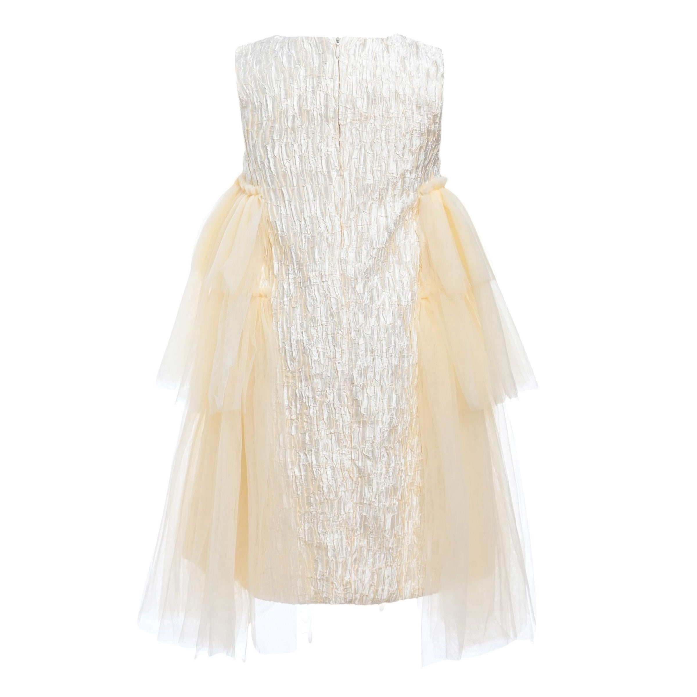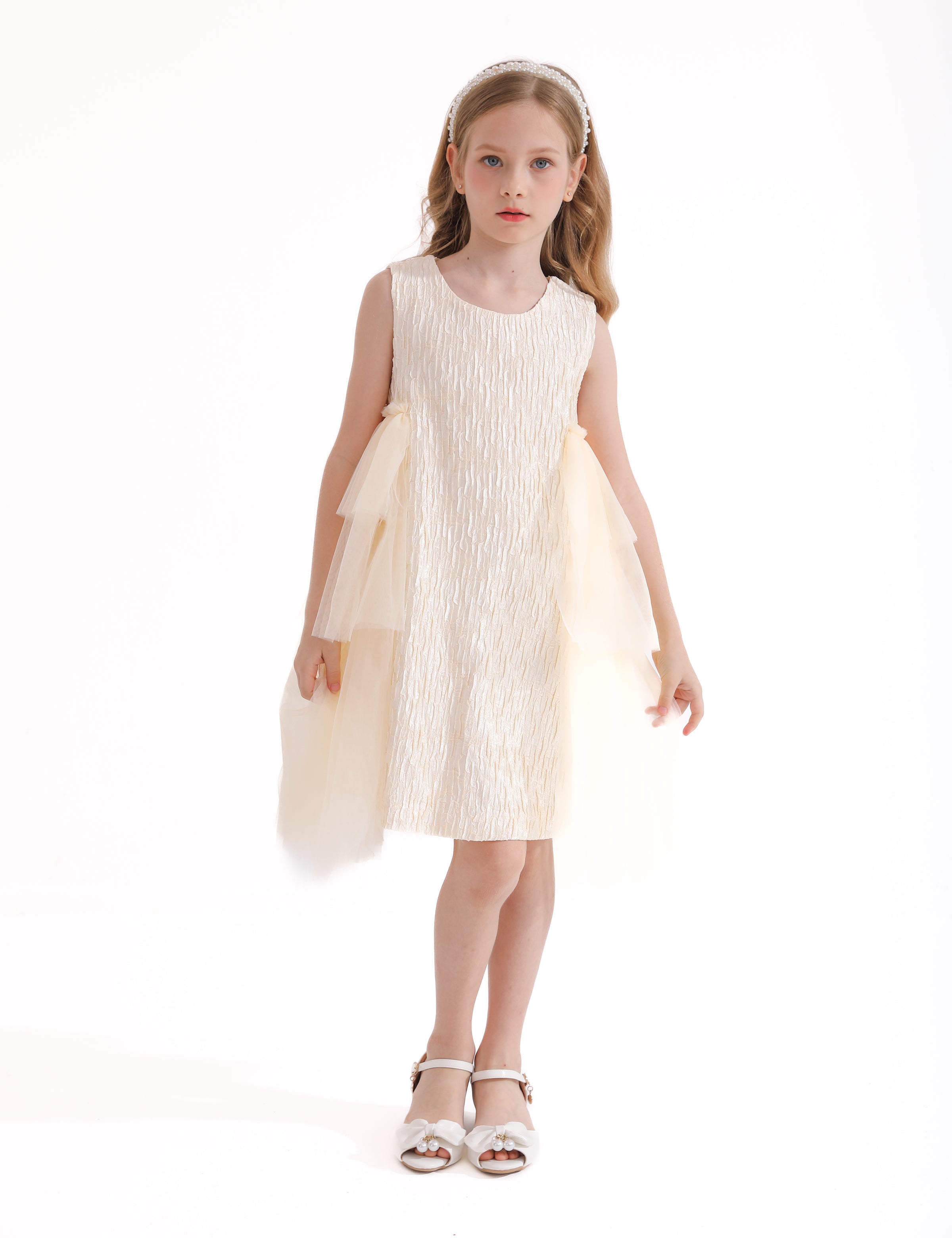The Champagne Sonata Sleeveless Ruffle Dress for kid girls from Tulleen is a stunning and elegant choice for any special occasion. This dress features a sleeveless cut with a shimmer bodice in off white, adding a touch of sparkle and sophistication. Firstly, the round neck provides a classic and comfortable fit.