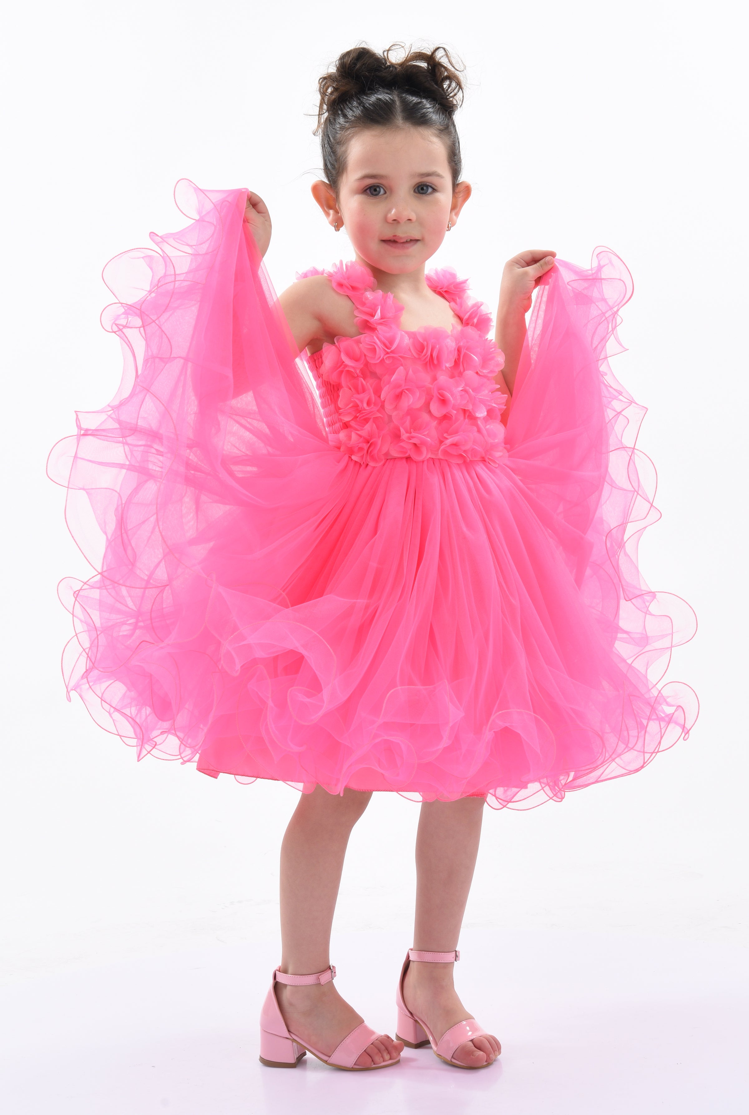 The Neon Pink Rose Campanula Dress for kid and baby girls from Tulleen is a vibrant and eye-catching choice for any special occasion.
