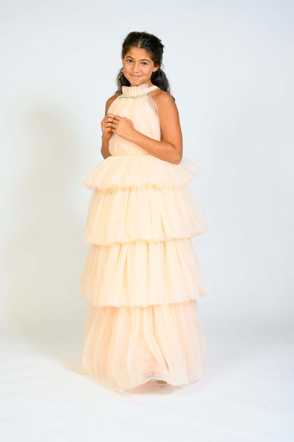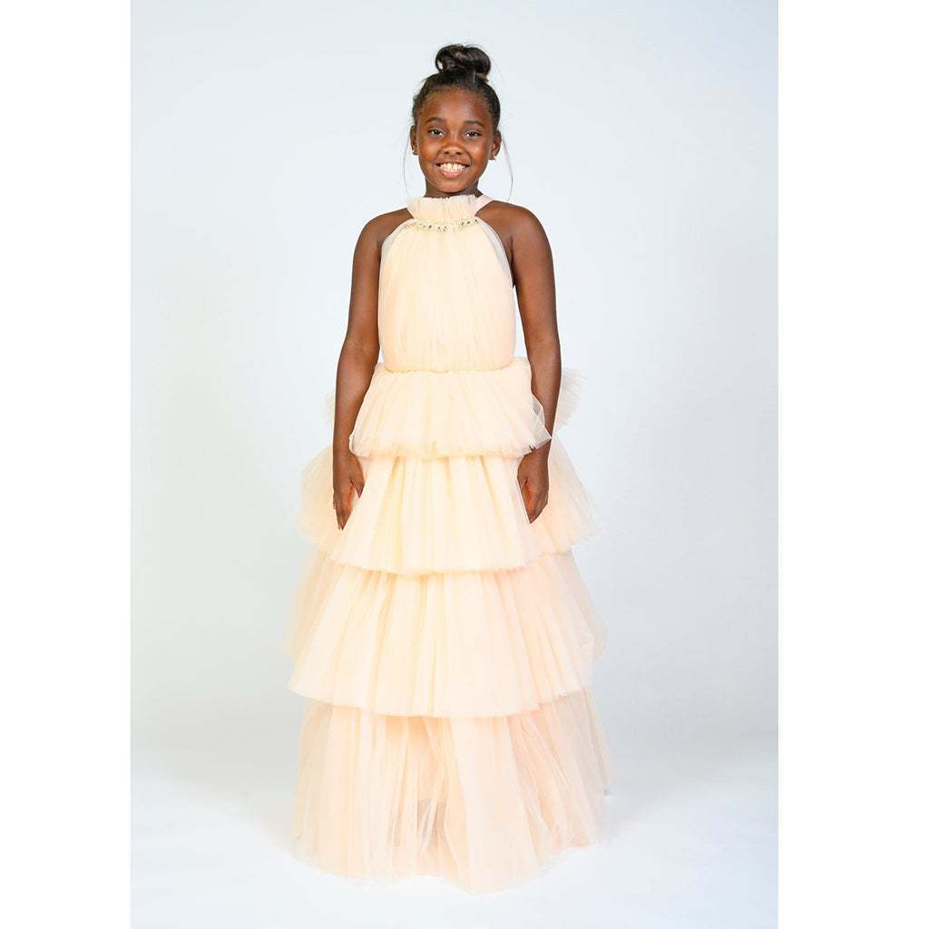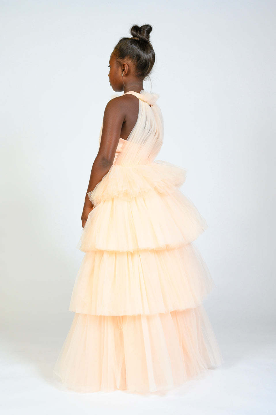 Immerse in the enchanting layers of tulle that define the Peach Francesca Dress for young girls by Tulleen. This stunning peach dress with a high-neck design is sure to capture attention and make your little one feel like a princess on various special occasions such as weddings, flower girl duties, ball gown-themed birthdays, graduations, recitals, or even during fun dress-up moments.