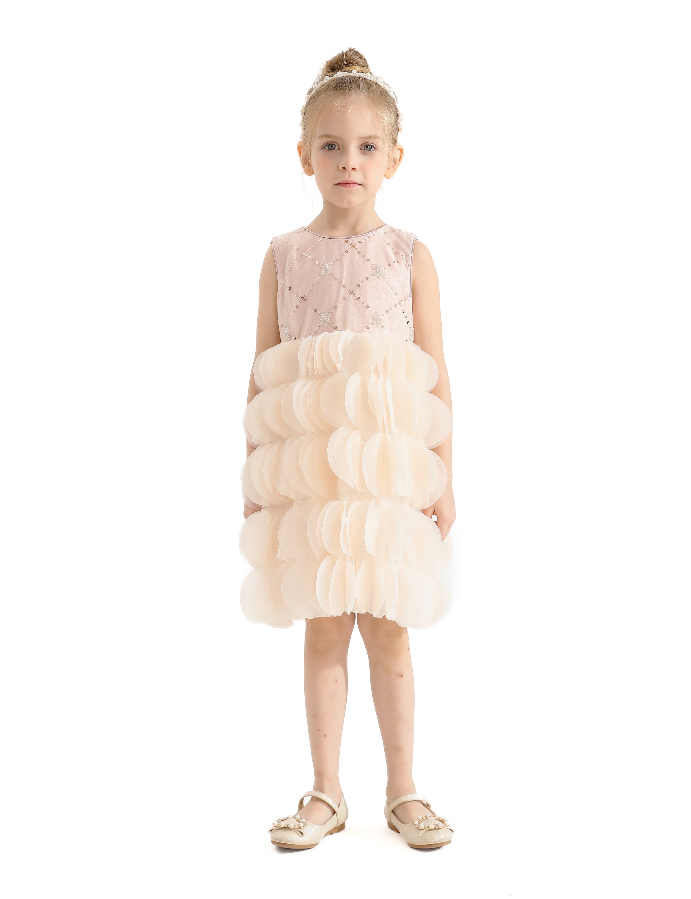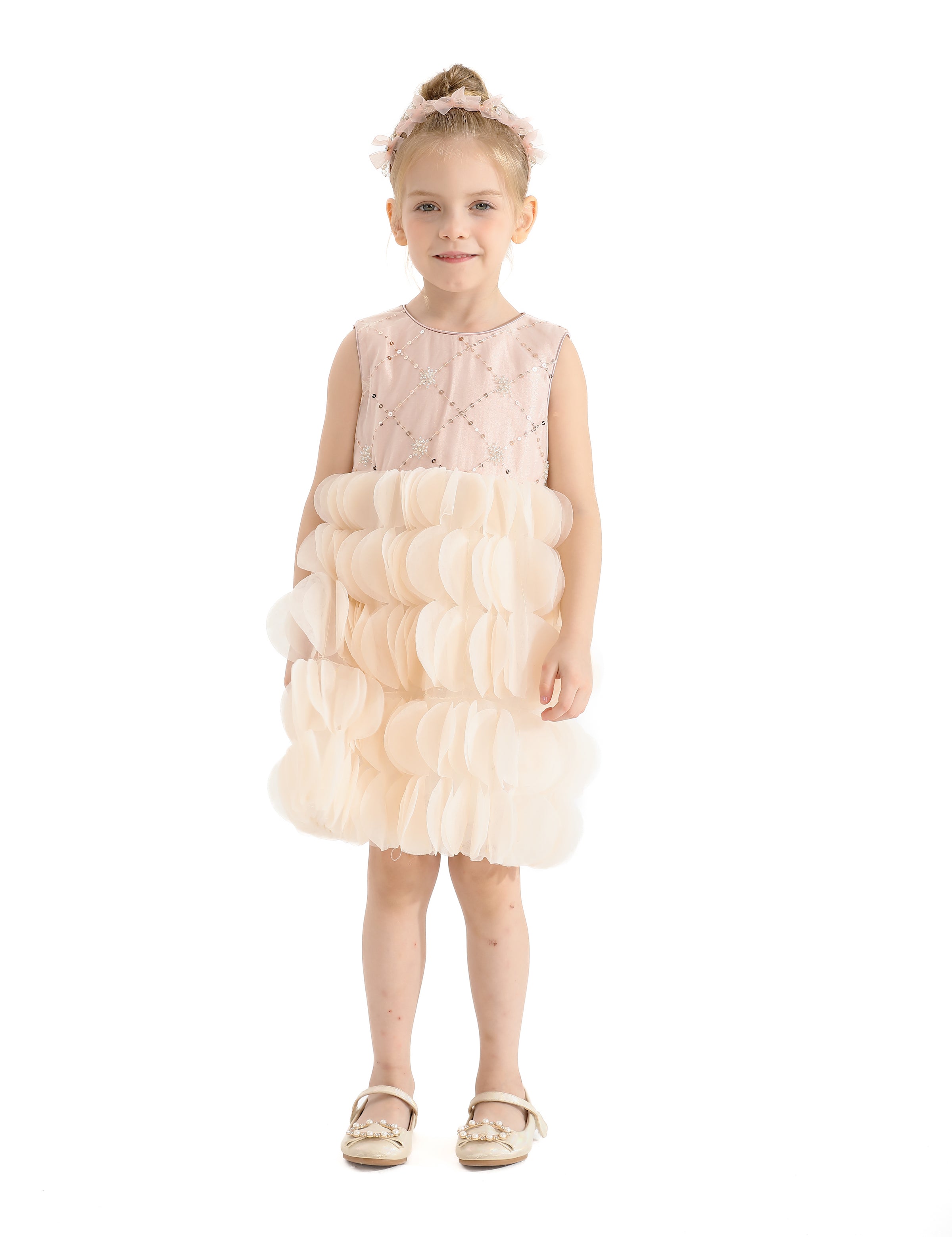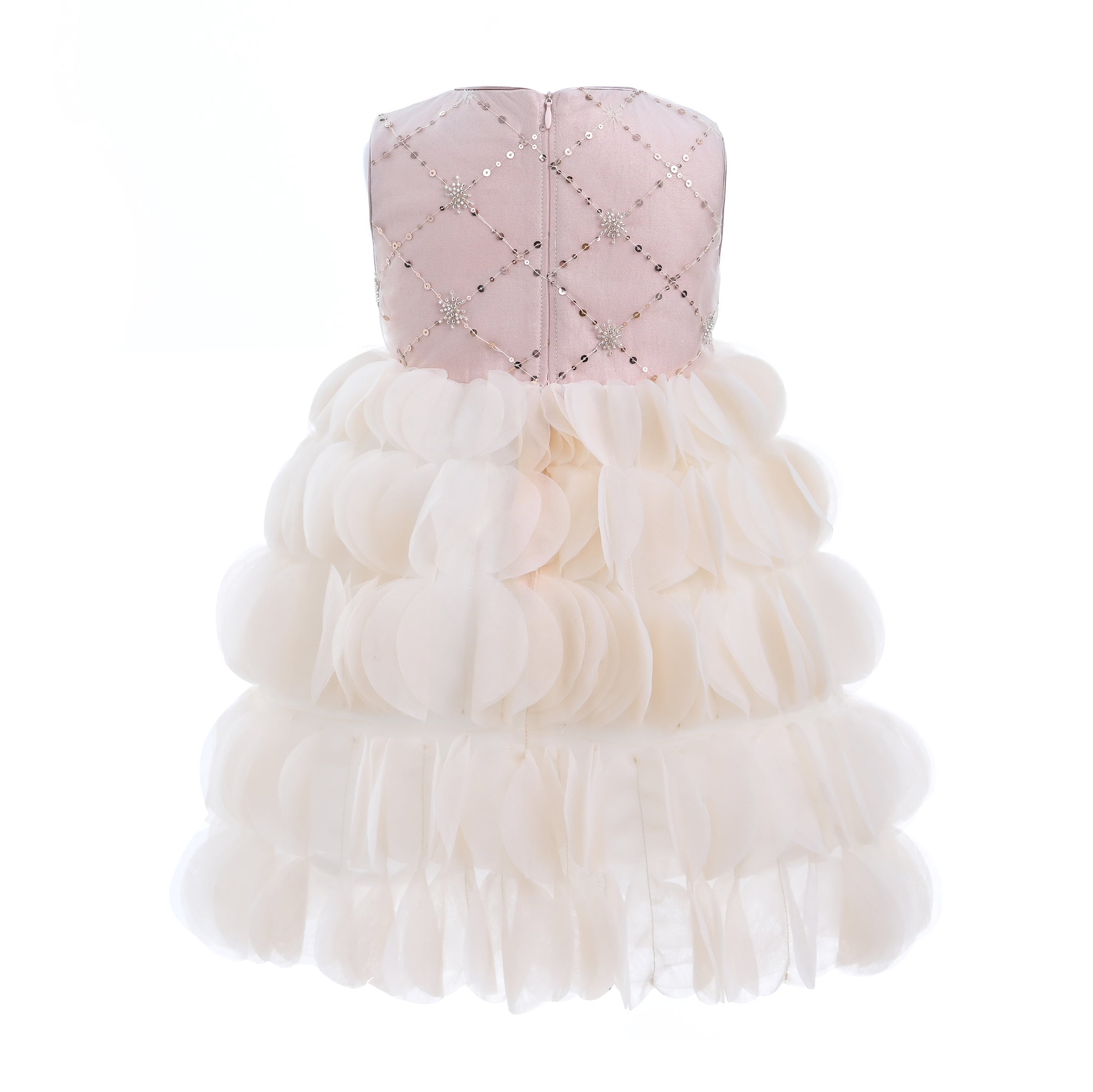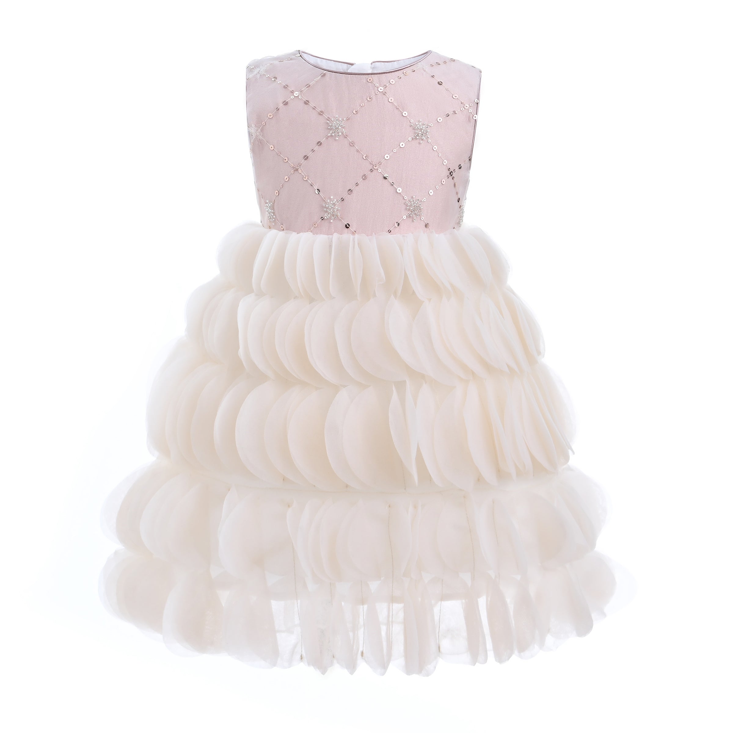 The zip closure at the back allows for easy dressing and a secure fit. Designed to be dry cleaned only, this dress maintains its quality and luxurious appearance over time. Overall, the Pink Dionne Tiered Tulle Dress combines elegance, comfort, and sparkling design elements, making it a perfect addition to any young girl's wardrobe. This dress ensures your child looks and feels special at any event.