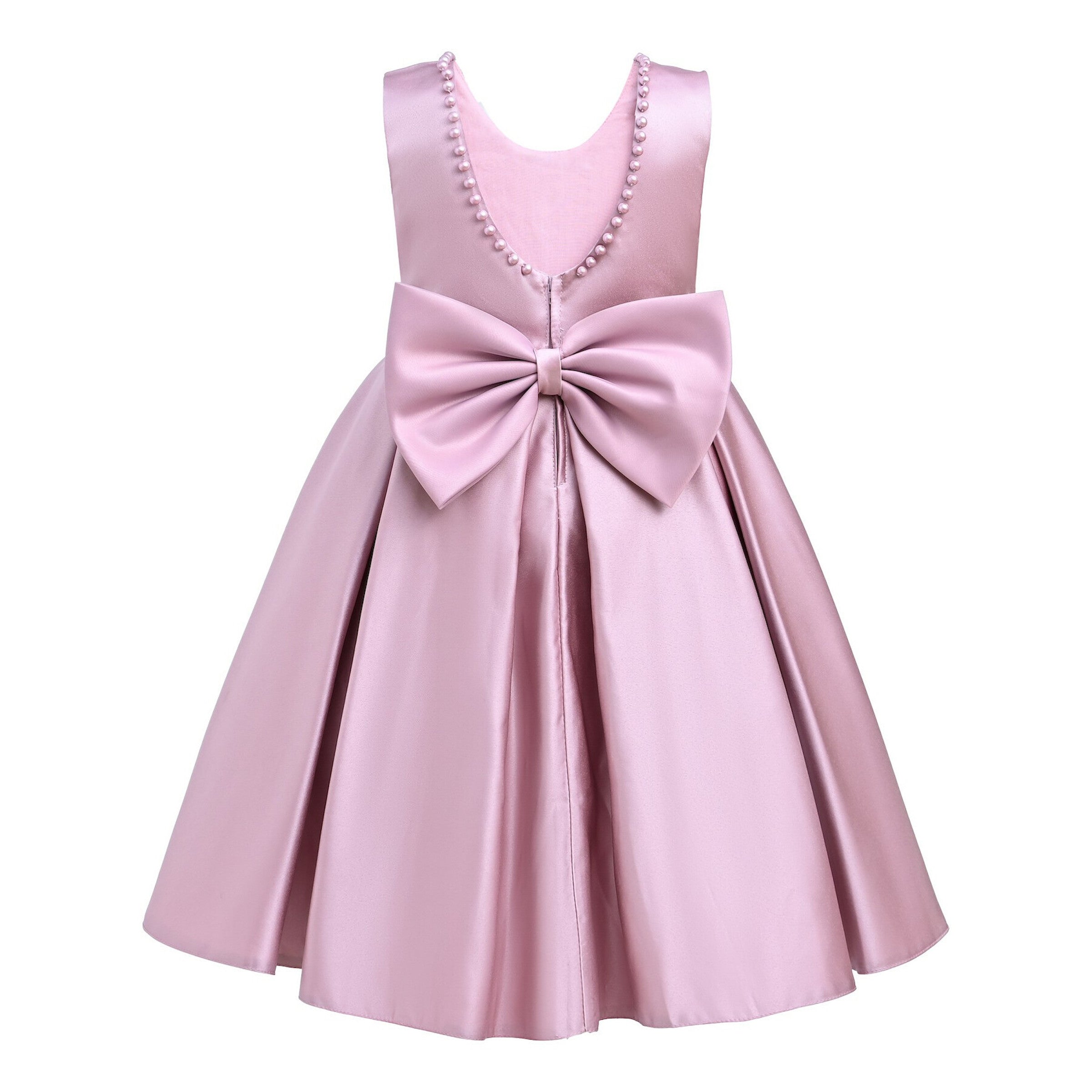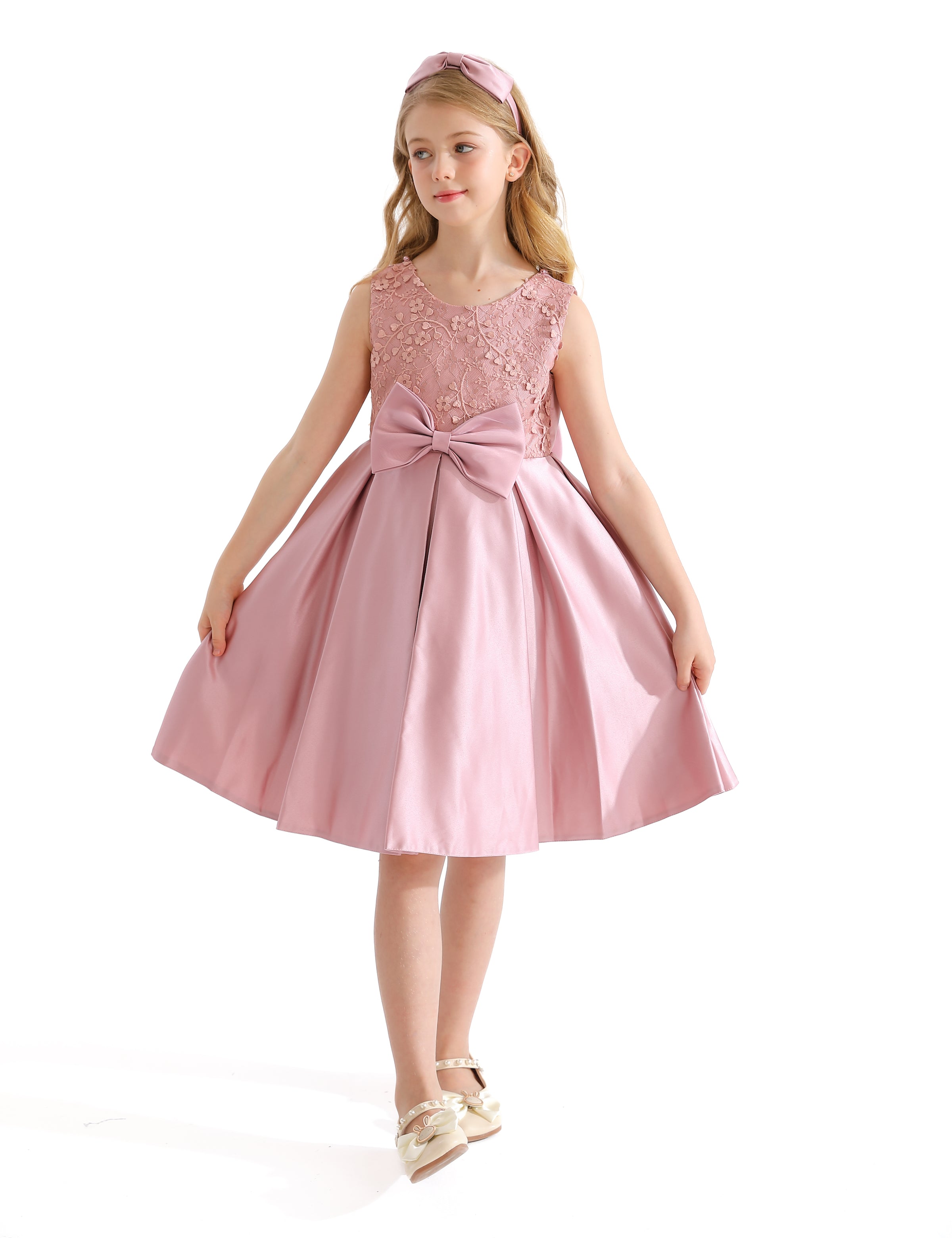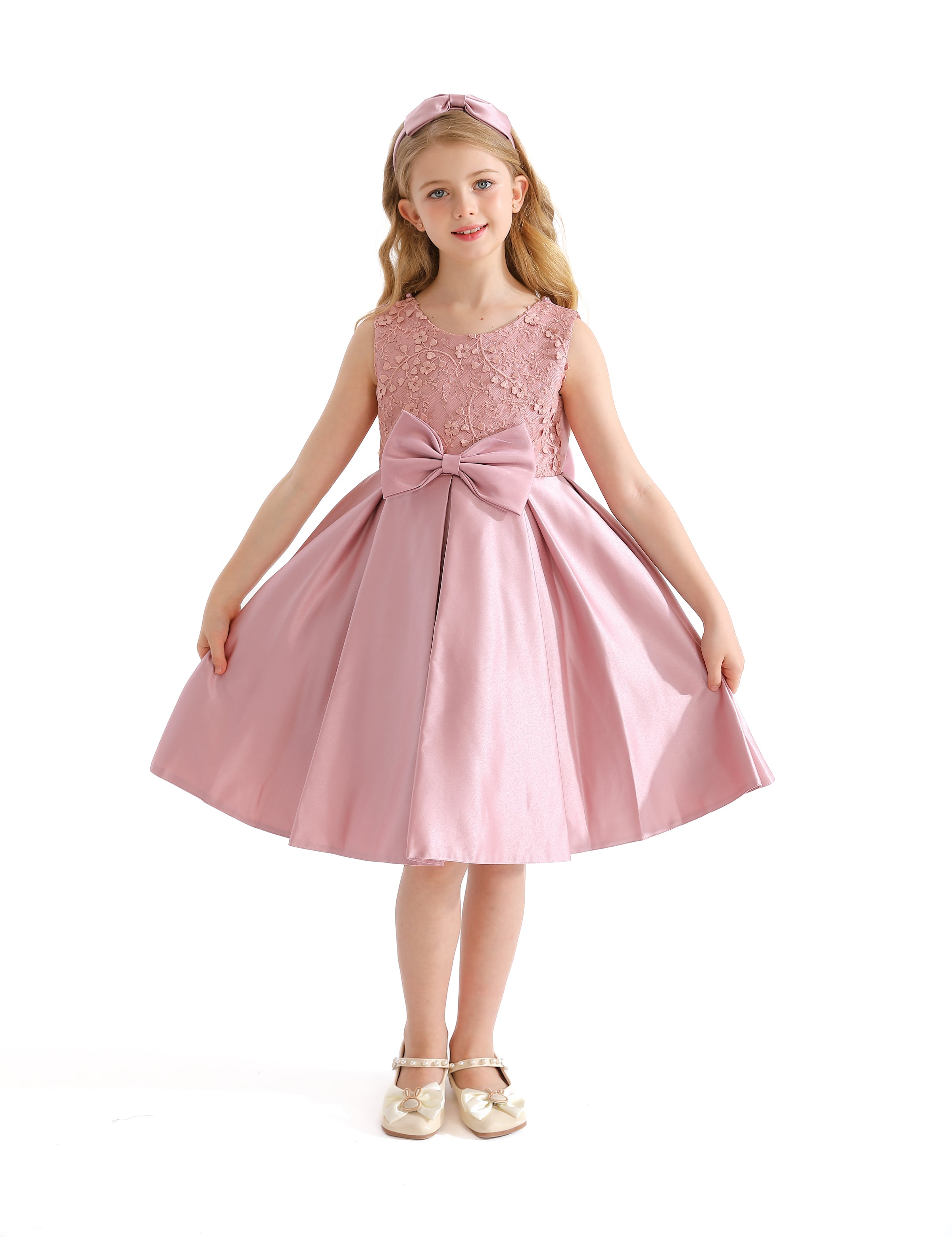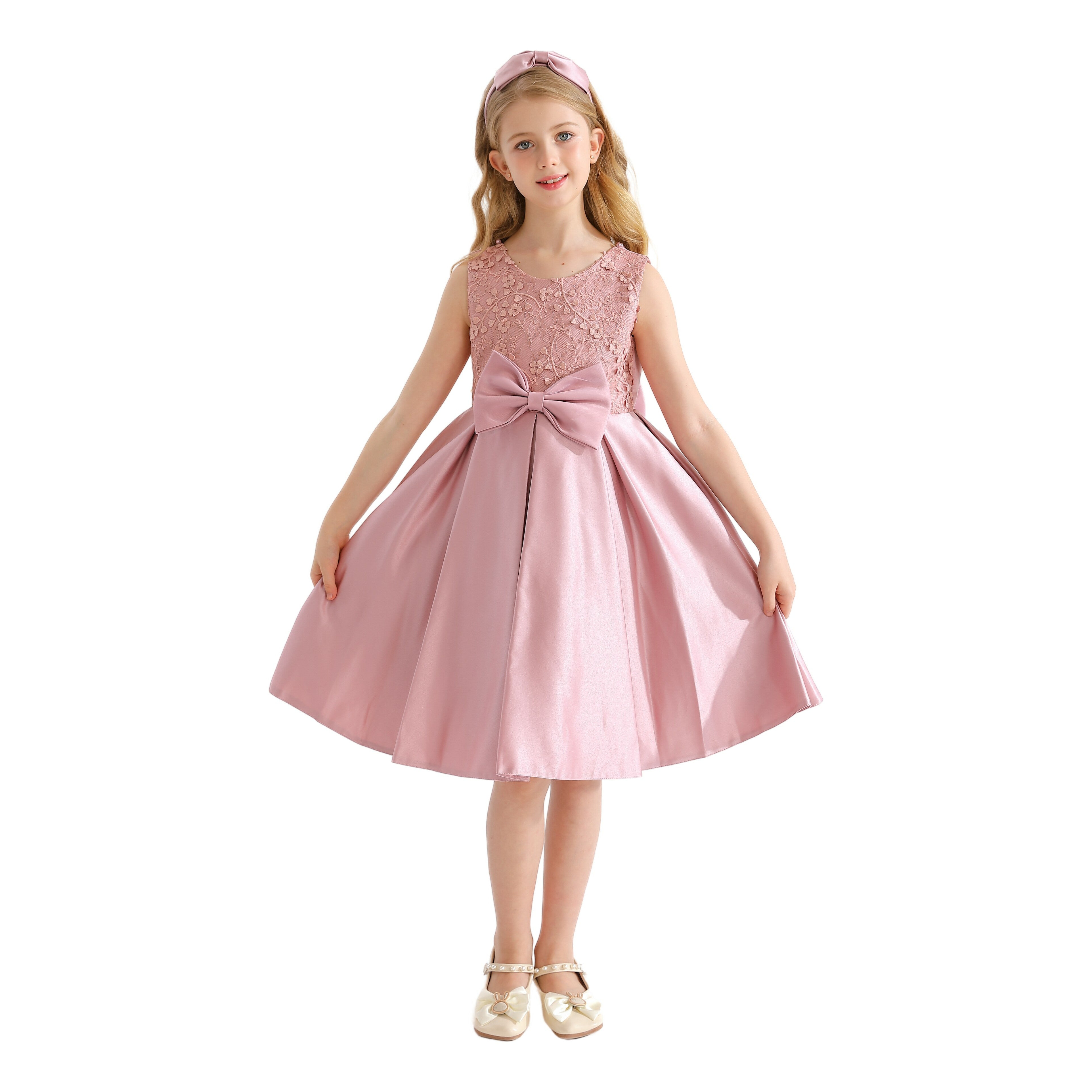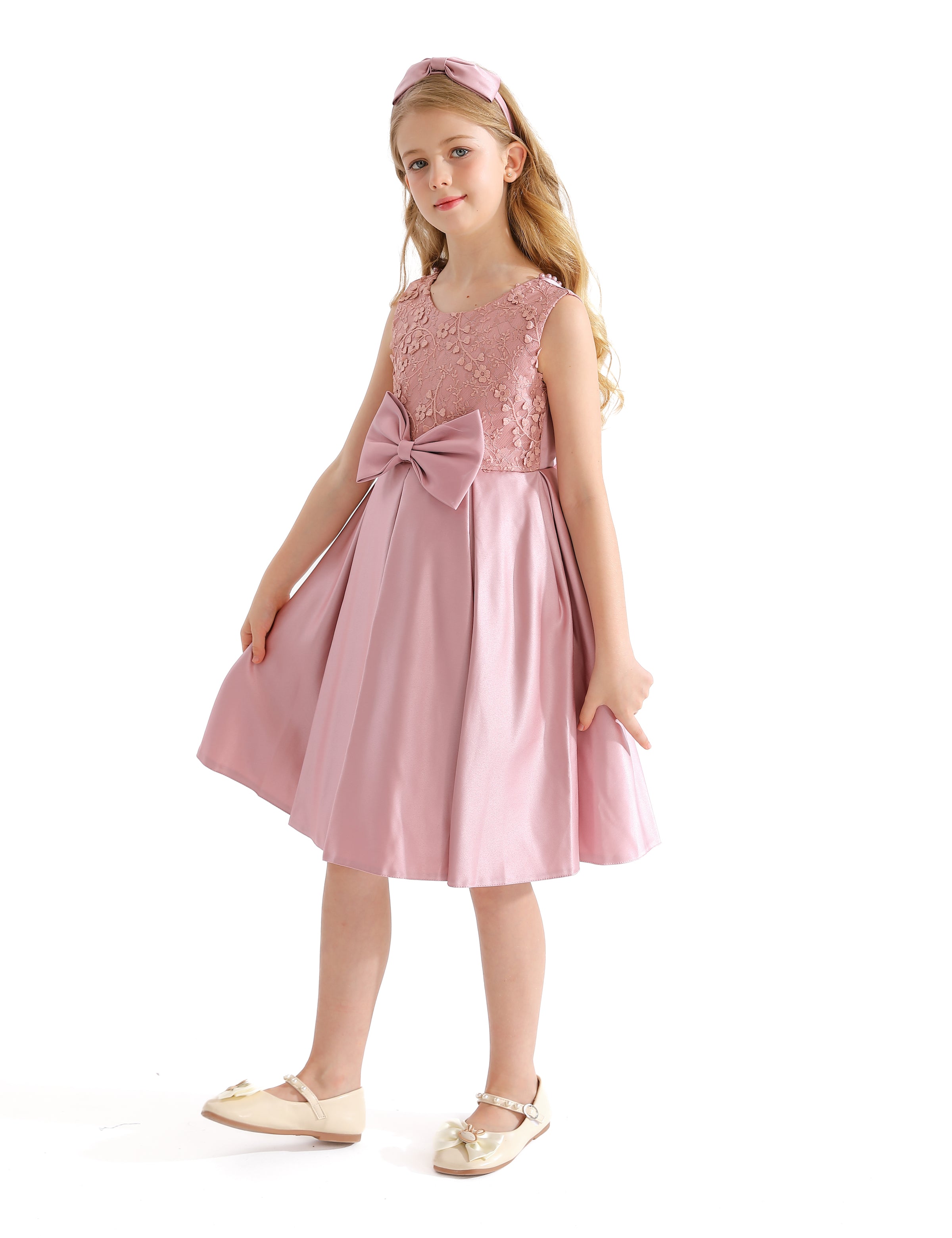 The Pink Hampton Sleeveless Double Bow Dress for kid girls from Tulleen is an elegant and charming choice for any special occasion. This dress features a sleeveless floral embroidered bodice, adding a touch of sophistication and delicate beauty. Firstly, the large bows in the front and back provide a striking and stylish accent that enhances the overall elegance of the dress.