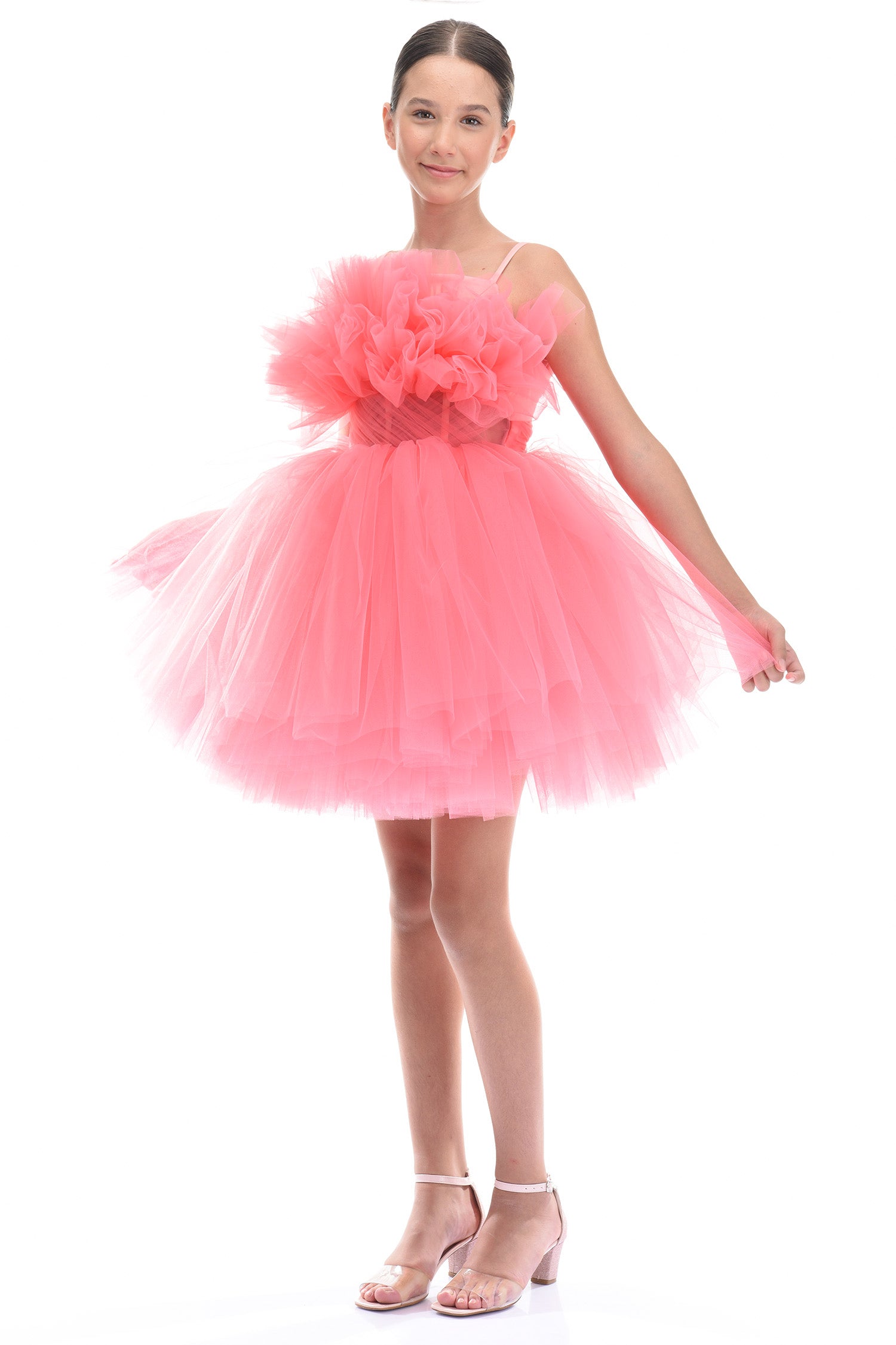 Crafted with intricate, fluffy lace ruffles, the dress offers a whimsical yet refined look, perfect for adding a touch of fairy-tale magic to any event. The ruffles cascade beautifully, creating a soft, textured appearance that adds both depth and flair.