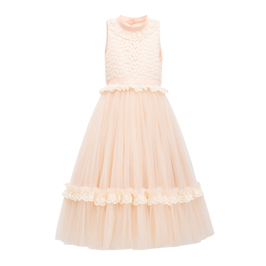 The enchantment with the Pink Peach Edina Sleeveless Overlay Tulle Gown for young girls by Tulleen. This captivating dress is the epitome of grace and elegance, making it perfect for a wide range of special occasions, including weddings, birthdays, religious events, graduations, and more. The dress features a stunning sleeveless design adorned with a soft pink and cream embroidered bodice. The intricate embroidery adds a touch of sophistication and charm, making your young girl look like a true princess. The sleeveless style allows for freedom of movement and ensures comfort throughout the event. One of the standout features of the Pink Peach Edina Gown is its mesmerizing overlay tulle skirt. The flowing peach pink fabric cascades gracefully, creating a dreamy and ethereal effect as your little one twirls and dances. The delicate tulle adds volume and movement to the gown, adding an extra touch of magic to your child's ensemble. The back of the dress features a daring and stylish V-shaped design, giving it a contemporary twist. With a convenient zip closure, the dress is easy to put on and ensures a secure and comfortable fit. The open back adds an element of sophistication and adds to the dress's overall allure.