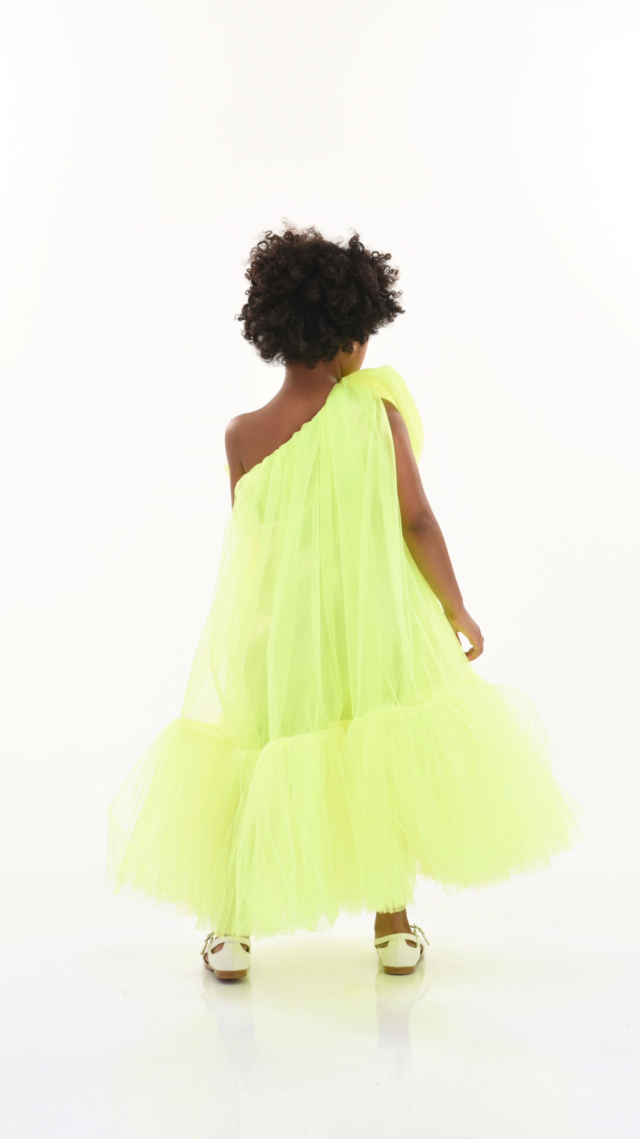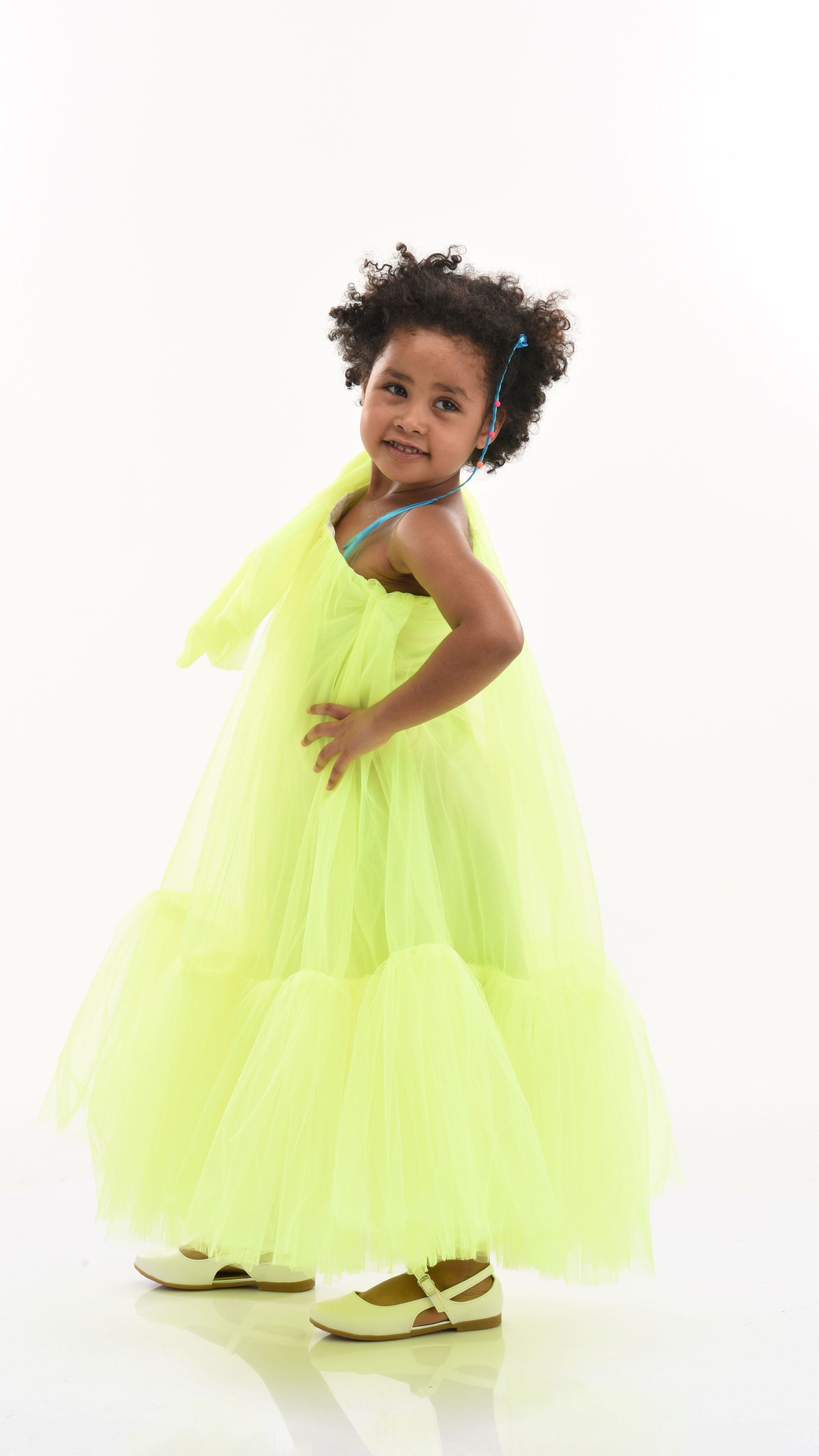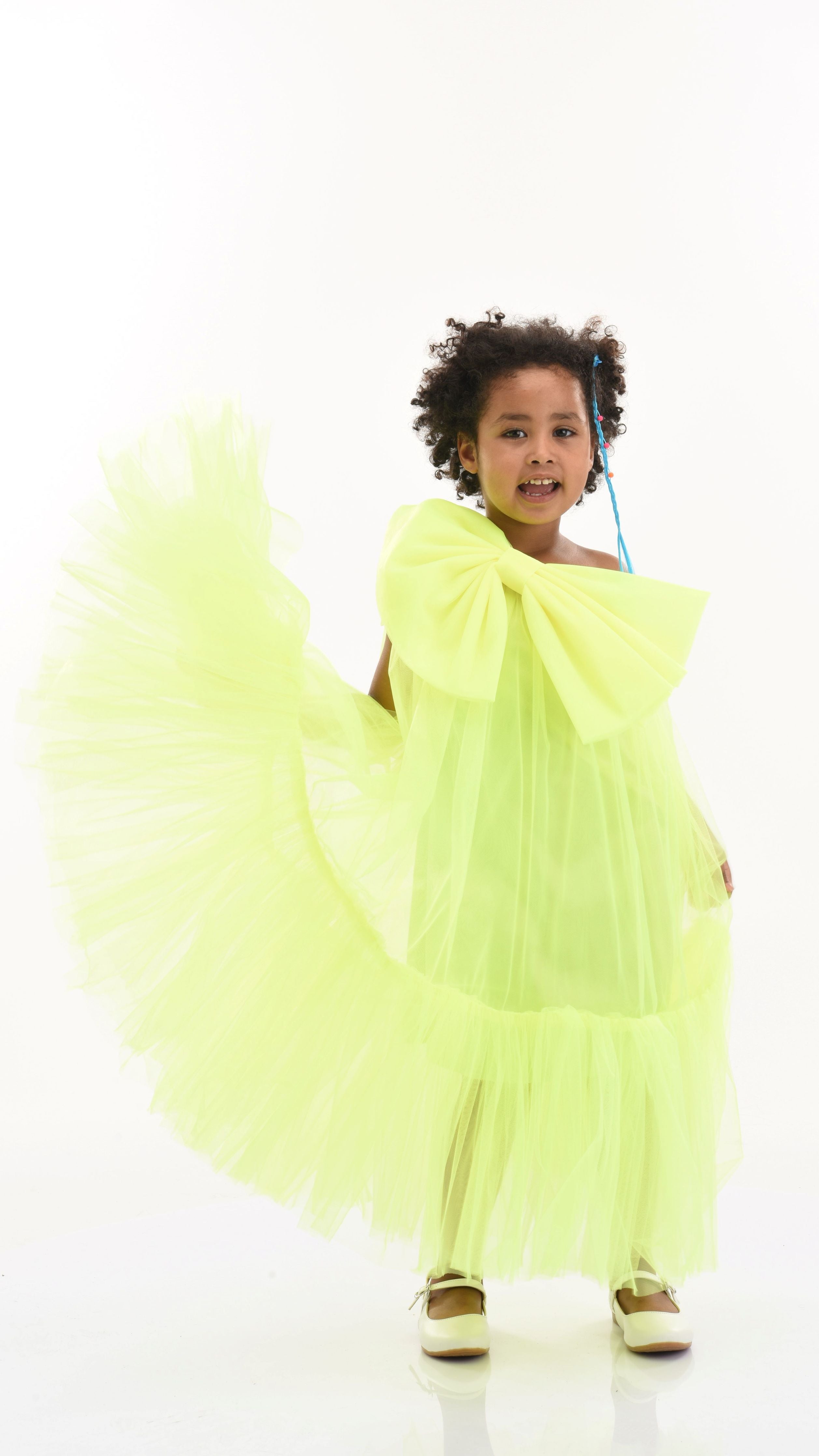 Overall, the Green Maggi Neon Bow Tulle Dress combines elegance, modern style, and playful design elements, ensuring your child looks and feels special at any event.
