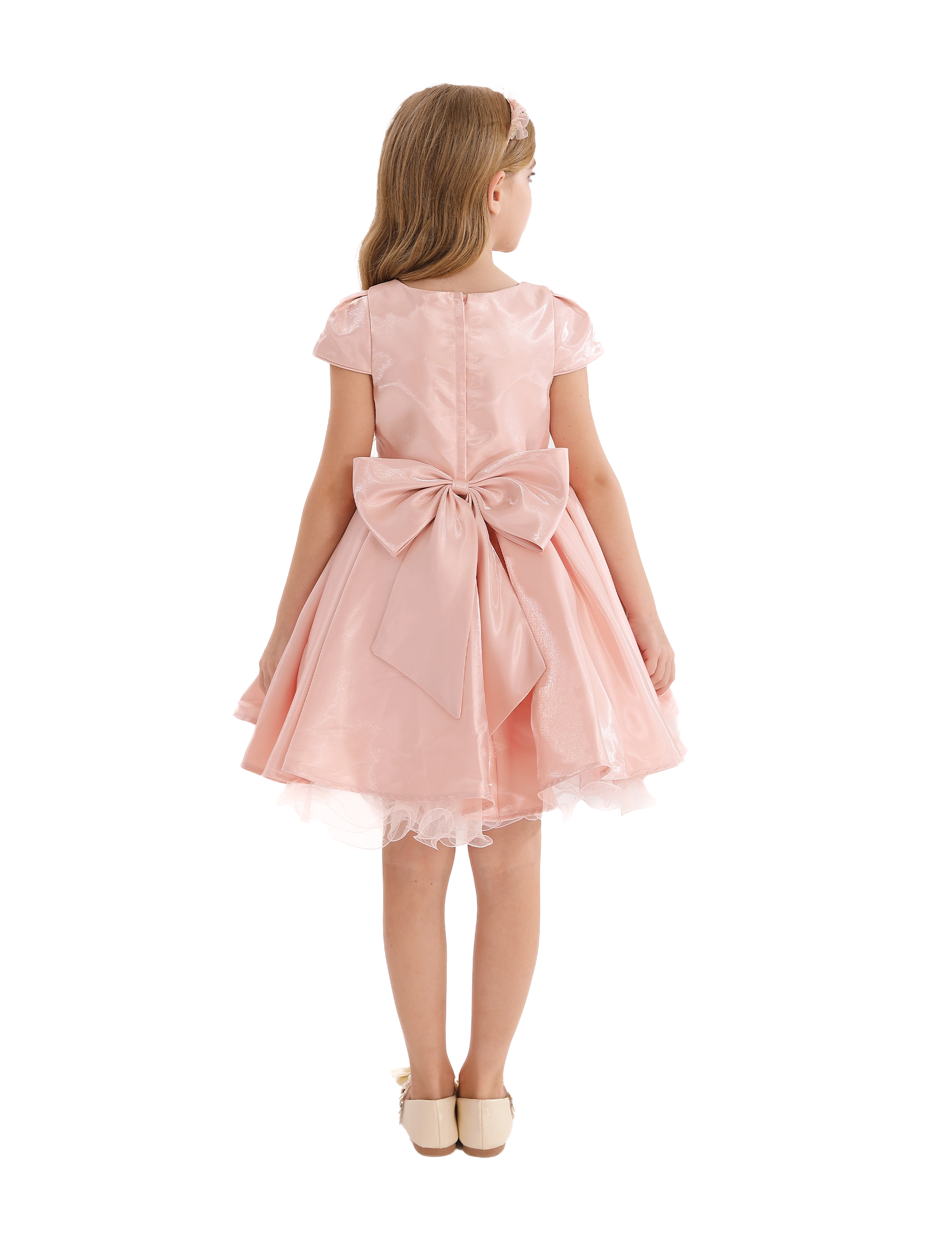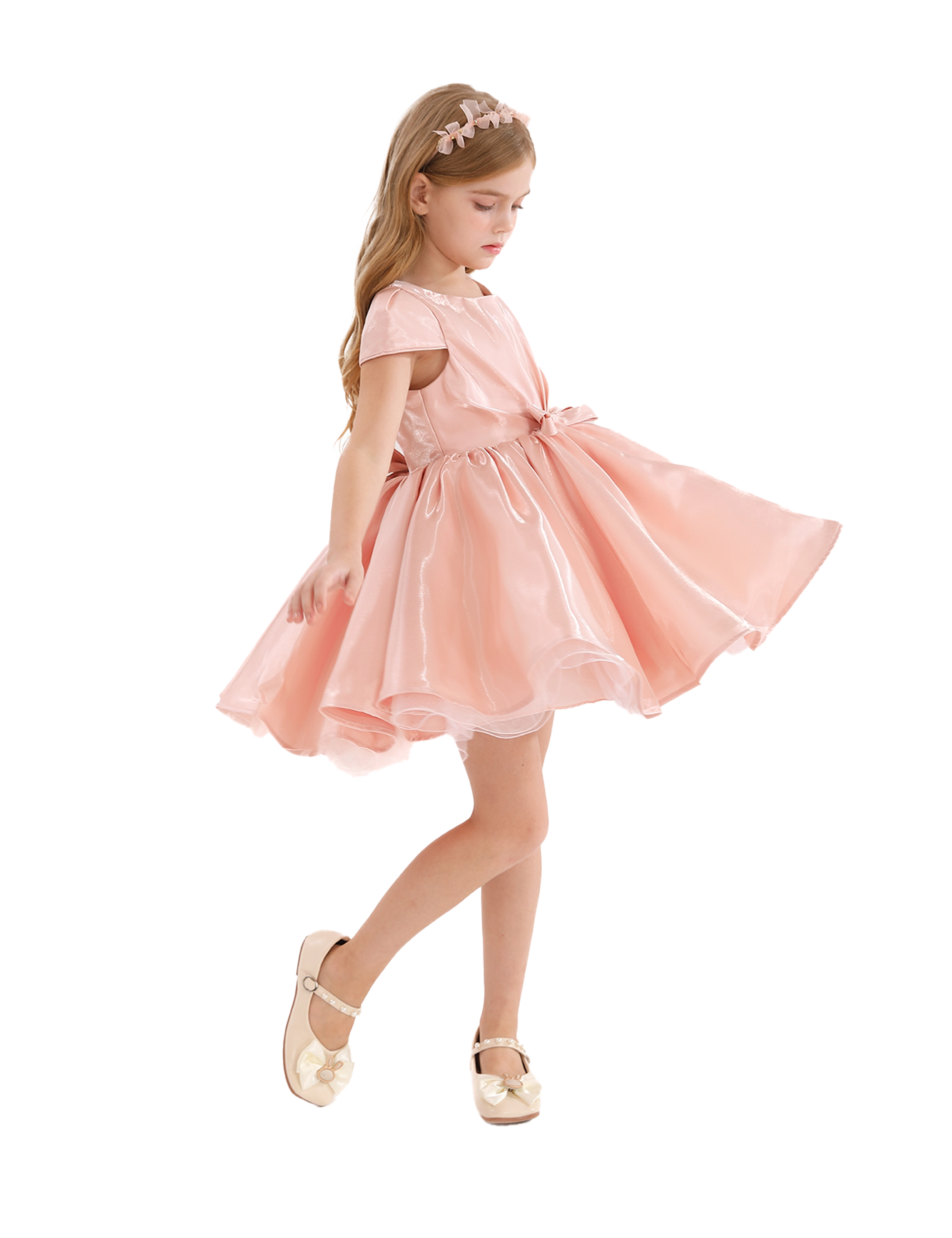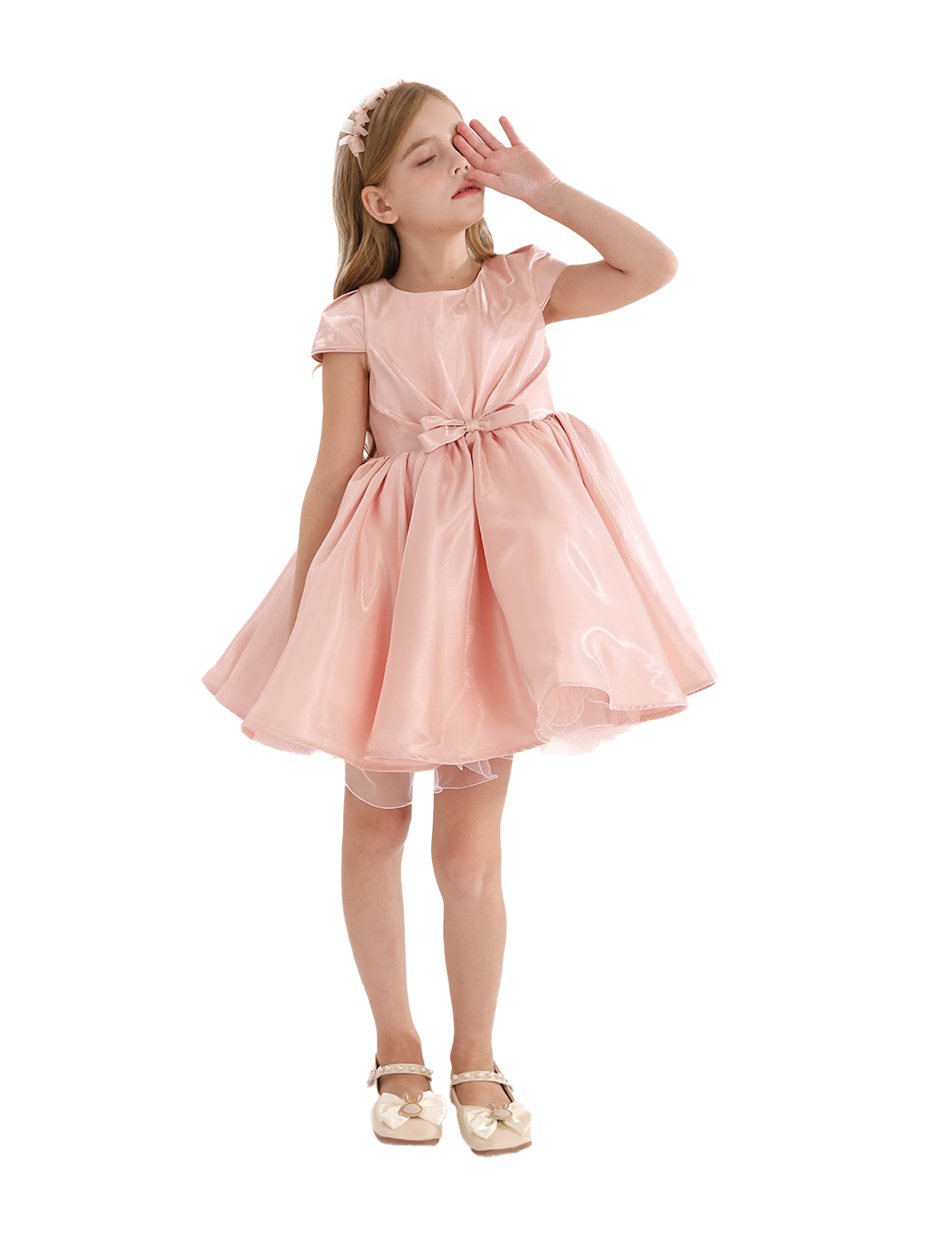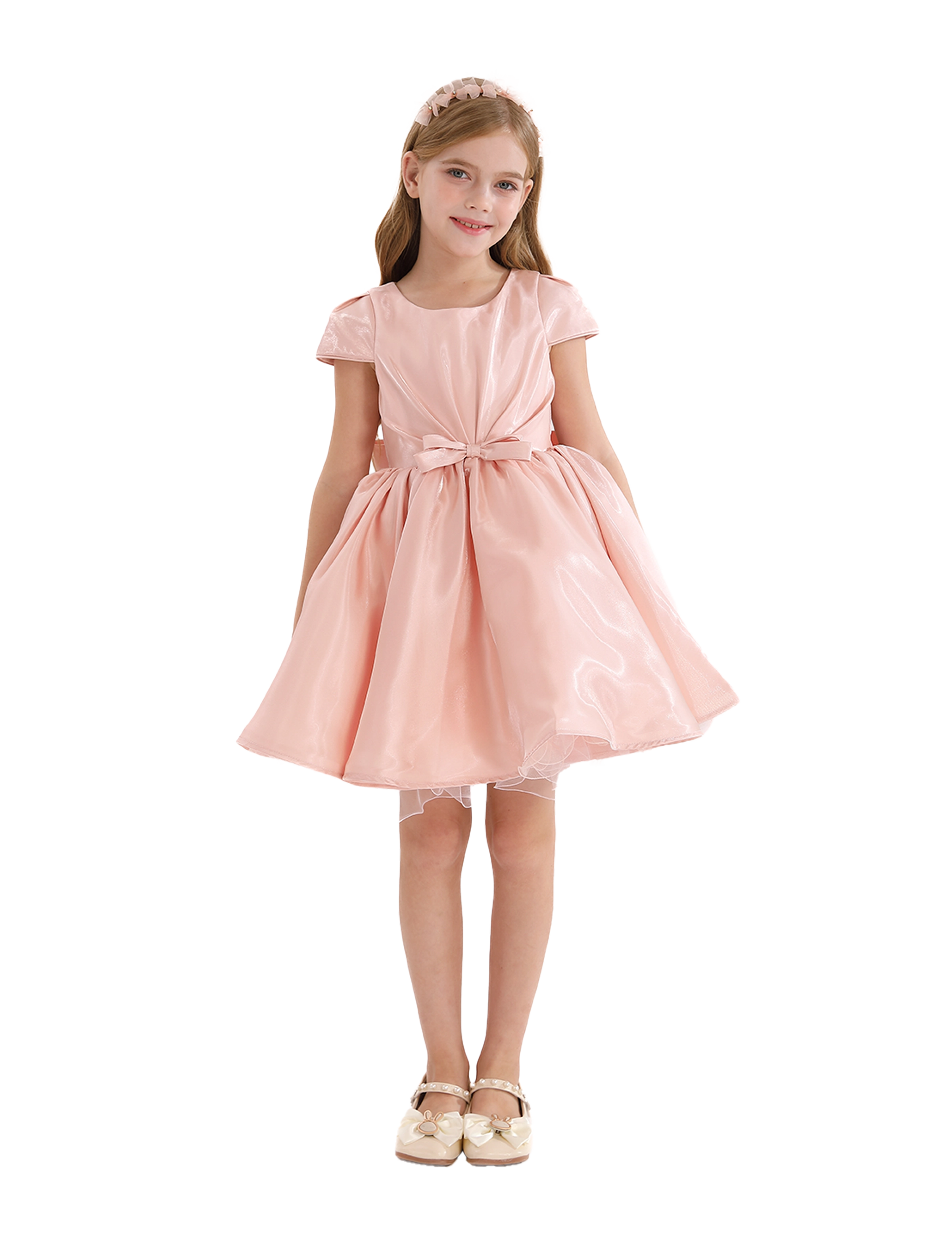 The dress features a sweet bow tie at the waist, accentuating the silhouette with a fun yet refined look. Its short design offers both comfort and style, making it perfect for any special occasion or casual outing.