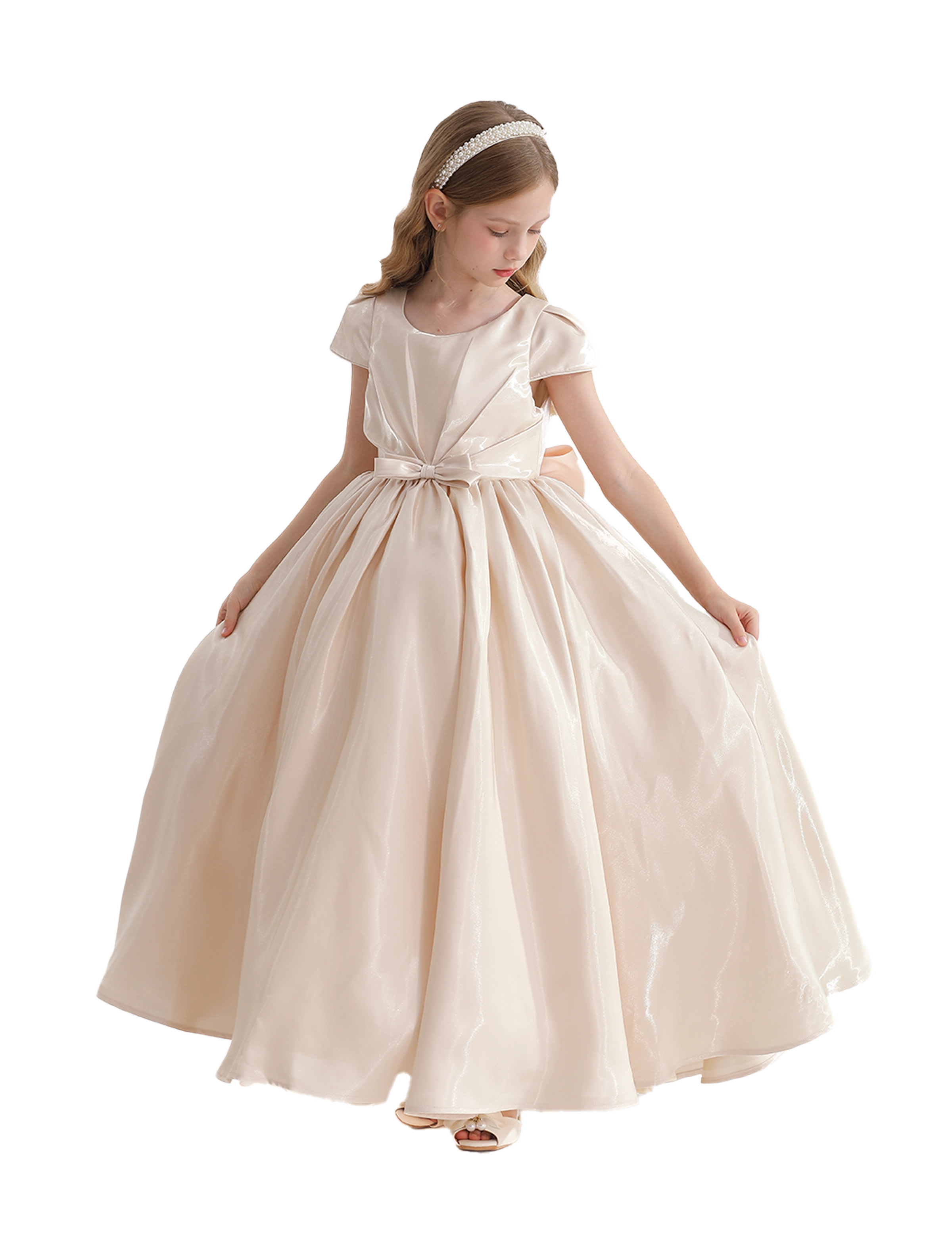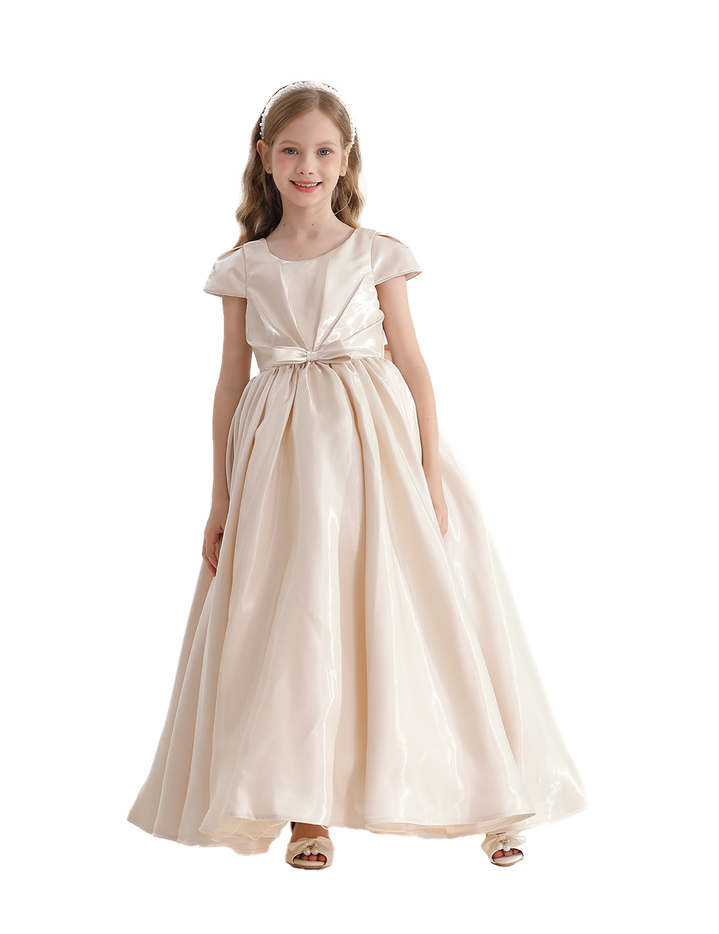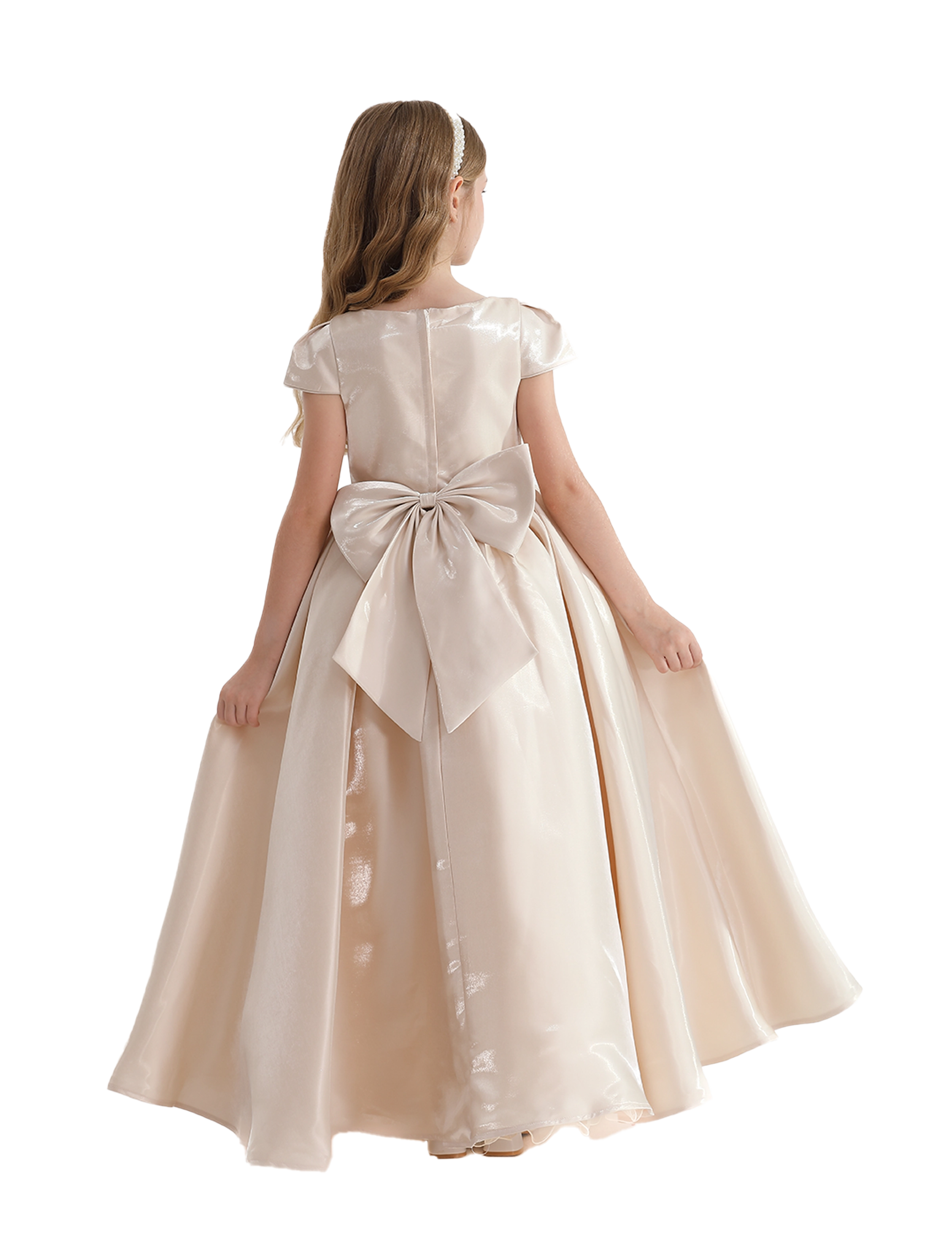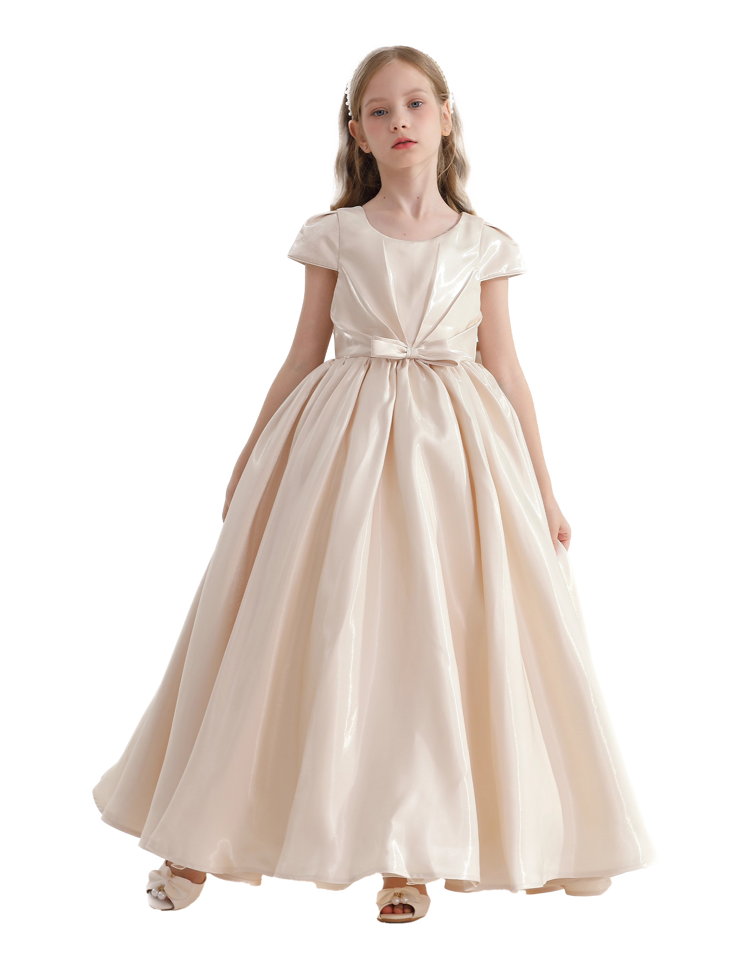 This long dress features a lovely bow at the waist, accentuating its delicate design and adding a touch of youthful elegance. The flowing length ensures a refined silhouette, making it a beautiful choice for girls who love classic beauty with a modern twist.
