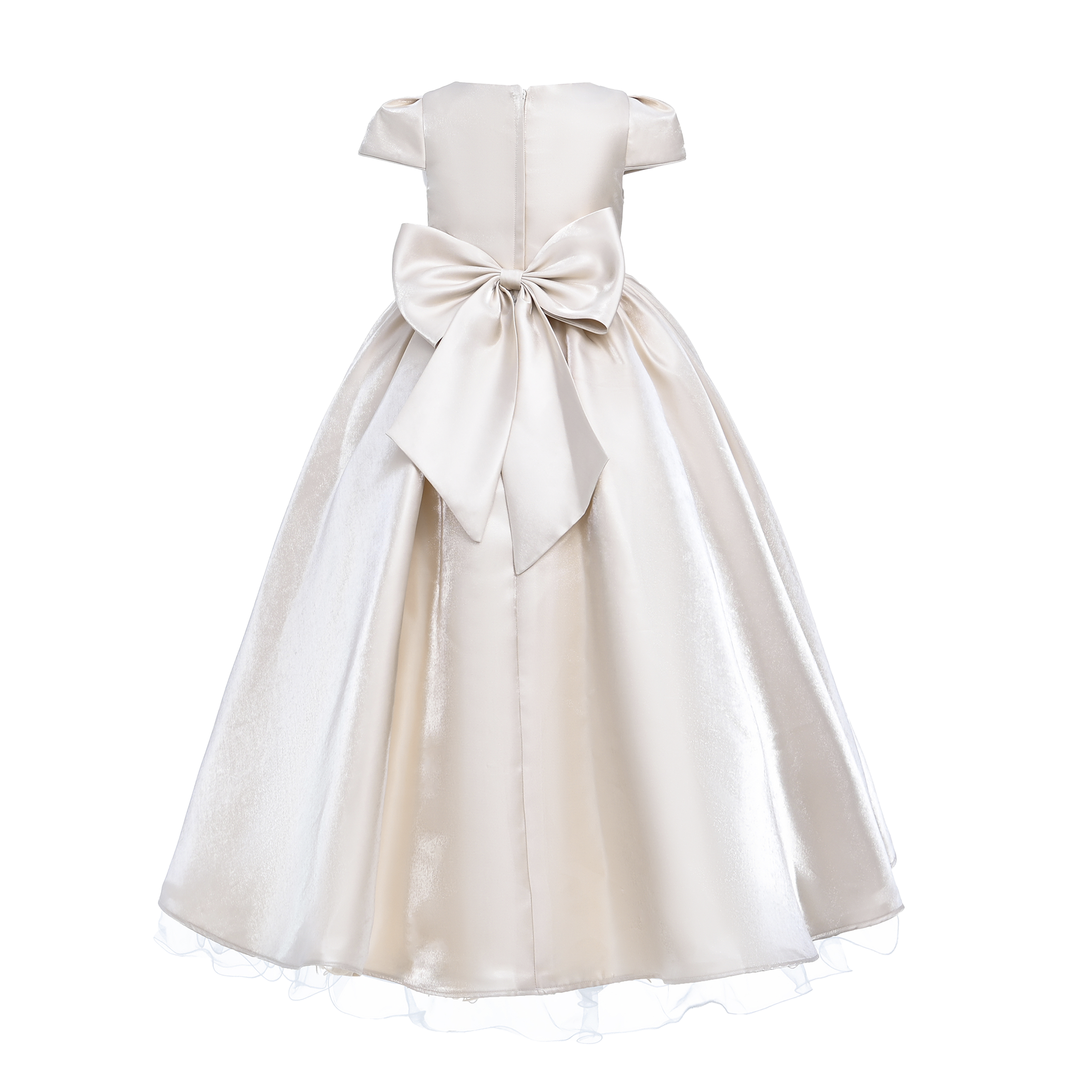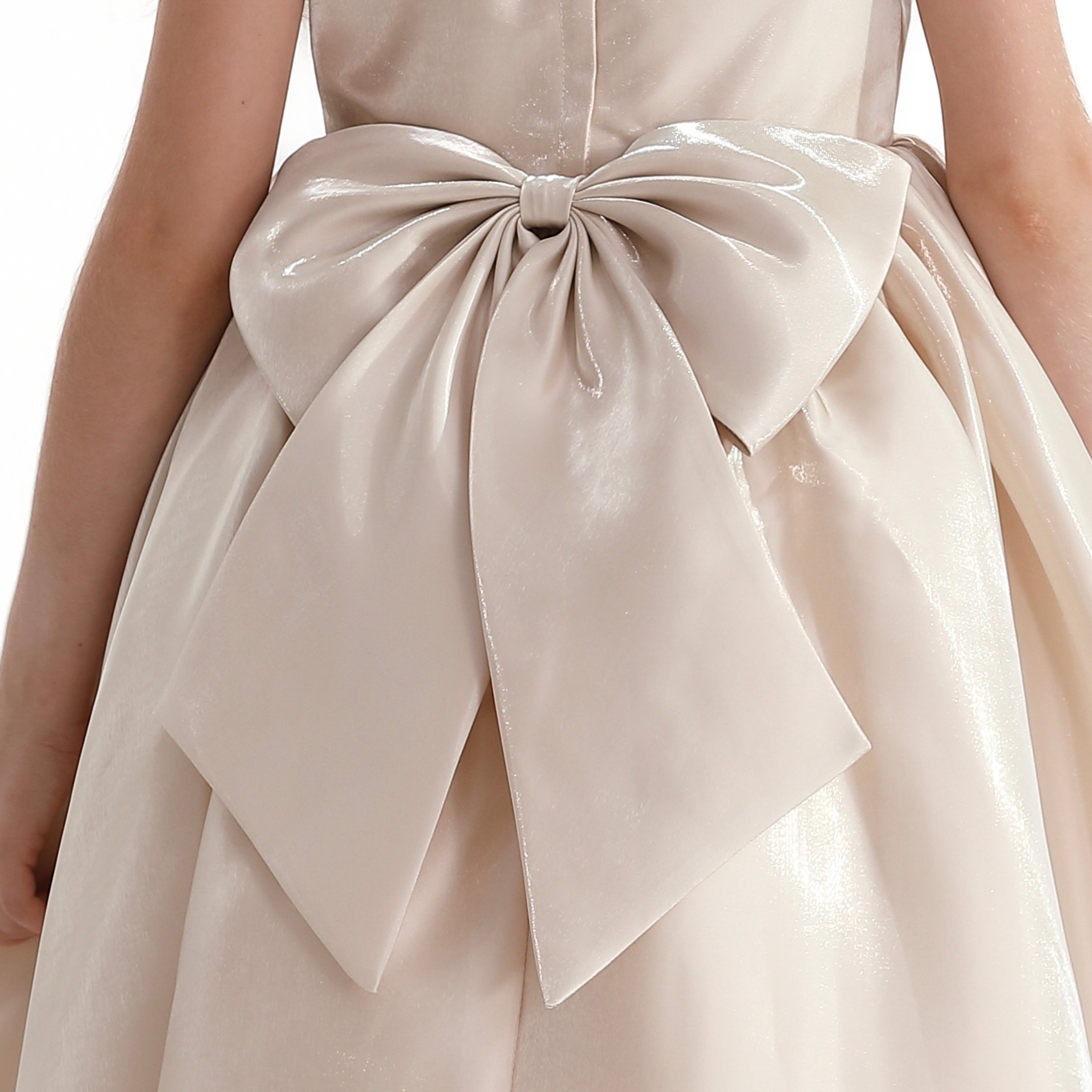 The Champagne Bow Long Brea Dress by Tulleen is the ideal option for those looking to make a stylish statement while remaining comfortable, making it a must-have addition to any young girl's wardrobe.