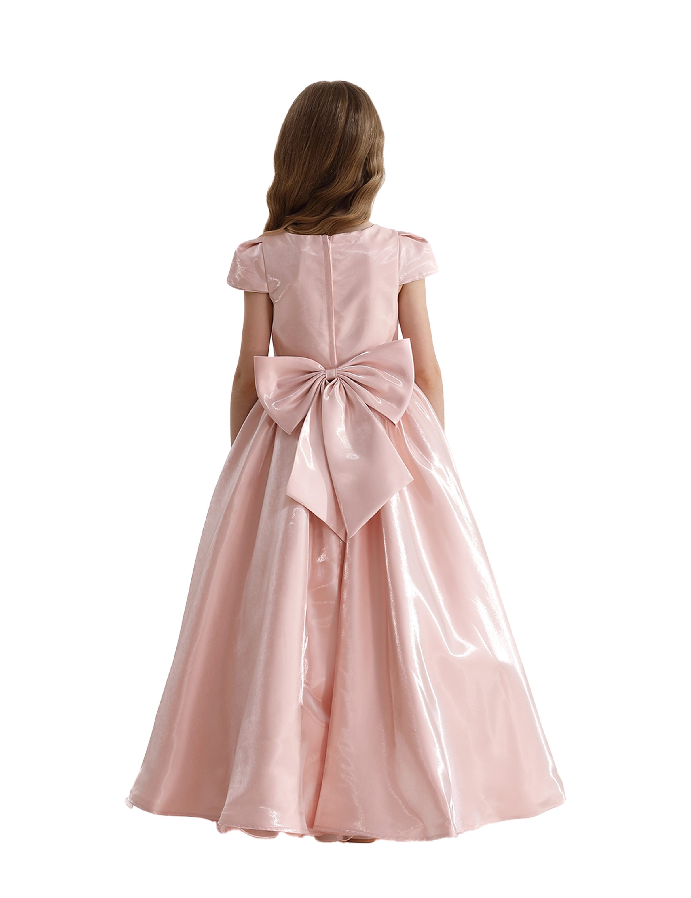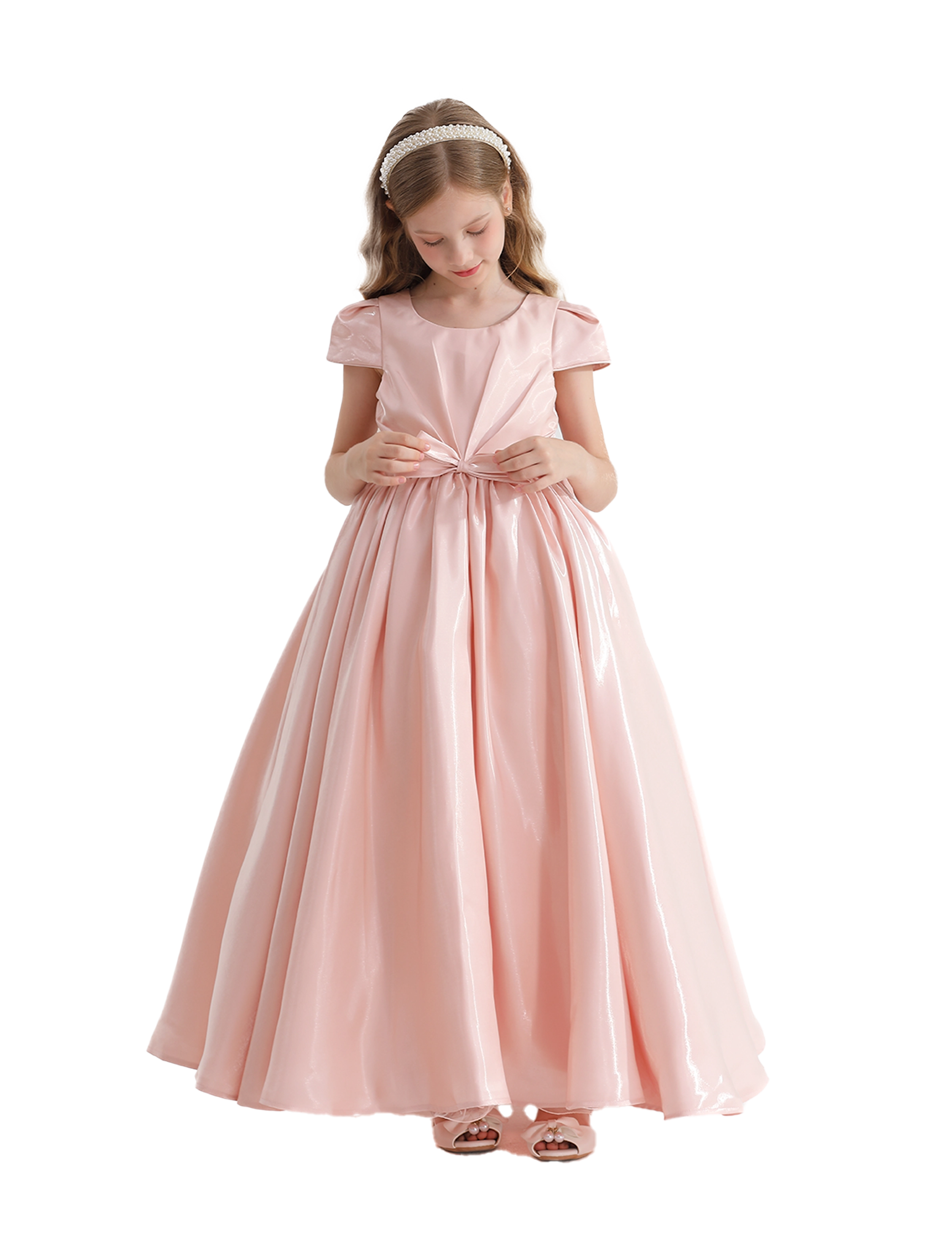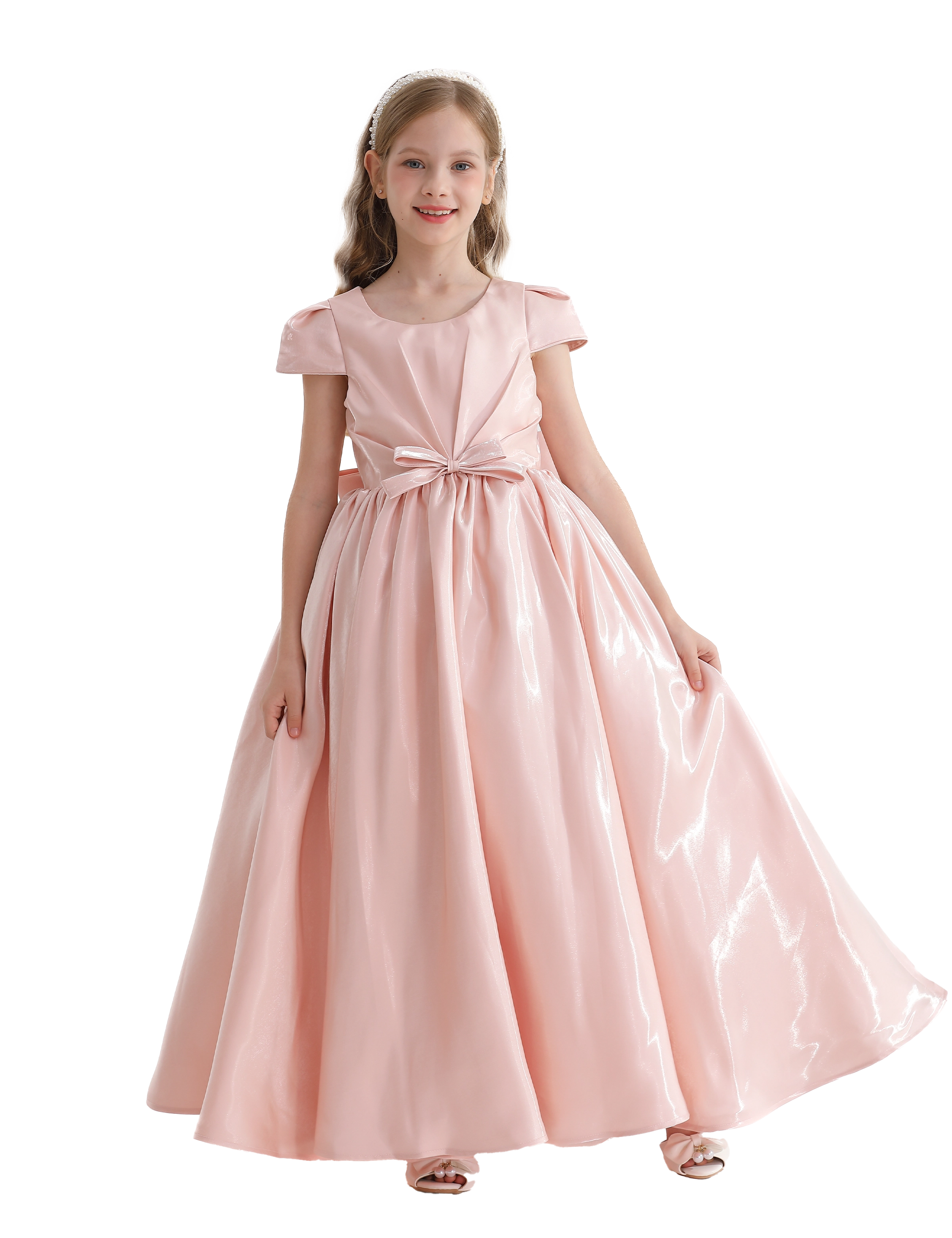 The dress features a beautiful bow tied at the waist, adding a feminine touch while accentuating the graceful silhouette. The flowing length enhances the dress's elegant feel, creating a stunning appearance as it moves.