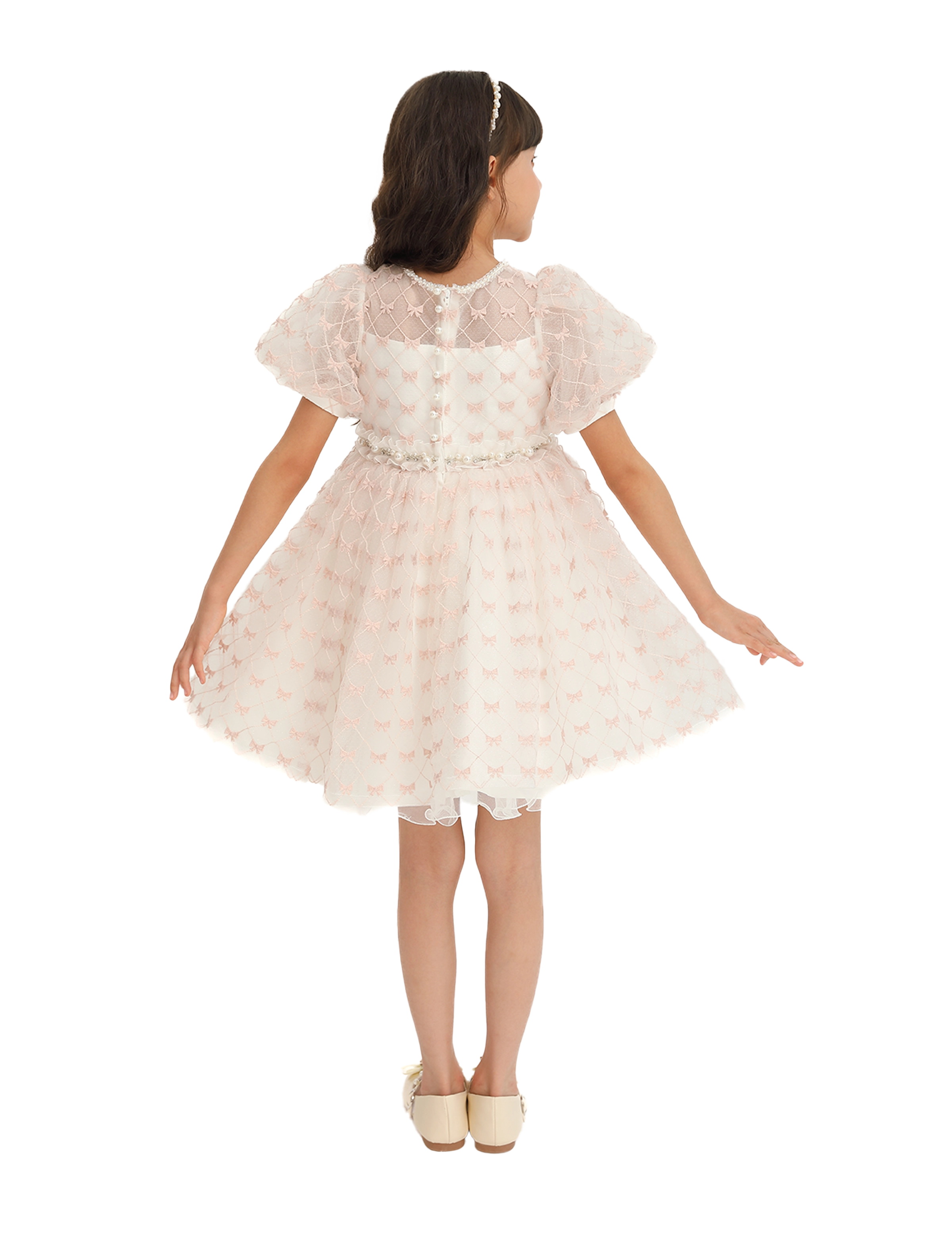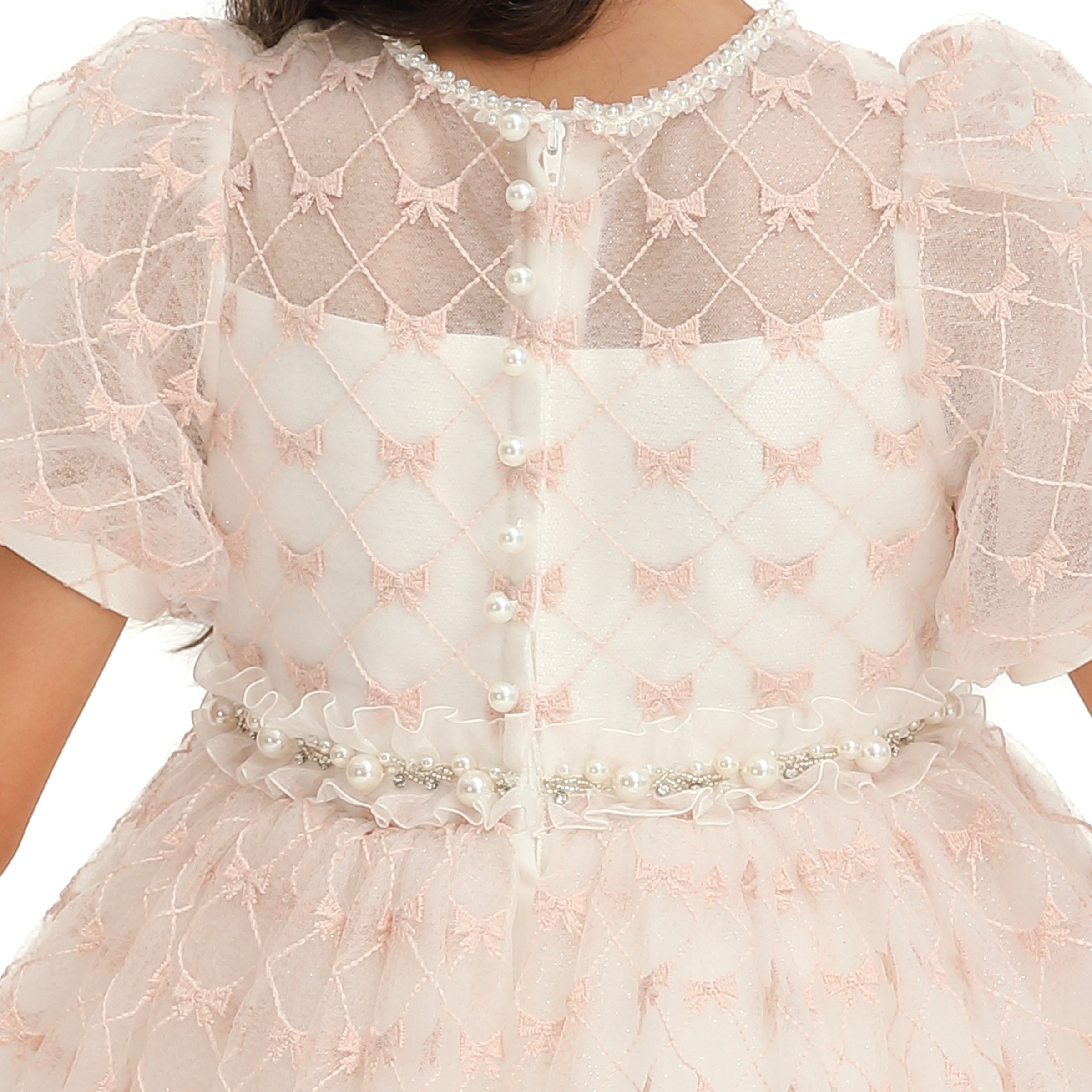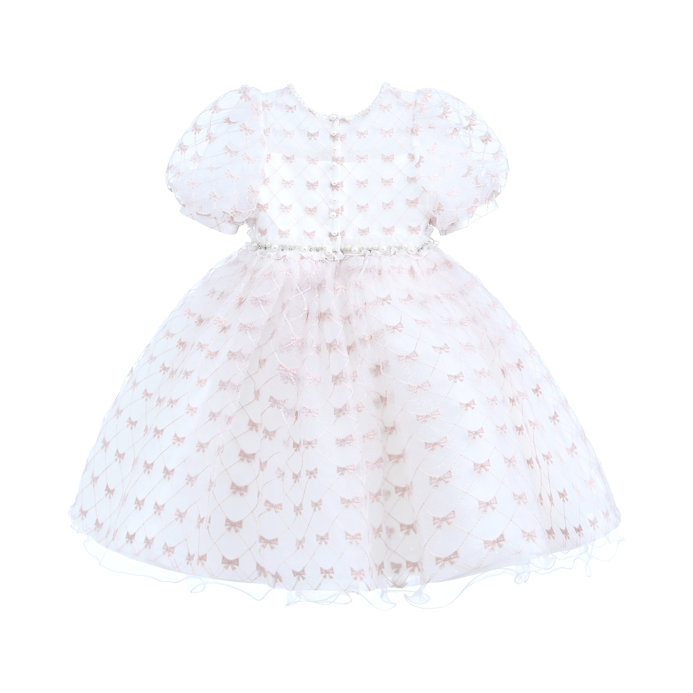 The layered tulle design creates a dreamy silhouette, making it perfect for special occasions where your little one wants to shine. The soft pink ribbons provide a subtle yet eye-catching detail, beautifully complementing the creamy ivory base.