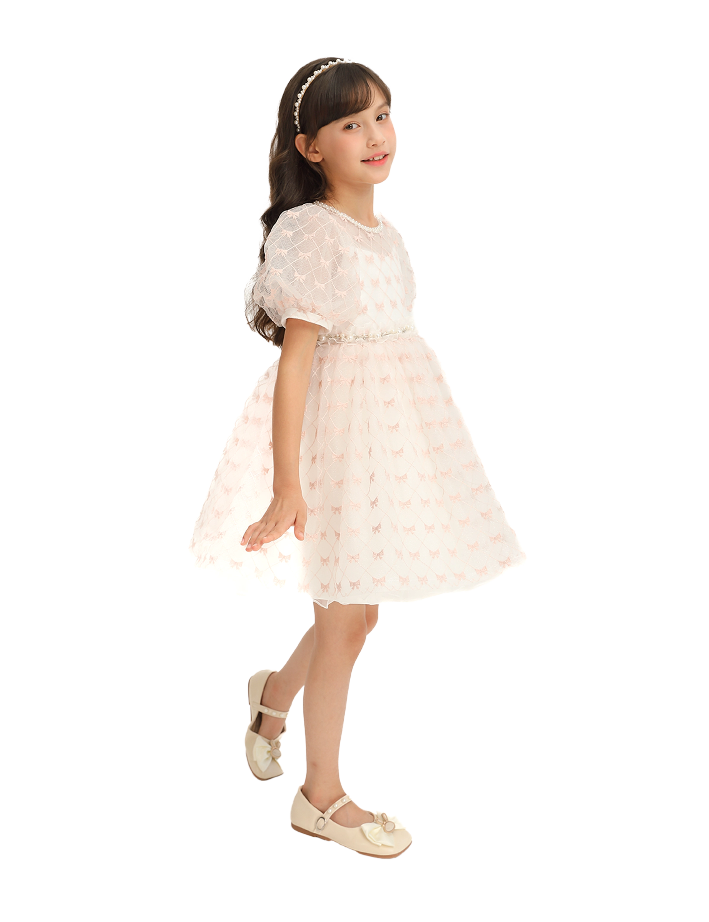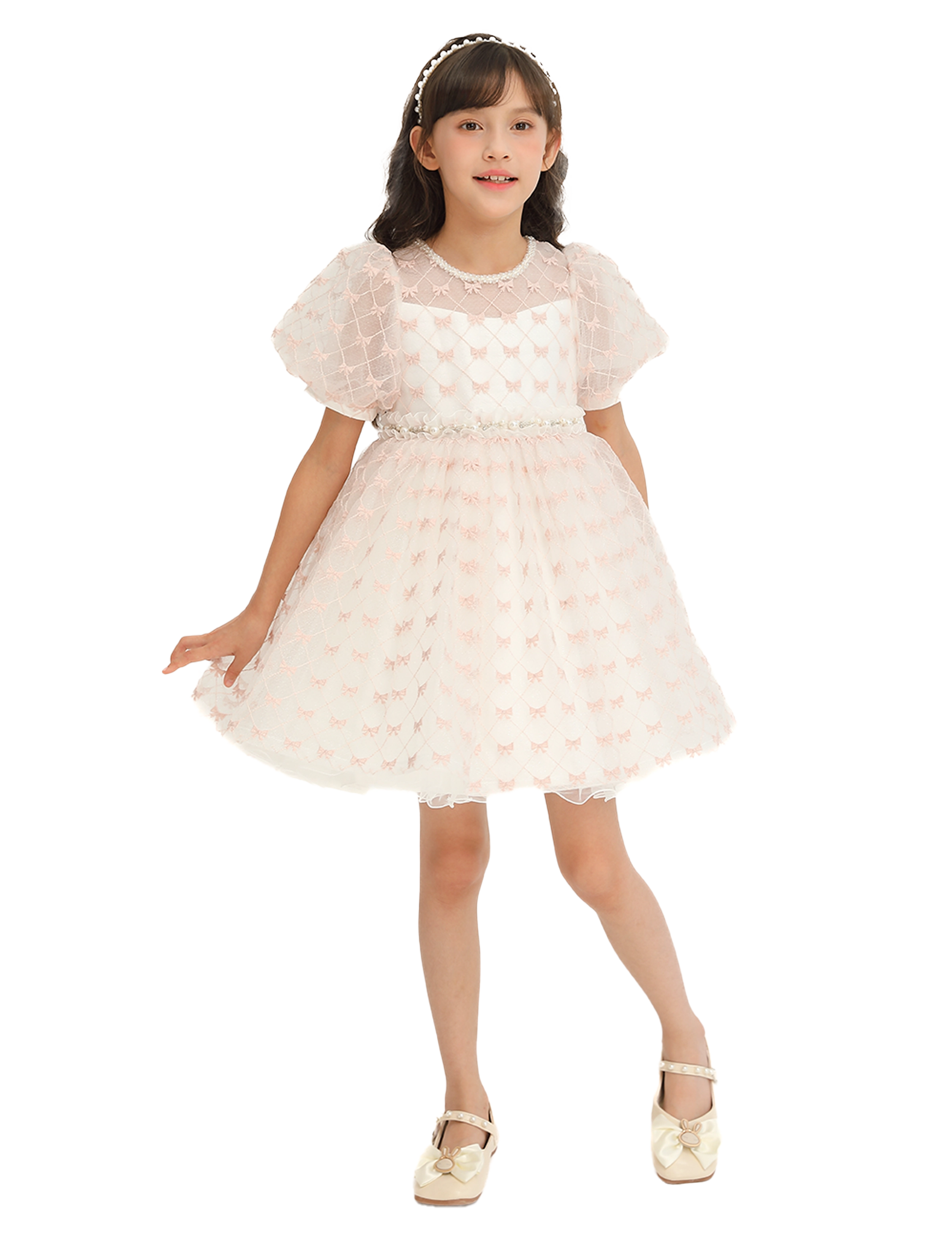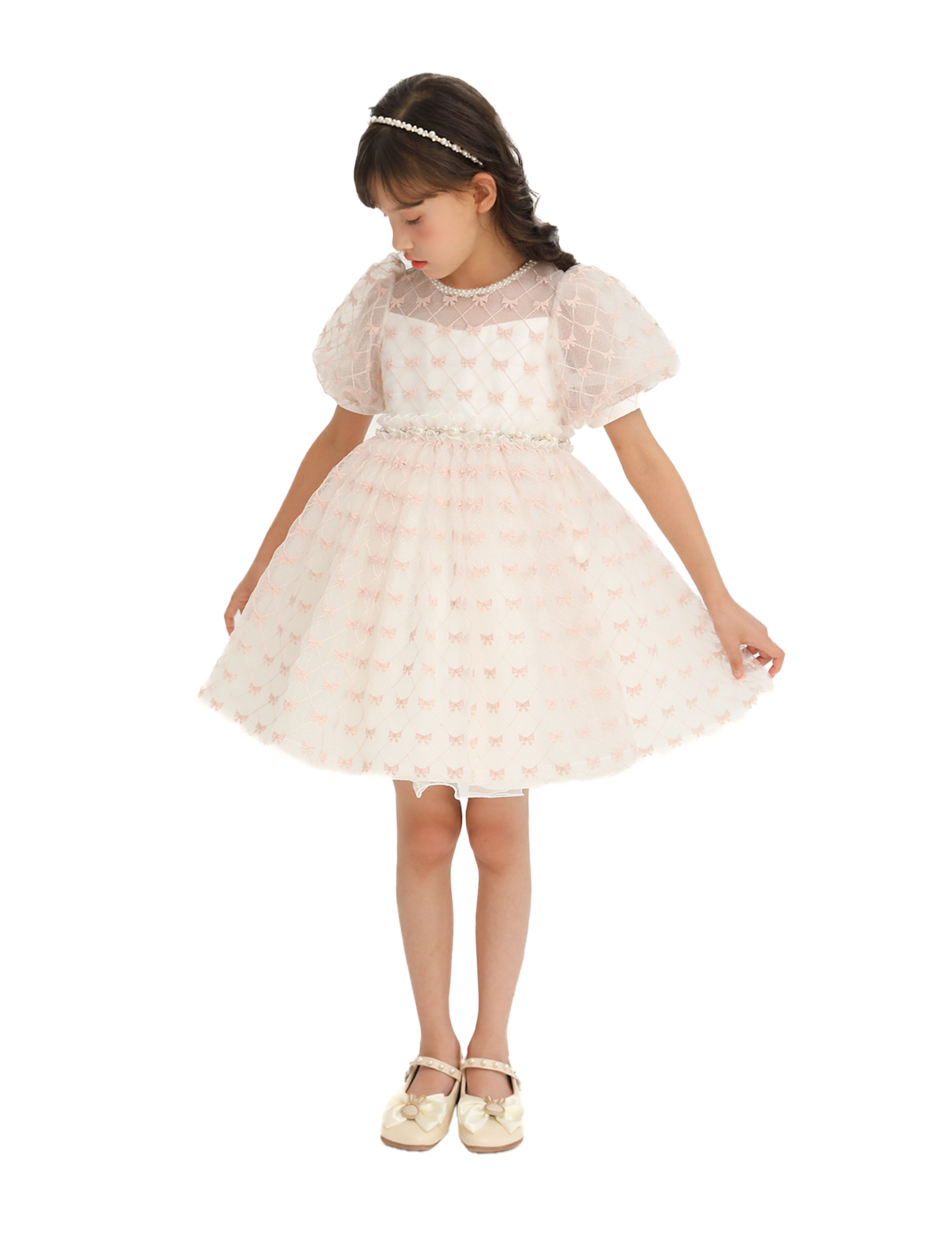 The layered tulle design creates a dreamy silhouette, making it perfect for special occasions where your little one wants to shine. The soft pink ribbons provide a subtle yet eye-catching detail, beautifully complementing the creamy ivory base.