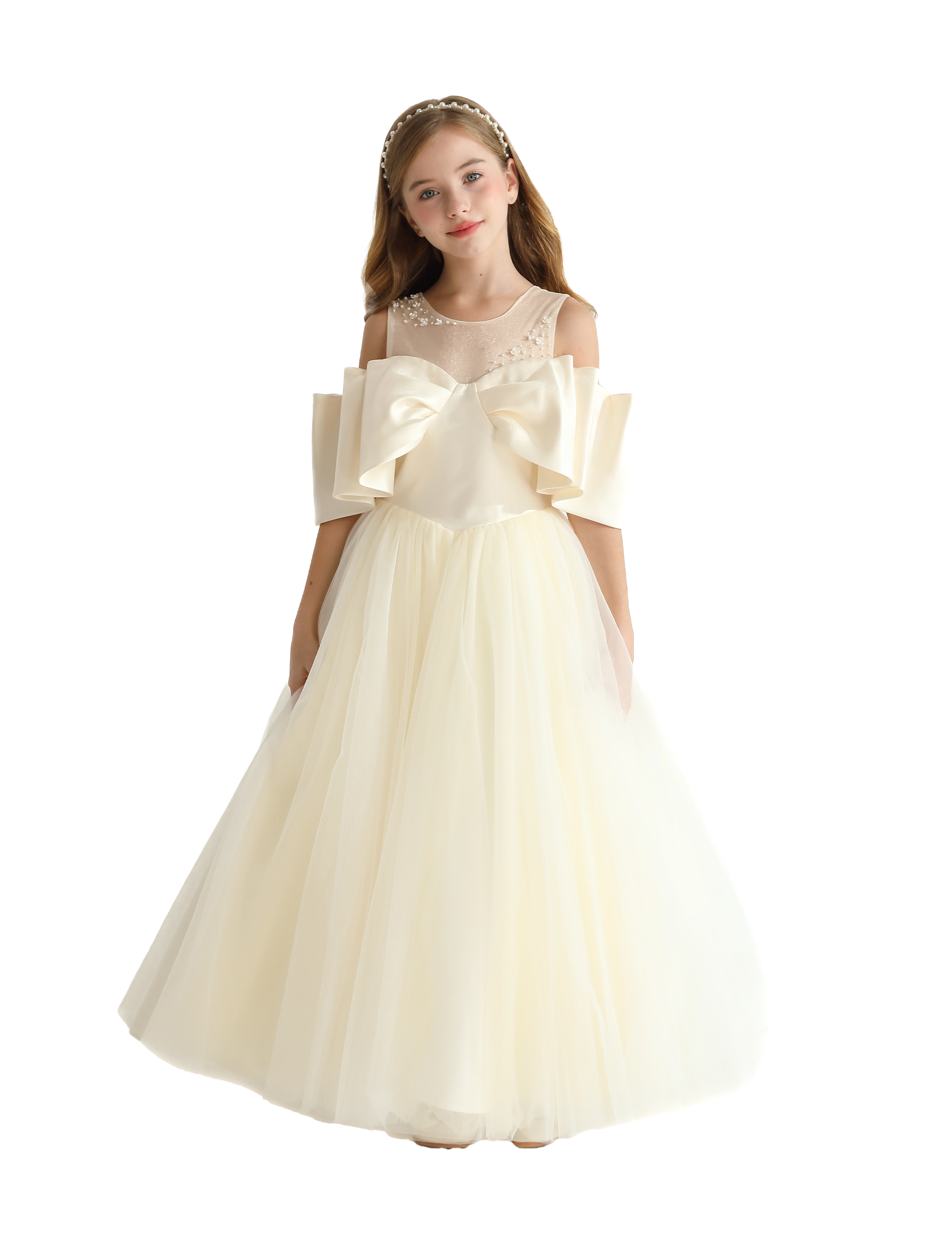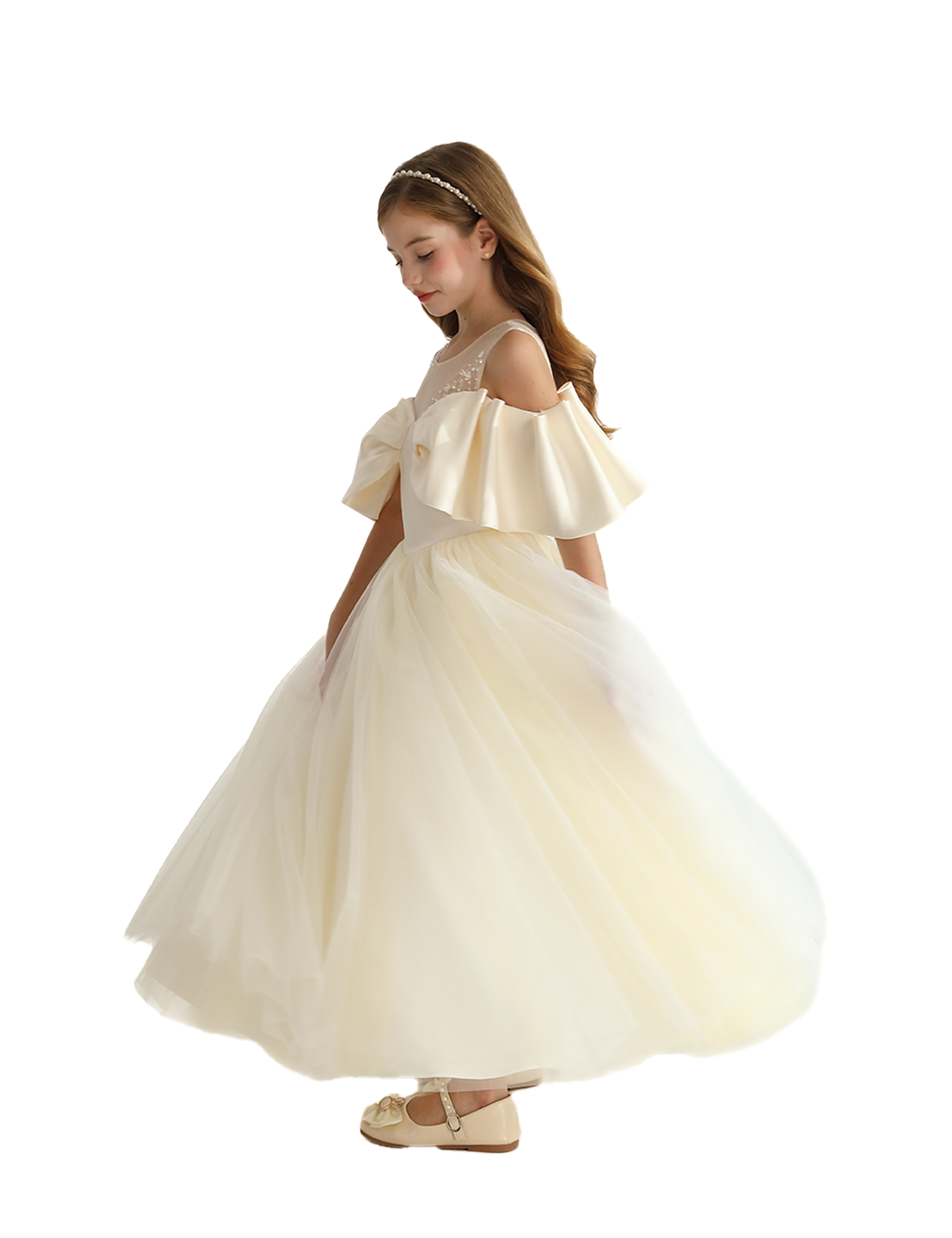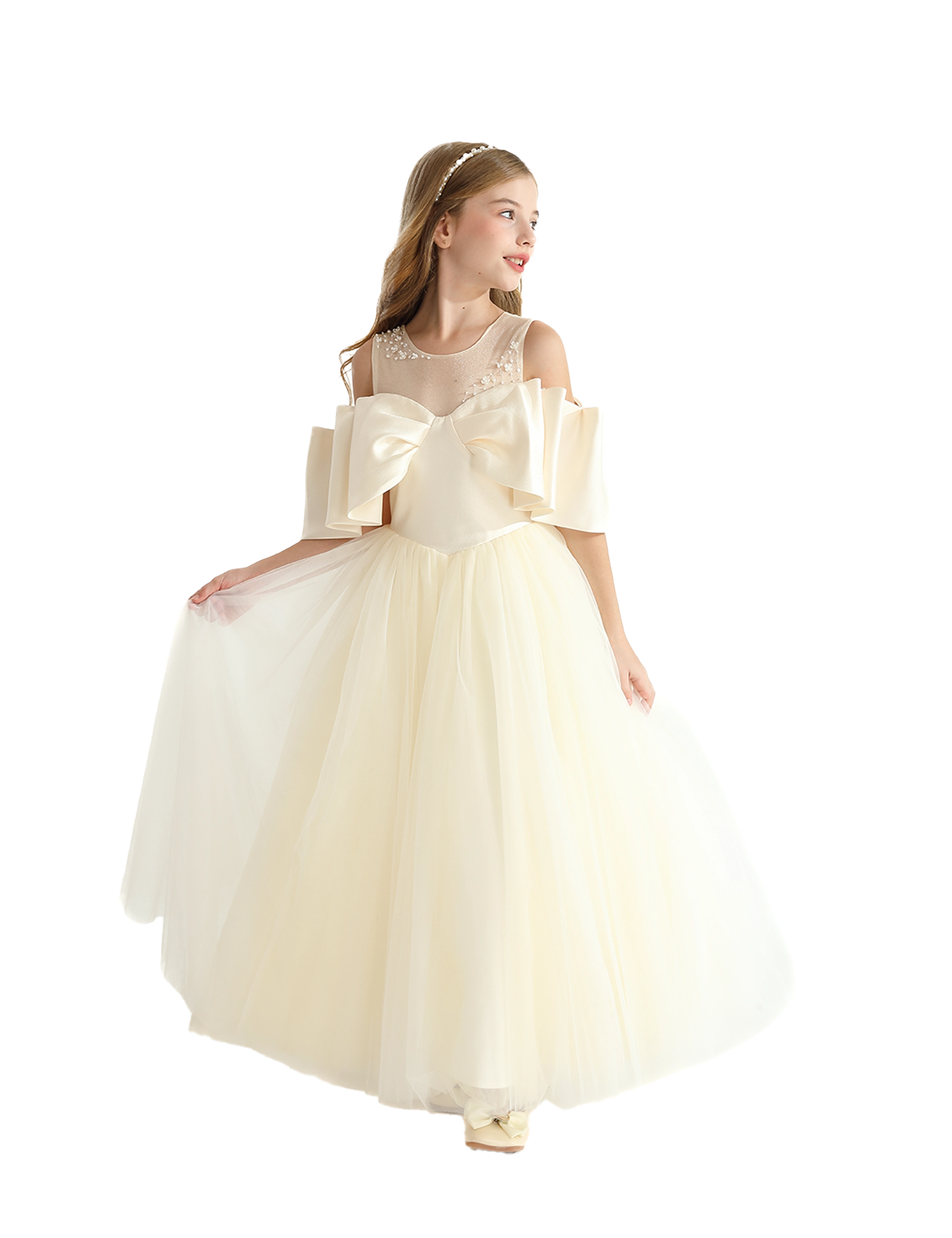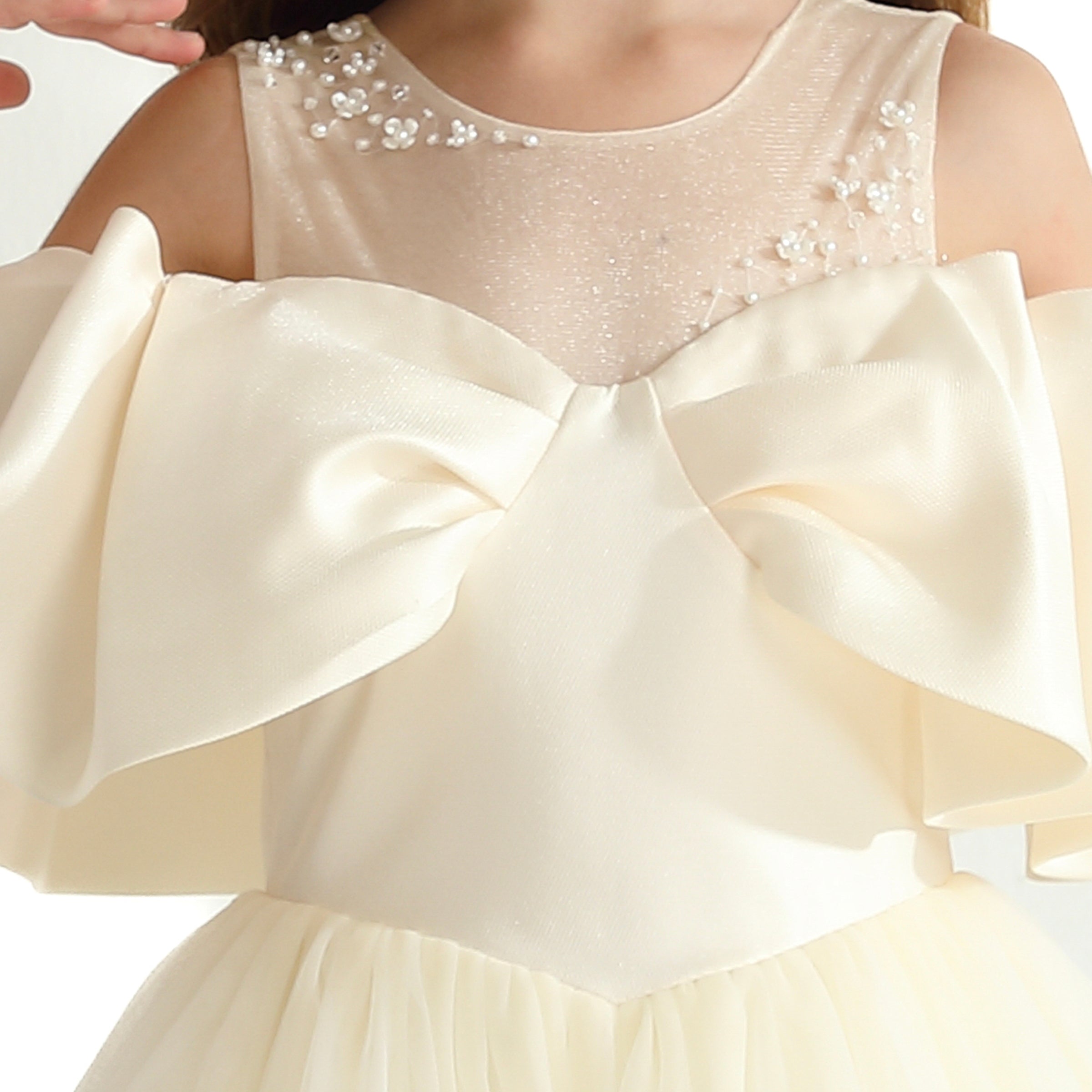 Perfect for special occasions or formal events, the Champagne Tulle Bow Amica Dress by Tulleen is a timeless choice that blends elegance with youthful beauty, making it a must-have addition to any wardrobe.