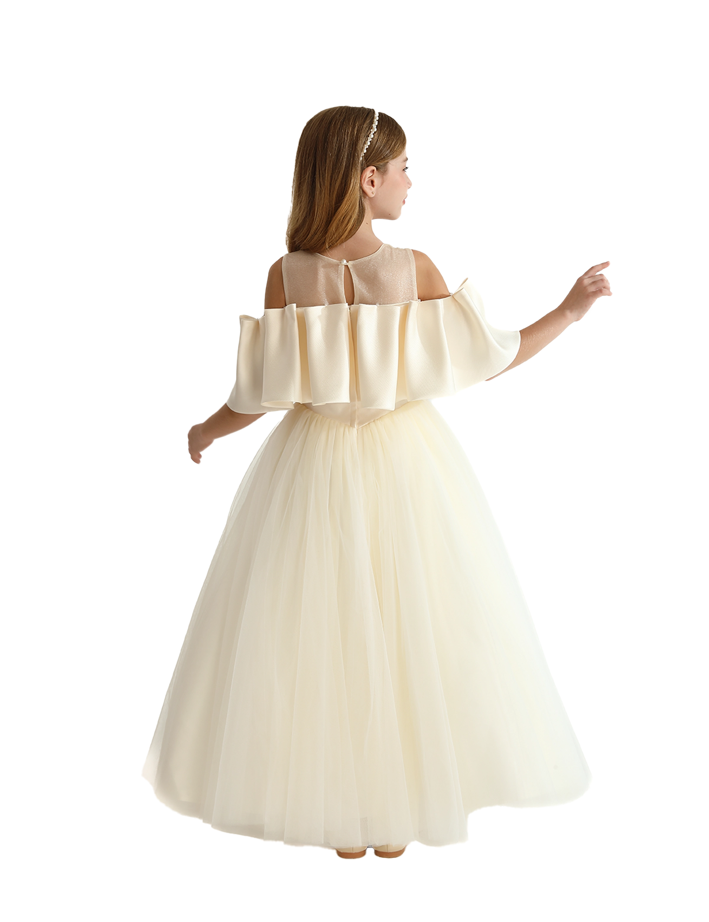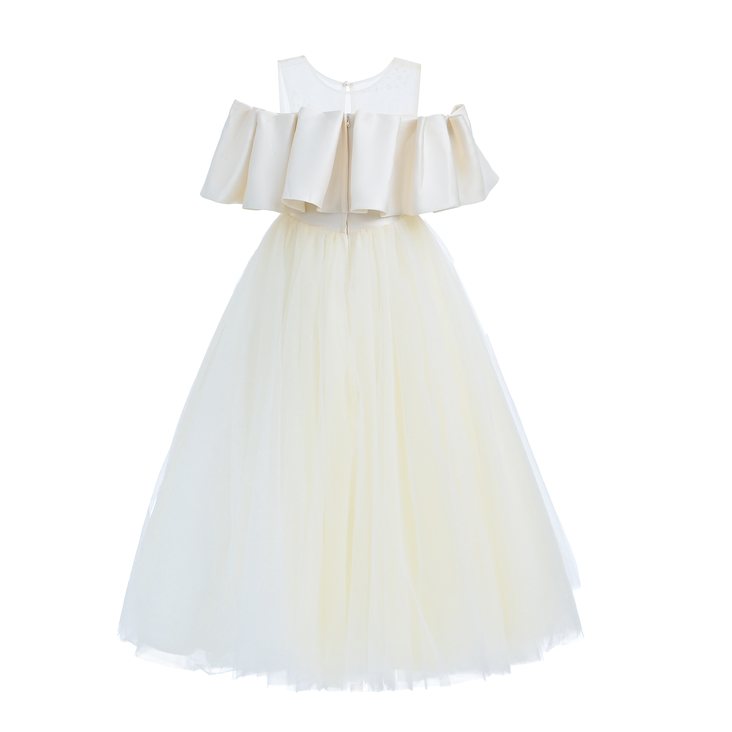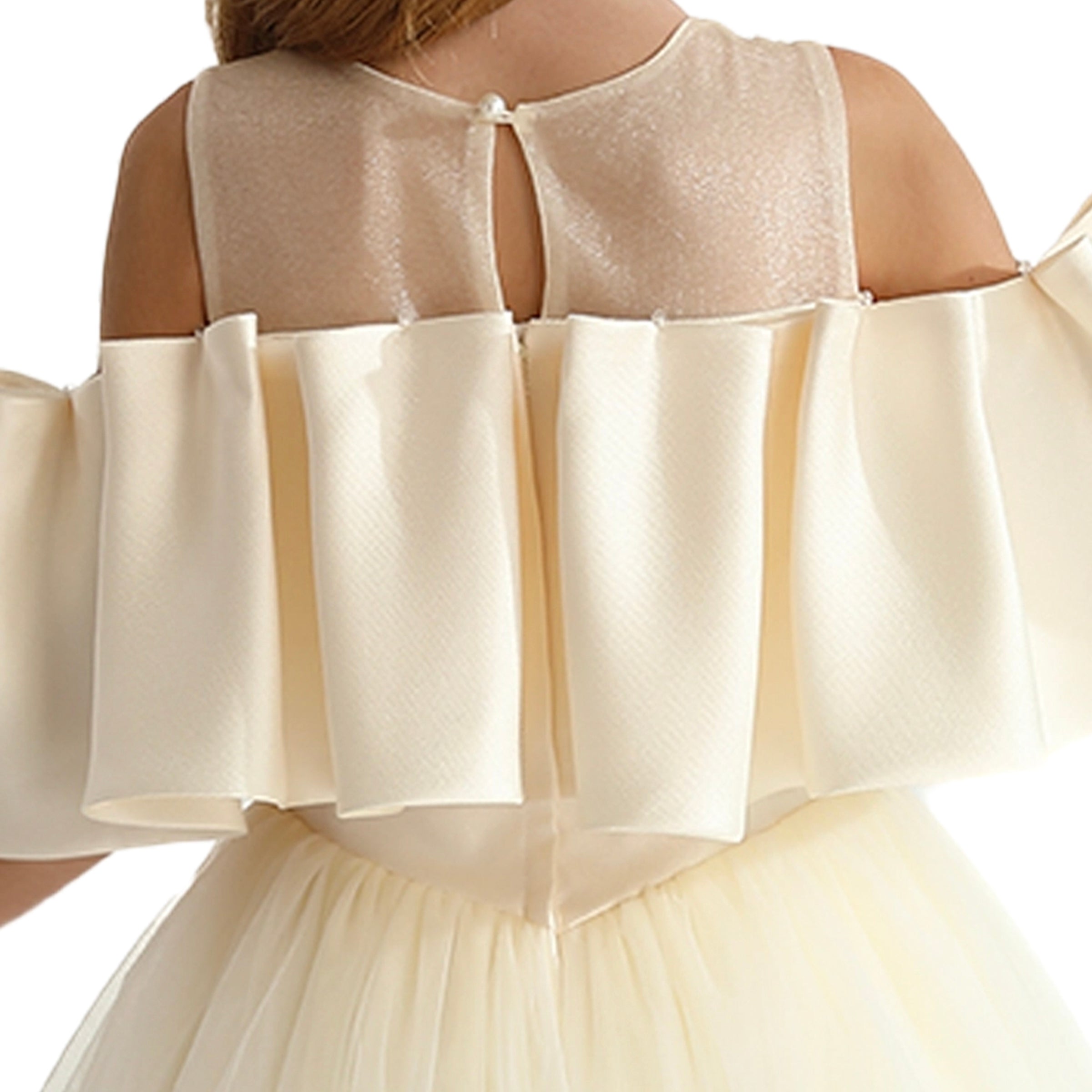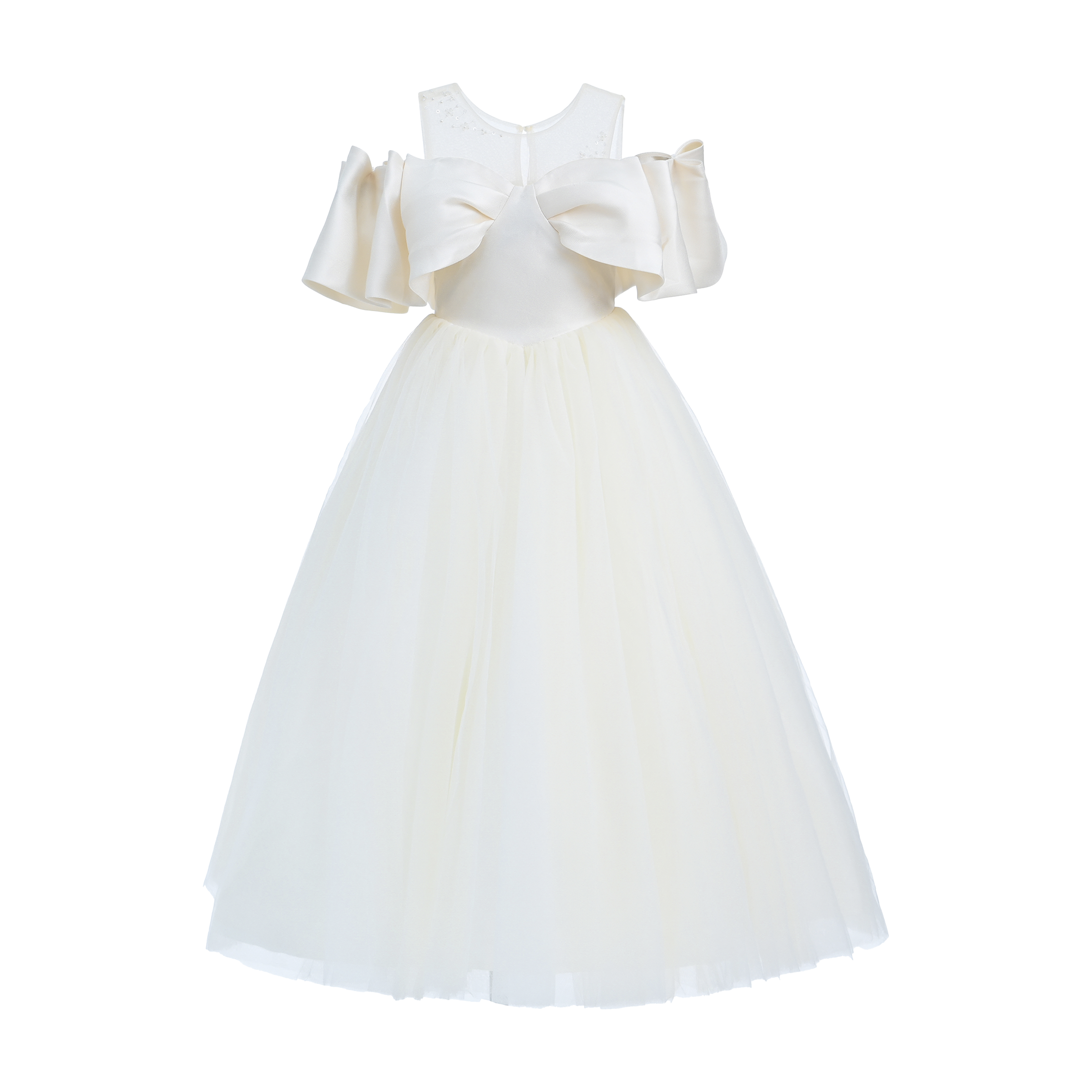 Perfect for special occasions or formal events, the Champagne Tulle Bow Amica Dress by Tulleen is a timeless choice that blends elegance with youthful beauty, making it a must-have addition to any wardrobe.
