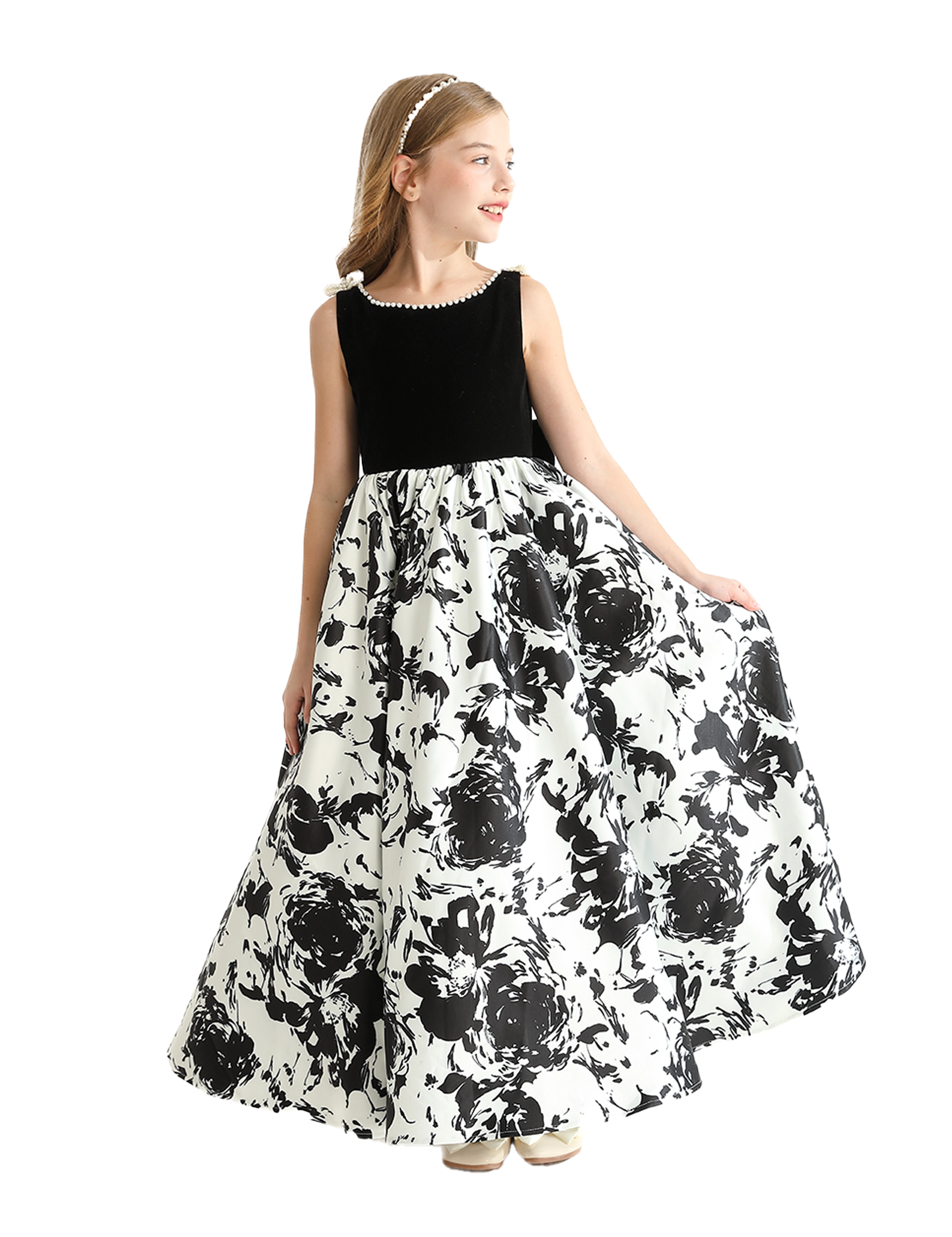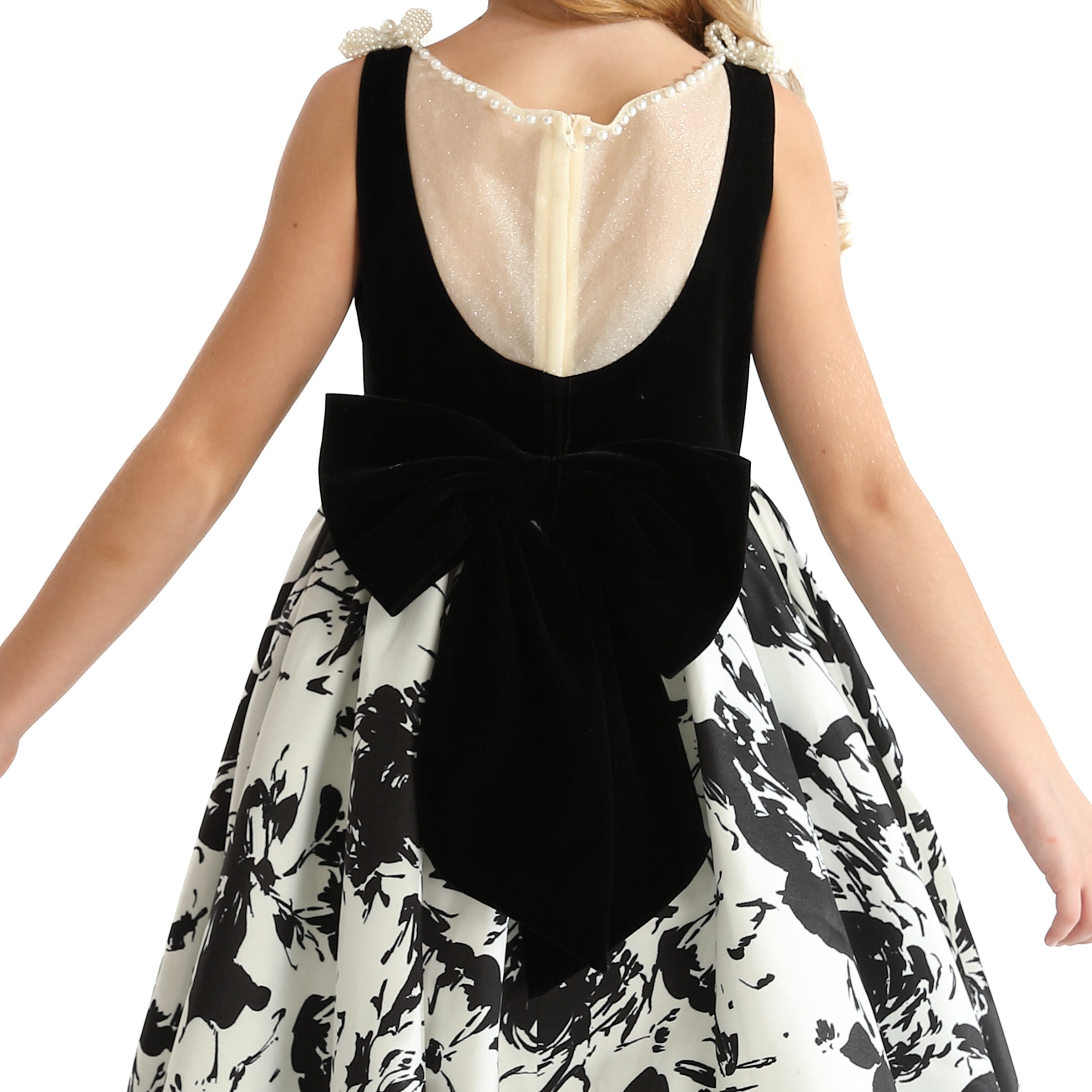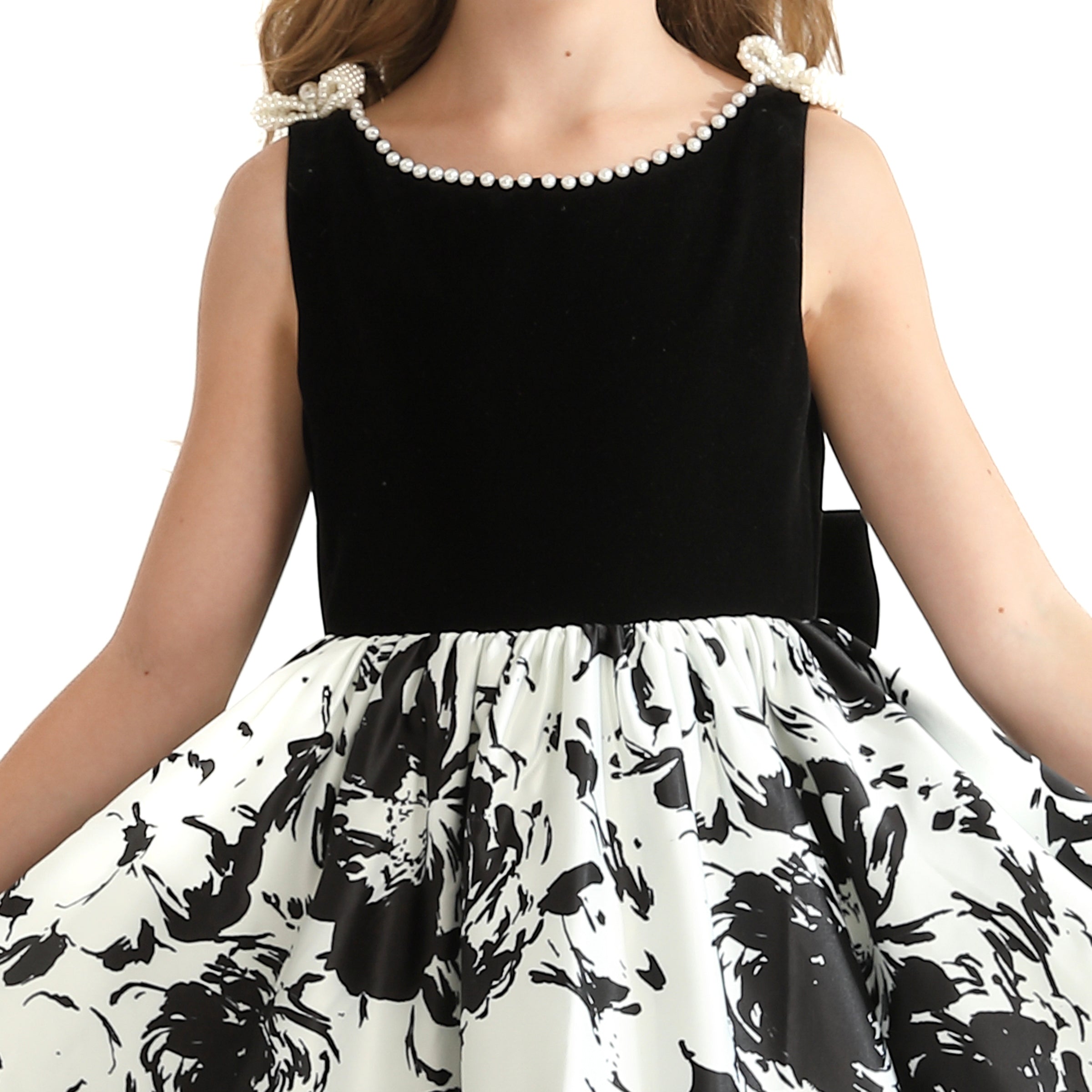 Introducing the captivating Black and White Abstract Dalmeny Dress by Tulleen, a striking piece designed to make a bold statement for young girls. This elegant dress features a timeless black and white color palette, enhanced by an abstract modern art-inspired silhouette that exudes creativity and flair.