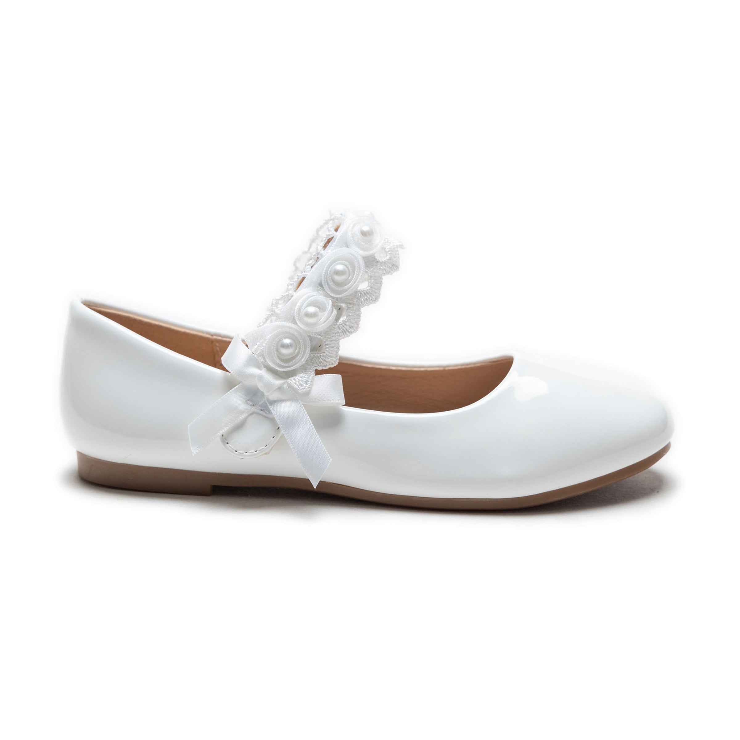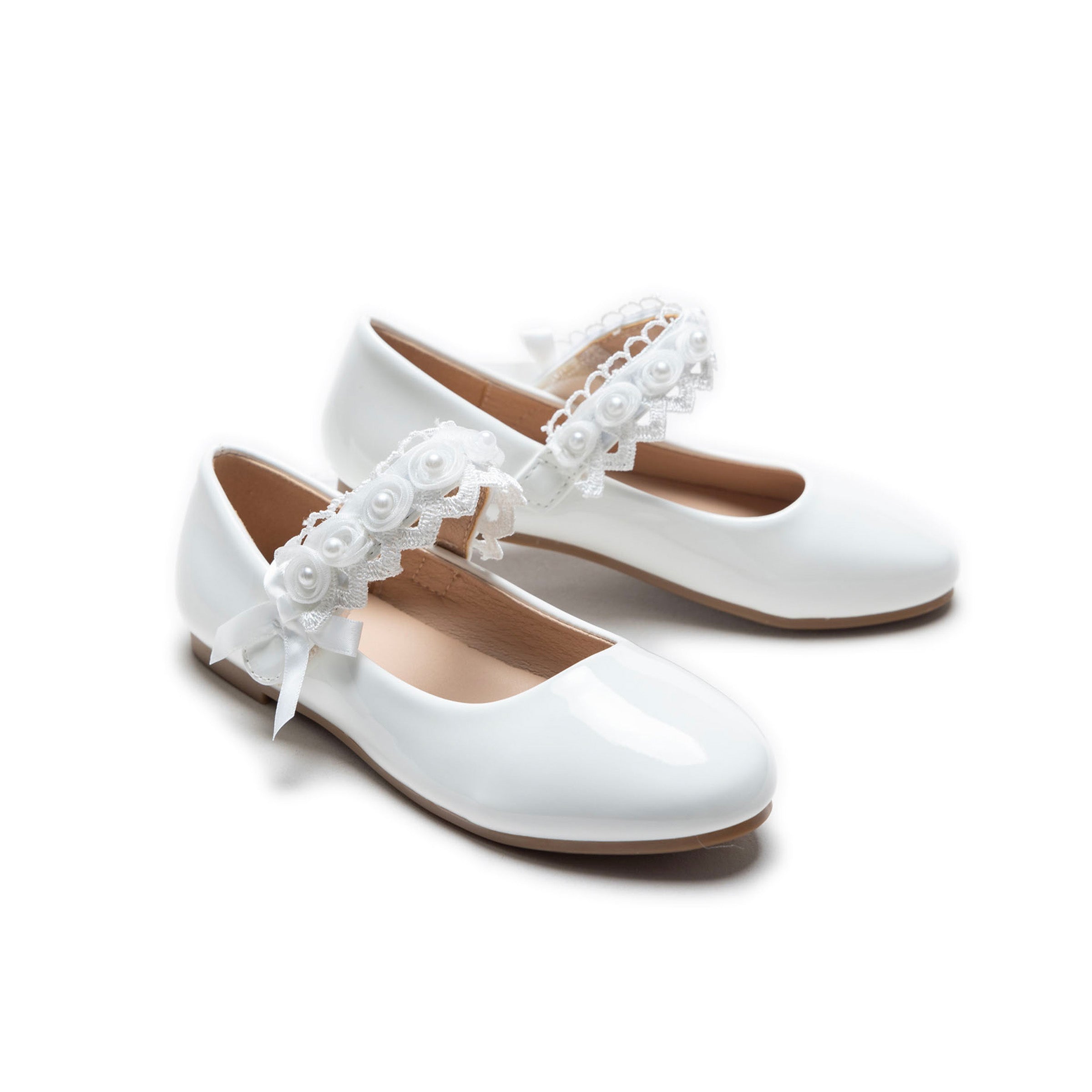 The White Patent Rose Pearl Doily Flats by Tulleen are crafted for both style and comfort, offering a chic yet practical choice for young girls. Whether it's for a party or a casual outing, these flats are a versatile addition to any wardrobe, combining sophistication with playful charm.
