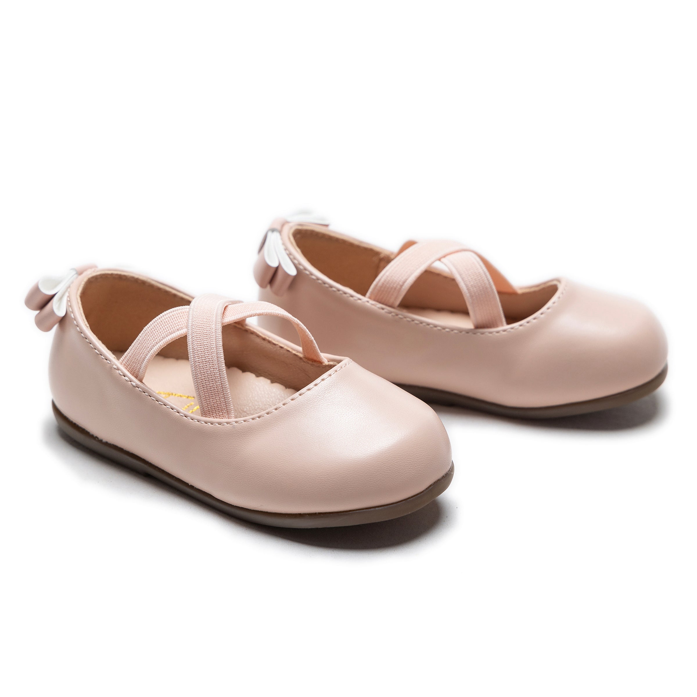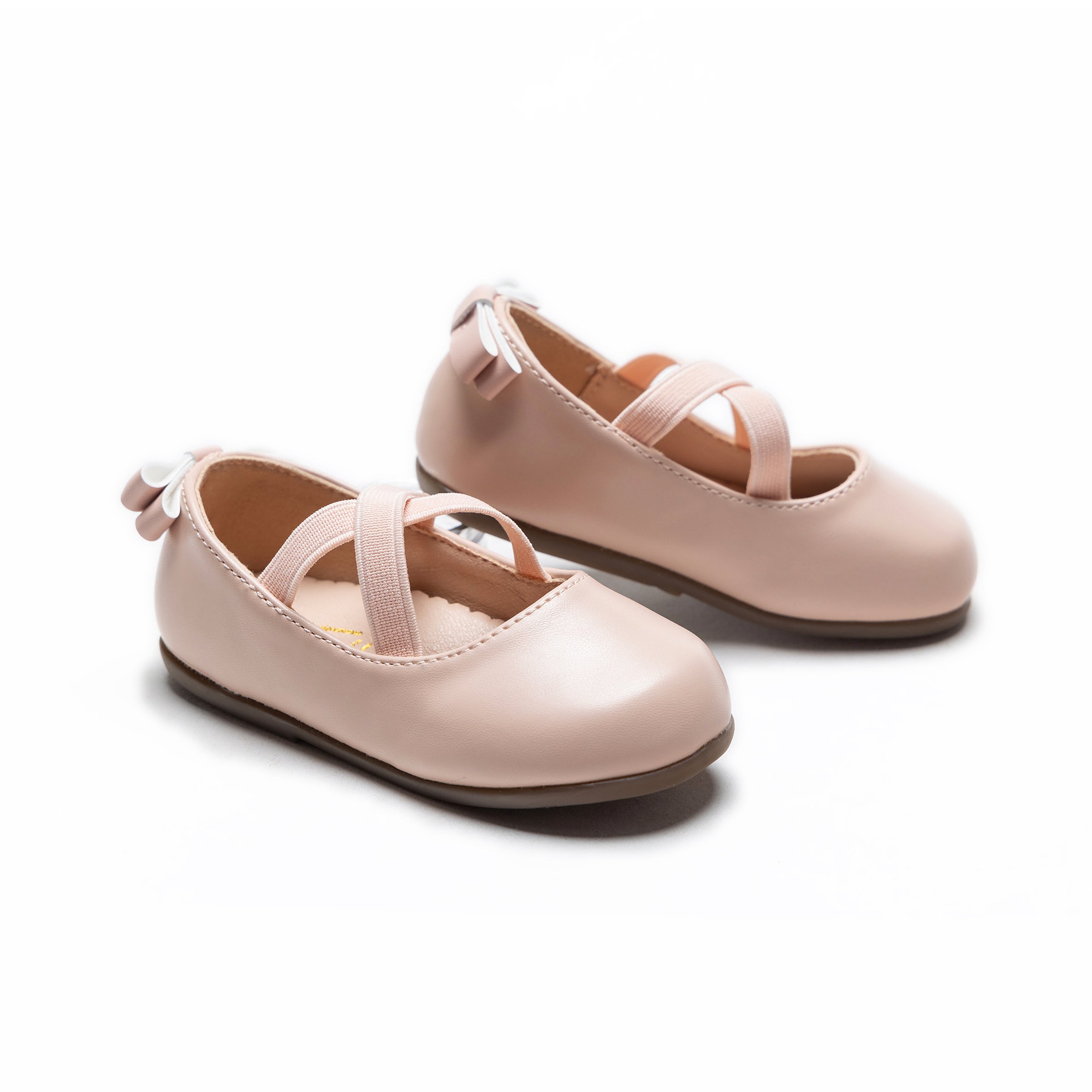 The cross band design across the front creates a stylish, modern feel, while a delightful bow at the back of the heel adds a sweet, feminine accent. These flats offer both a fashionable and comfortable option for young girls who want to step out in style.